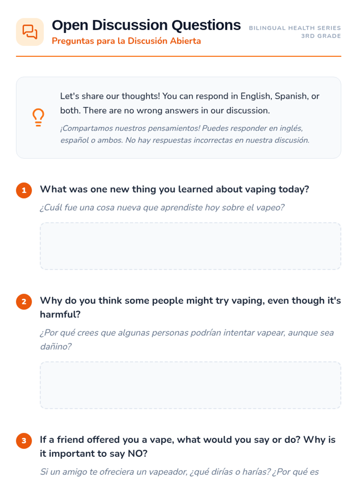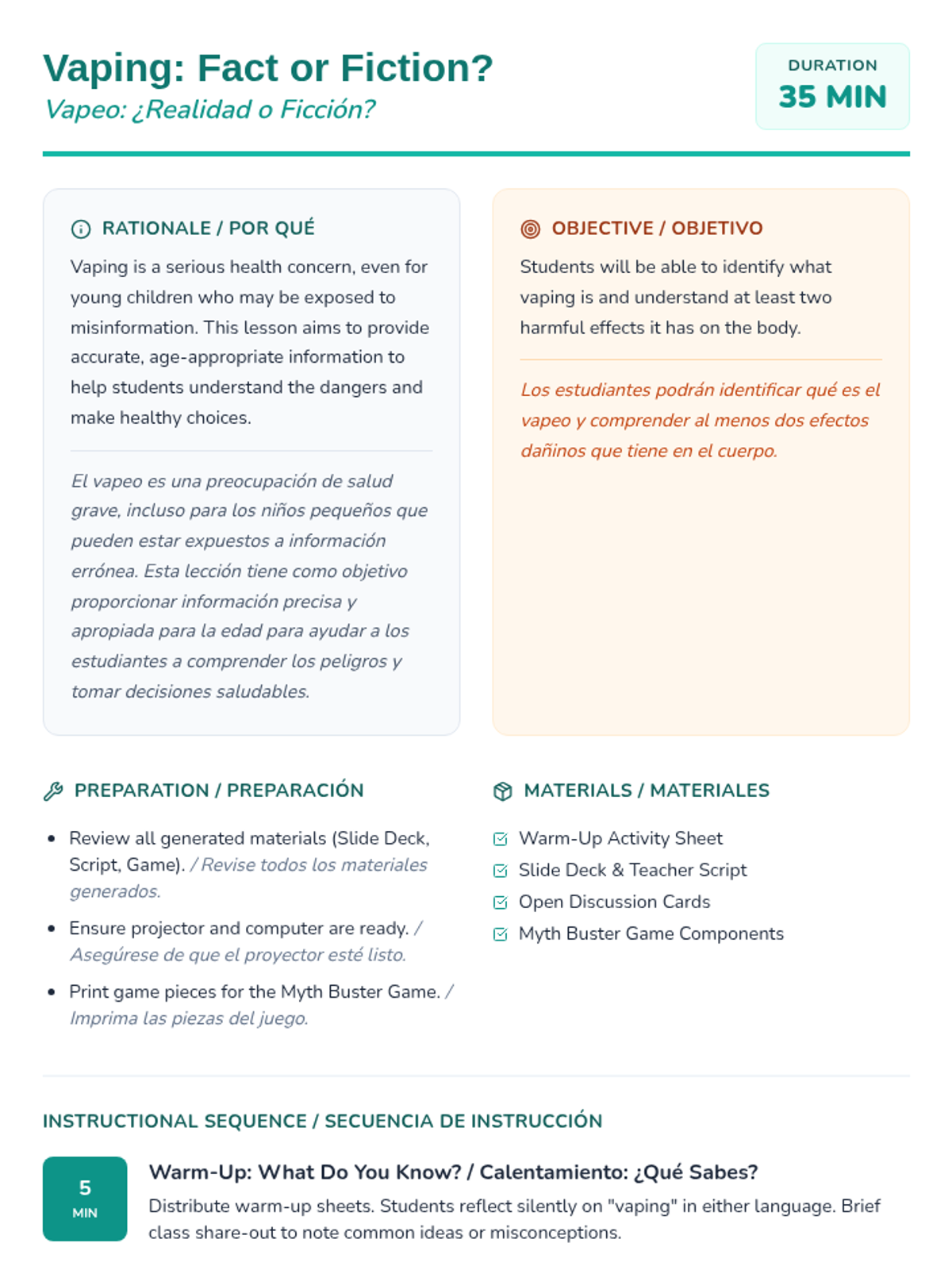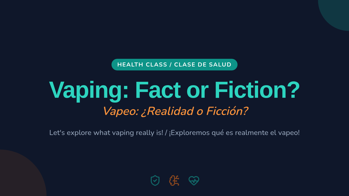 An interactive 35-minute bilingual health lesson for 3rd graders exploring the truth about vaping and its effects on the body. Students will identify harmful chemicals and understand the impact on lungs and brain development.