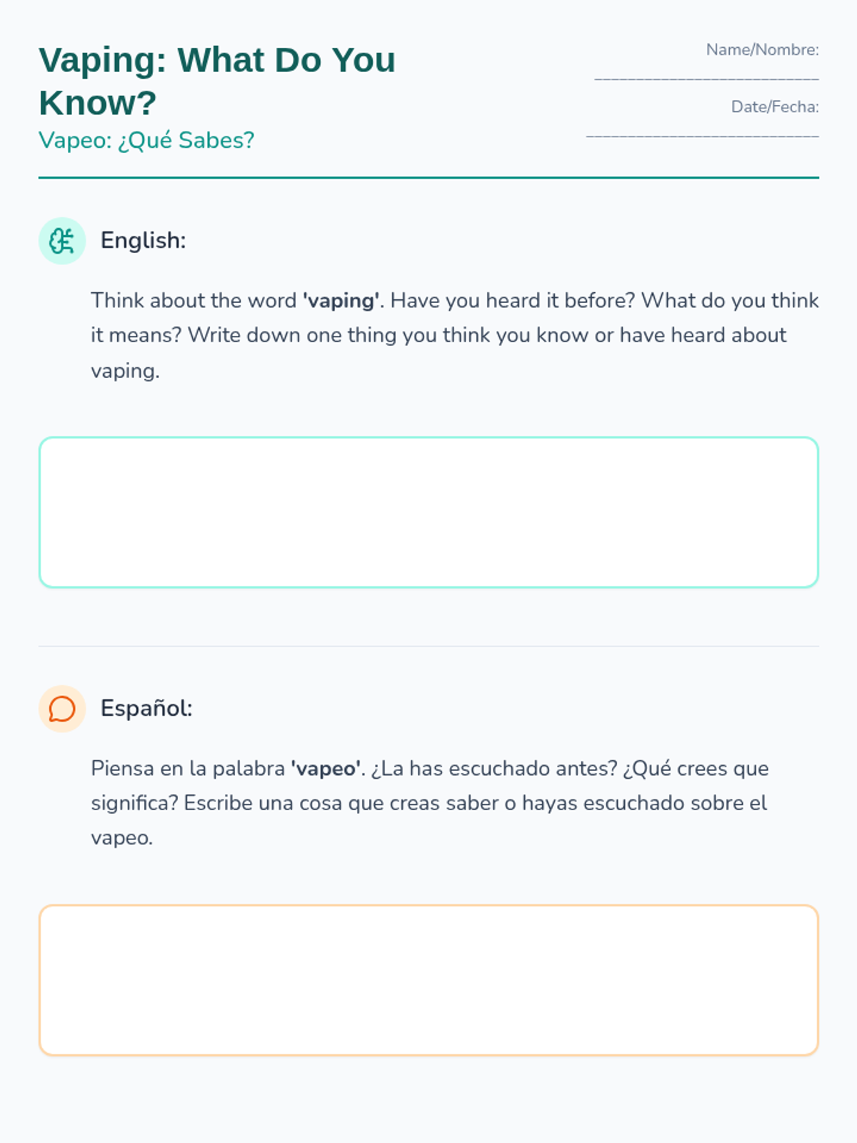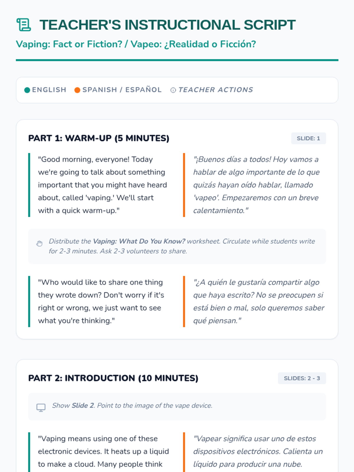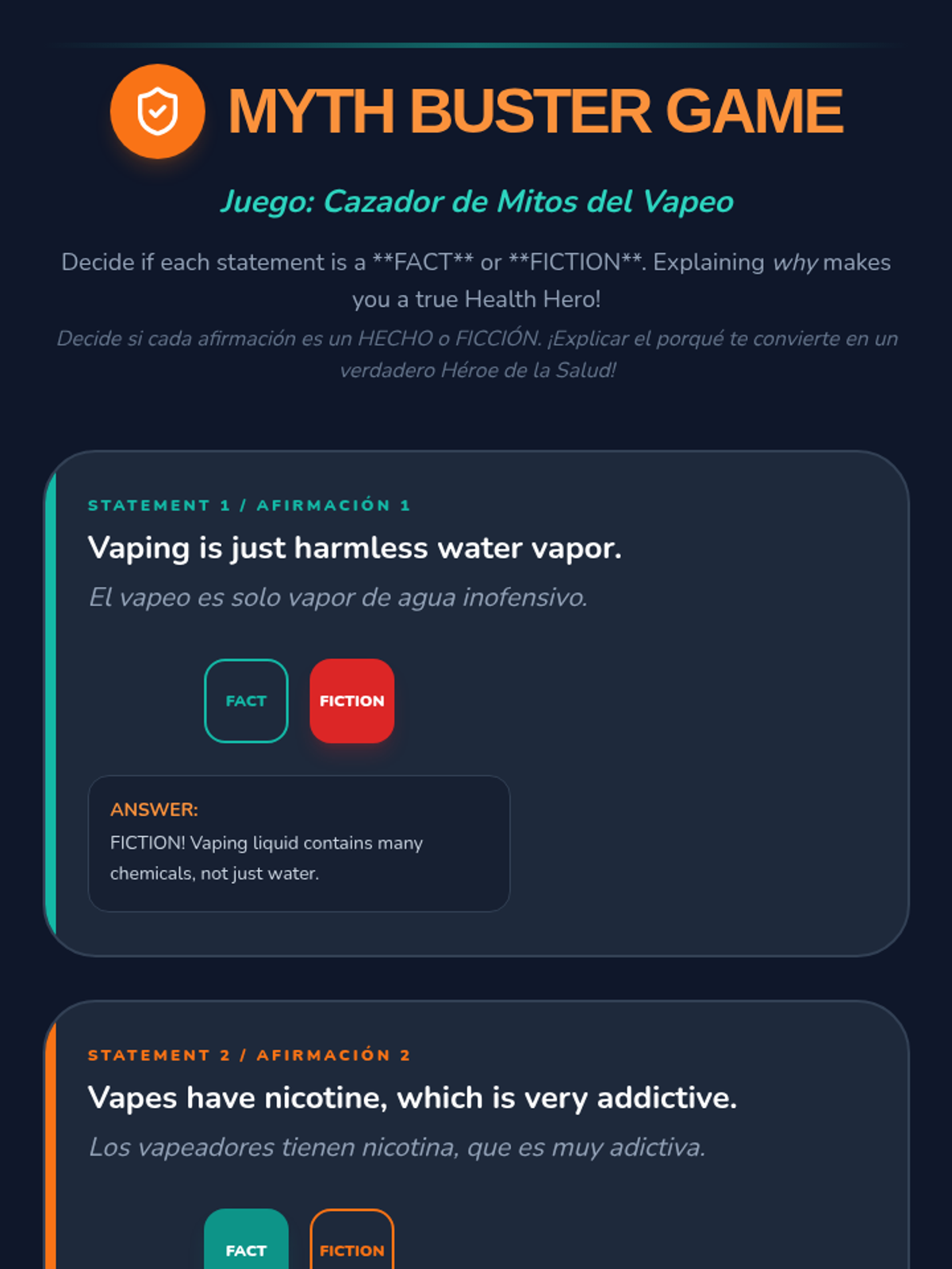 An interactive 35-minute bilingual health lesson for 3rd graders exploring the truth about vaping and its effects on the body. Students will identify harmful chemicals and understand the impact on lungs and brain development.