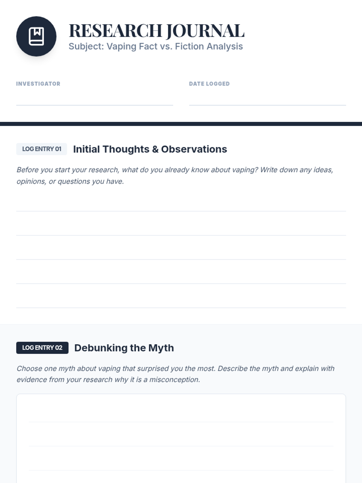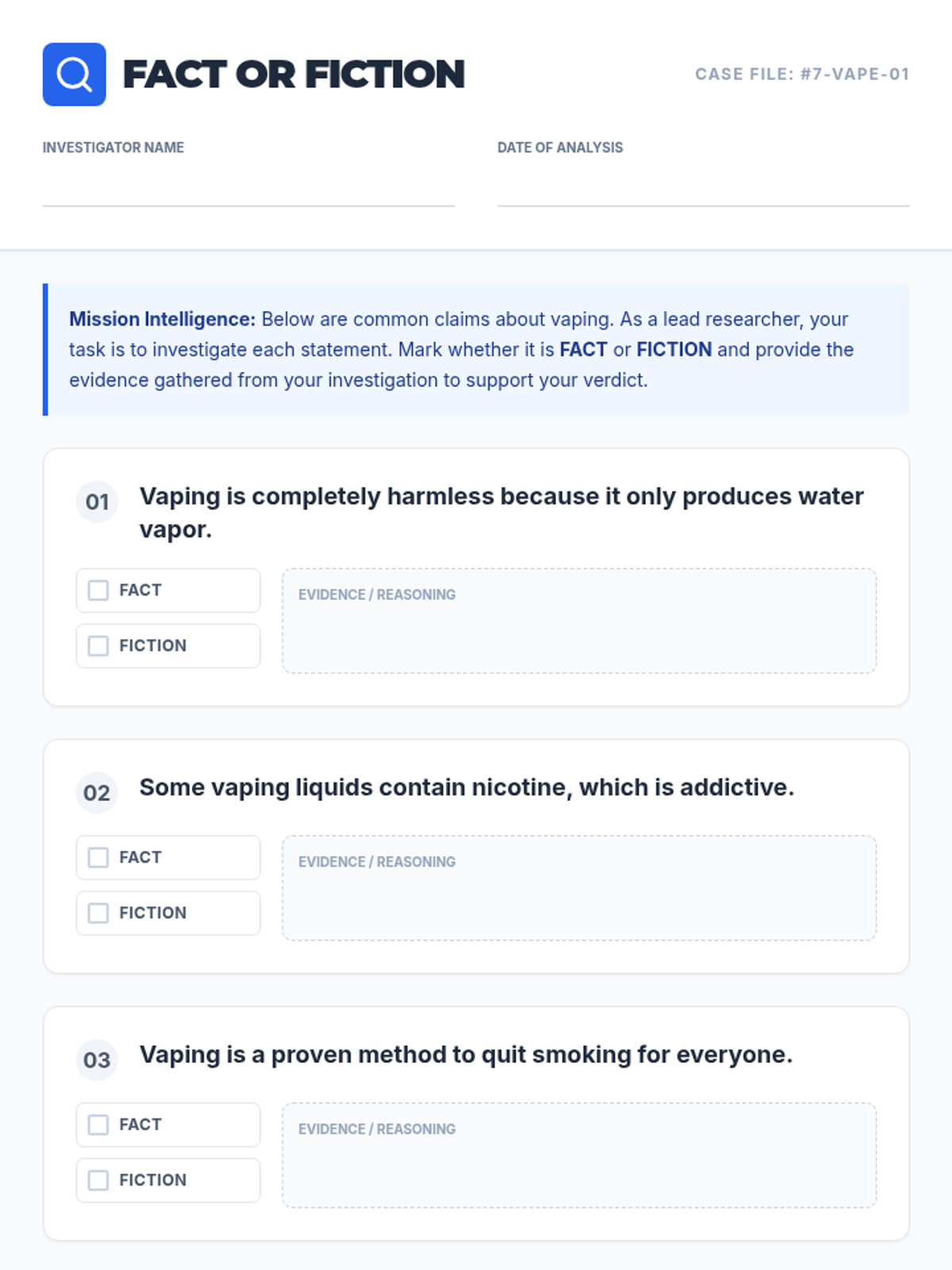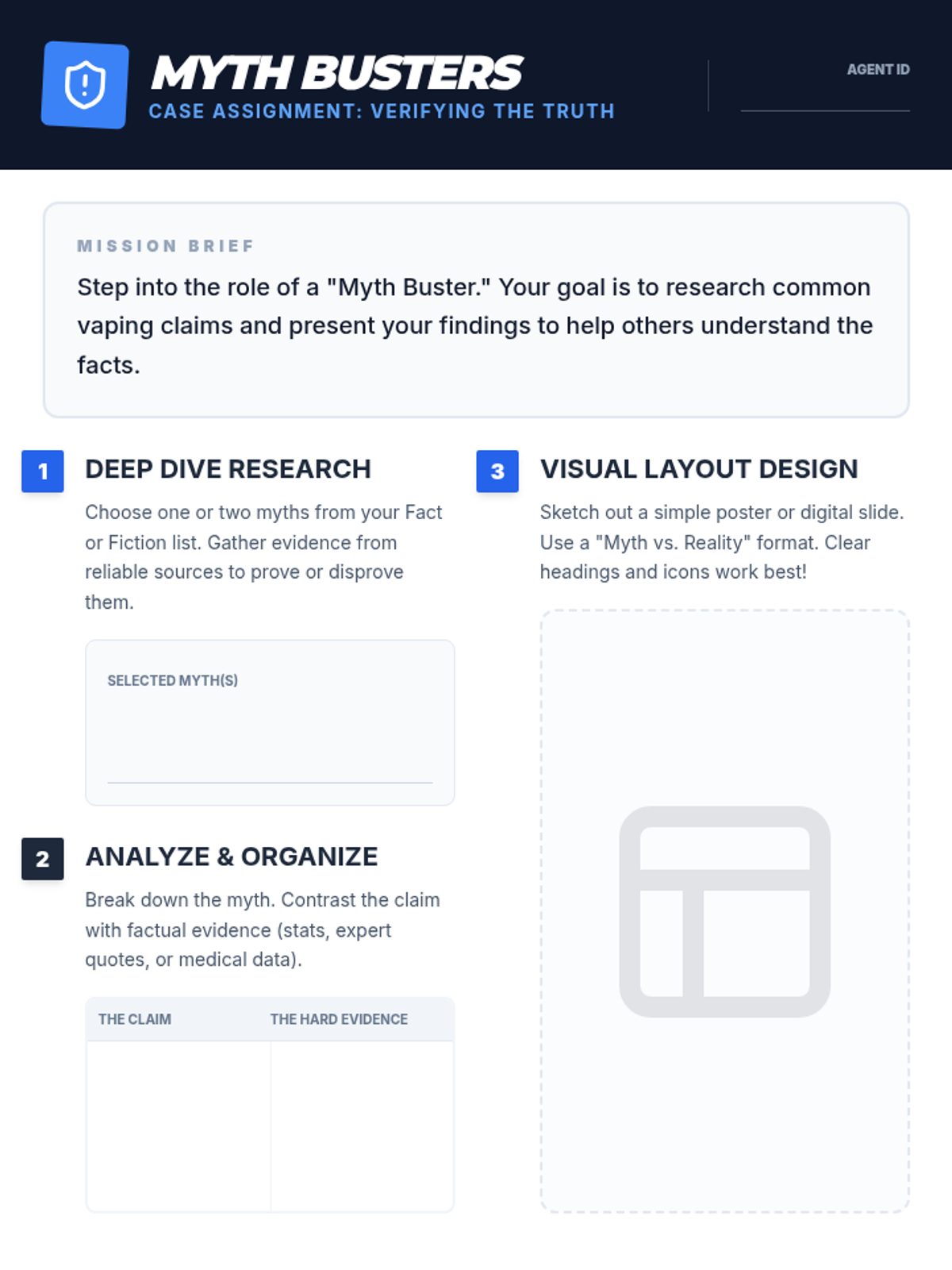 An investigative lesson exploring the myths and facts surrounding vaping, alcohol, and drug use to help students make informed, healthy choices.
