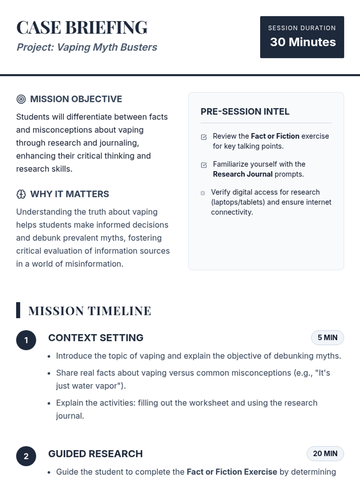 A 30-minute Tier 3 intervention focused on debunking common myths about vaping through guided research and critical evaluation for a 7th-grade student.