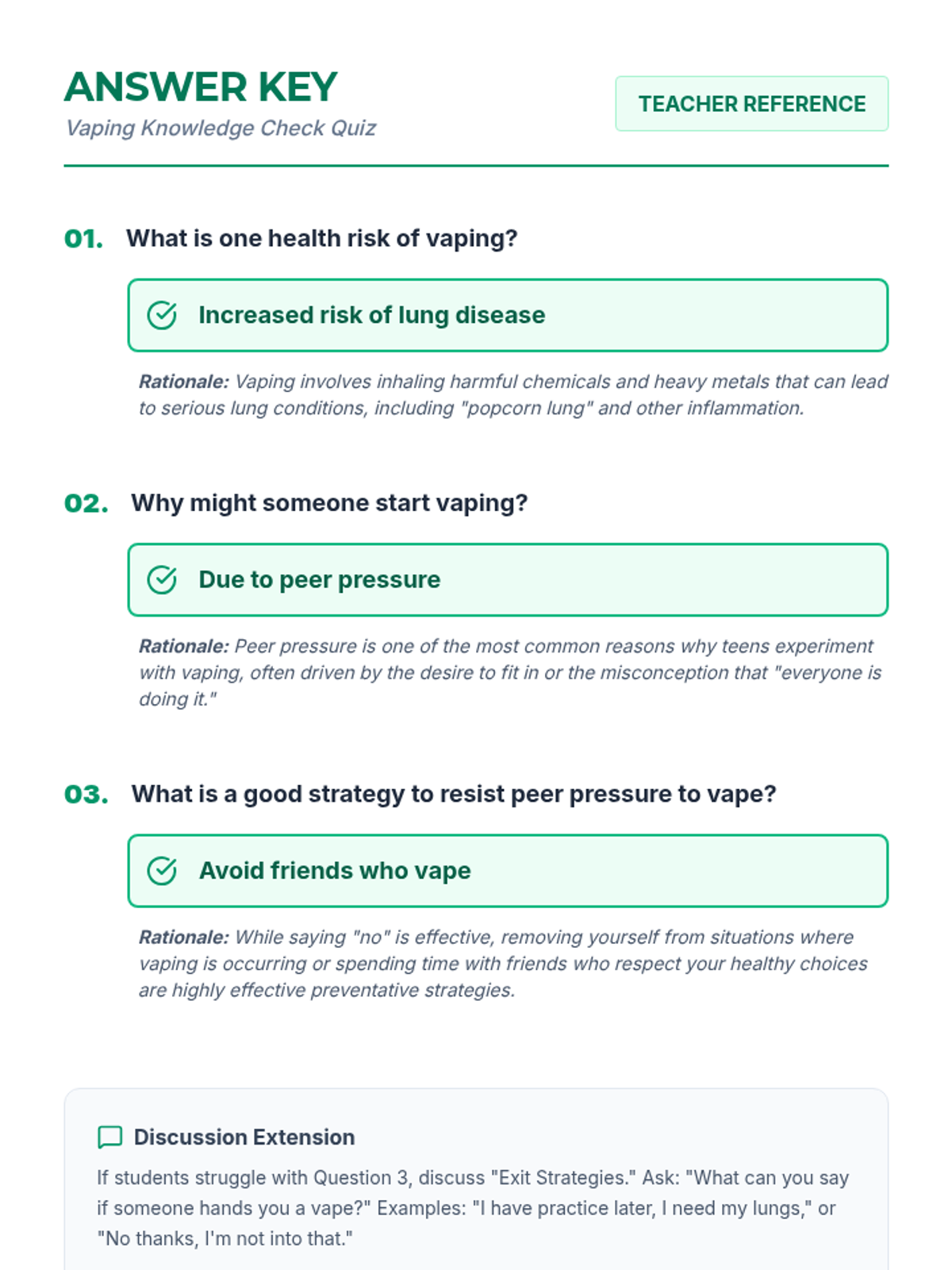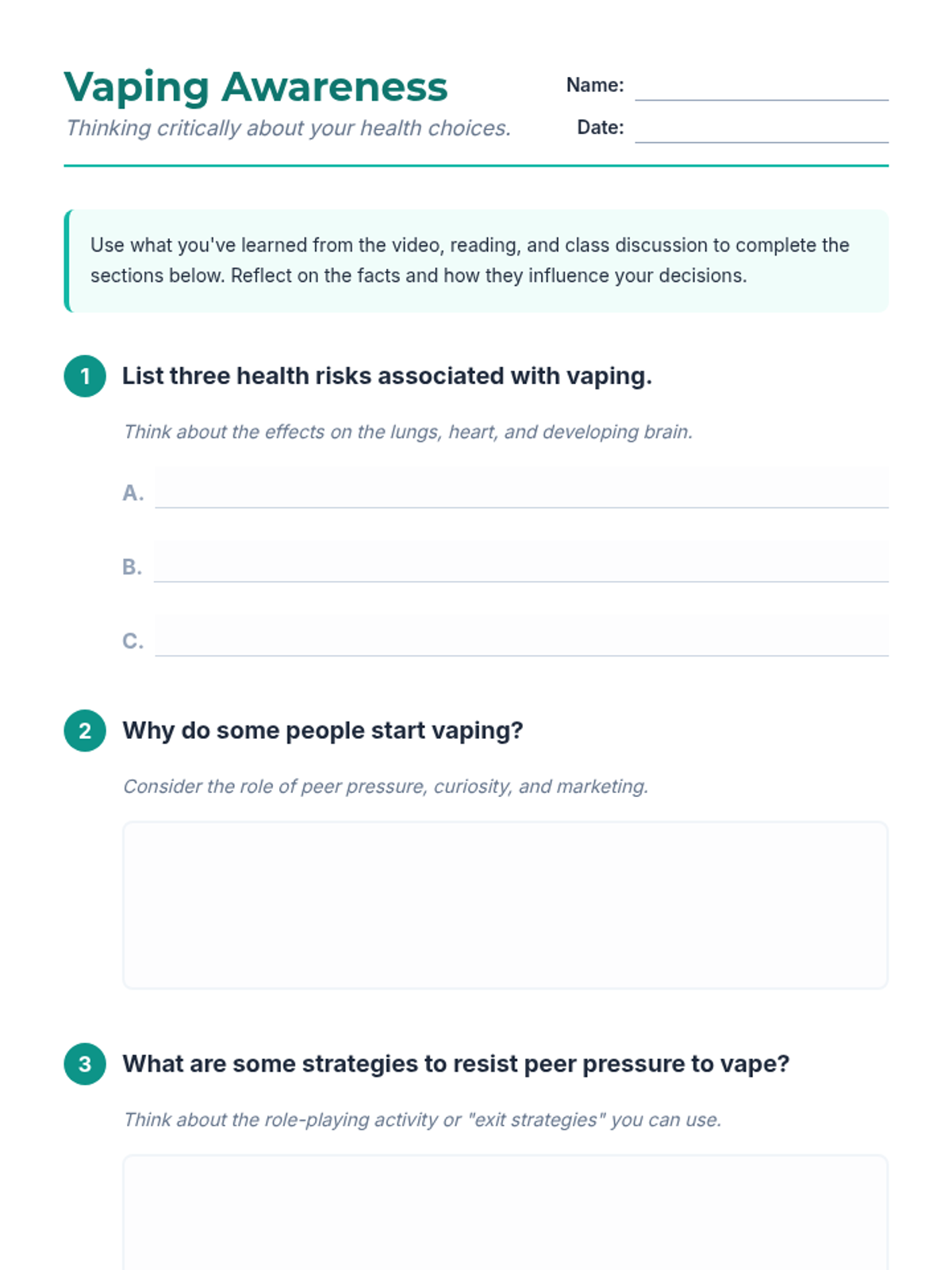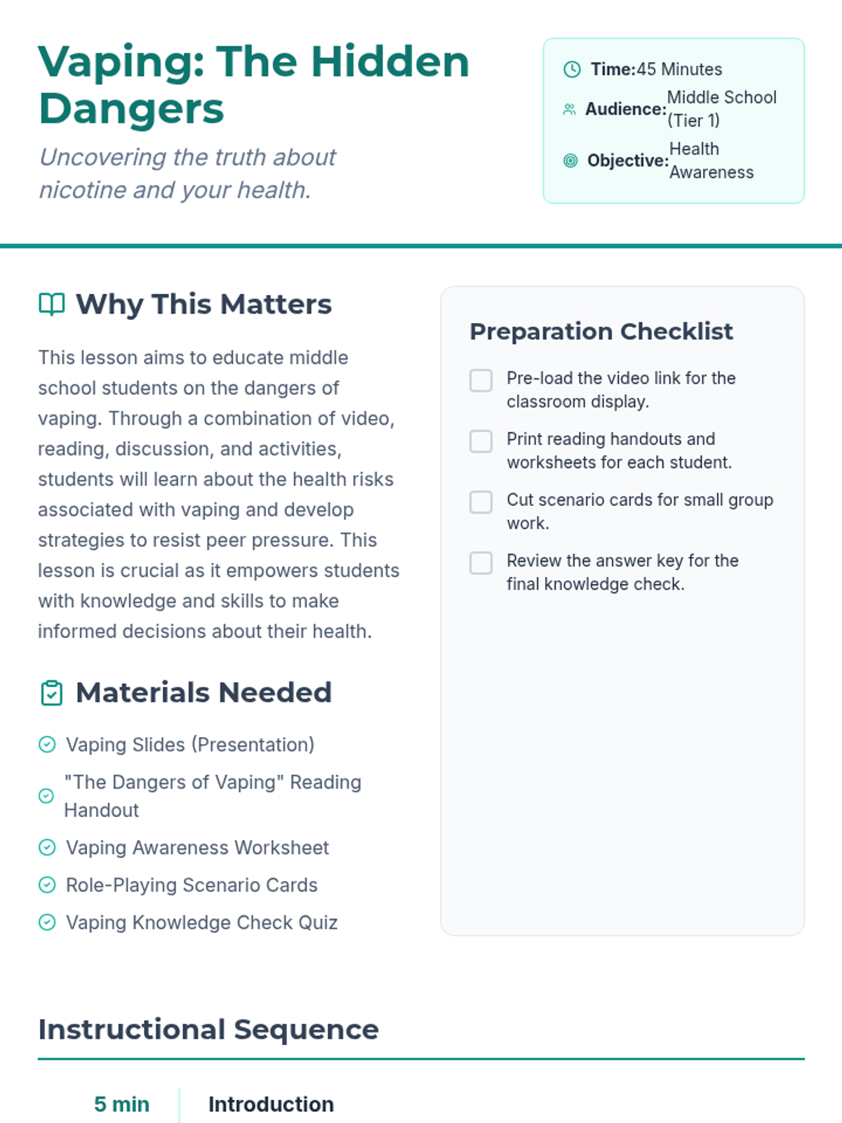 A comprehensive 45-minute lesson for middle schoolers exploring the physiological and social dangers of vaping, including peer pressure resistance strategies.