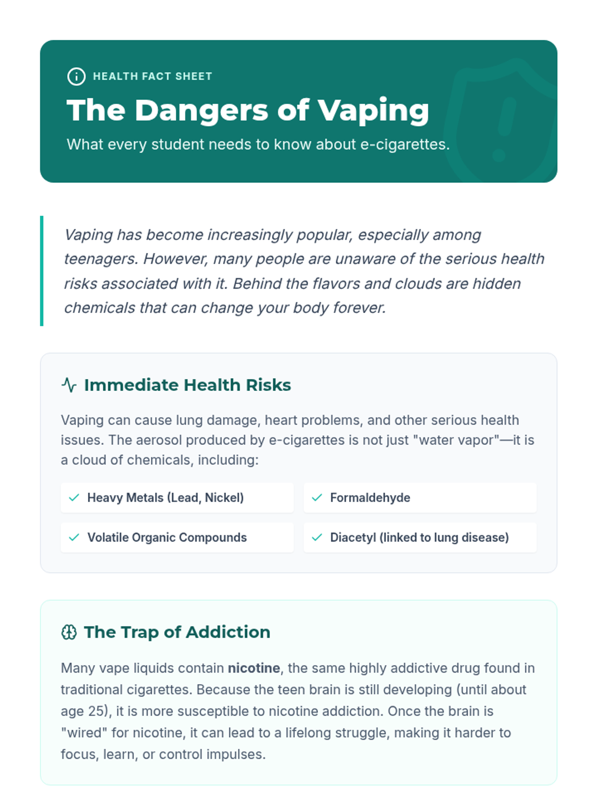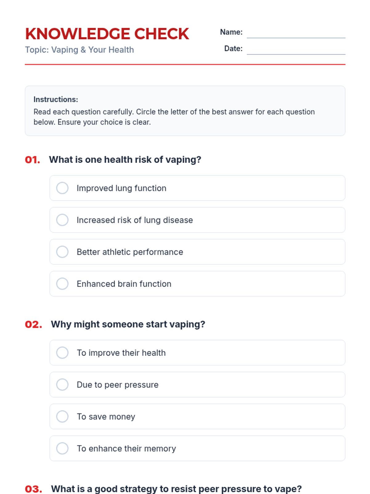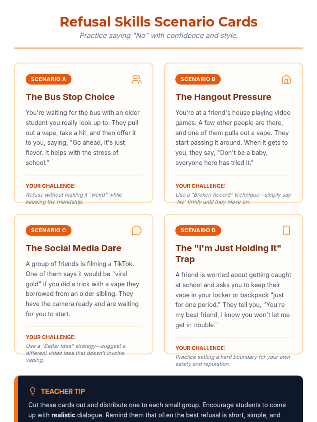 A comprehensive 45-minute lesson for middle schoolers exploring the physiological and social dangers of vaping, including peer pressure resistance strategies.