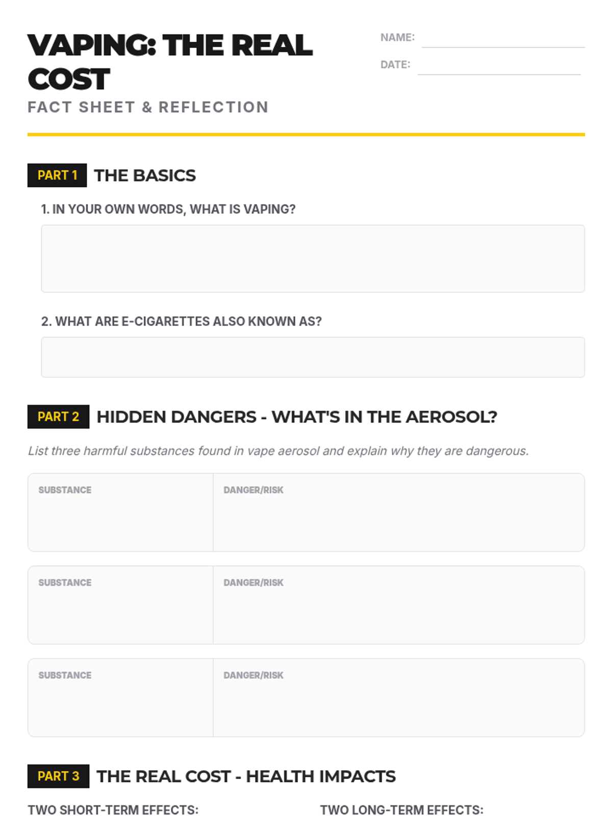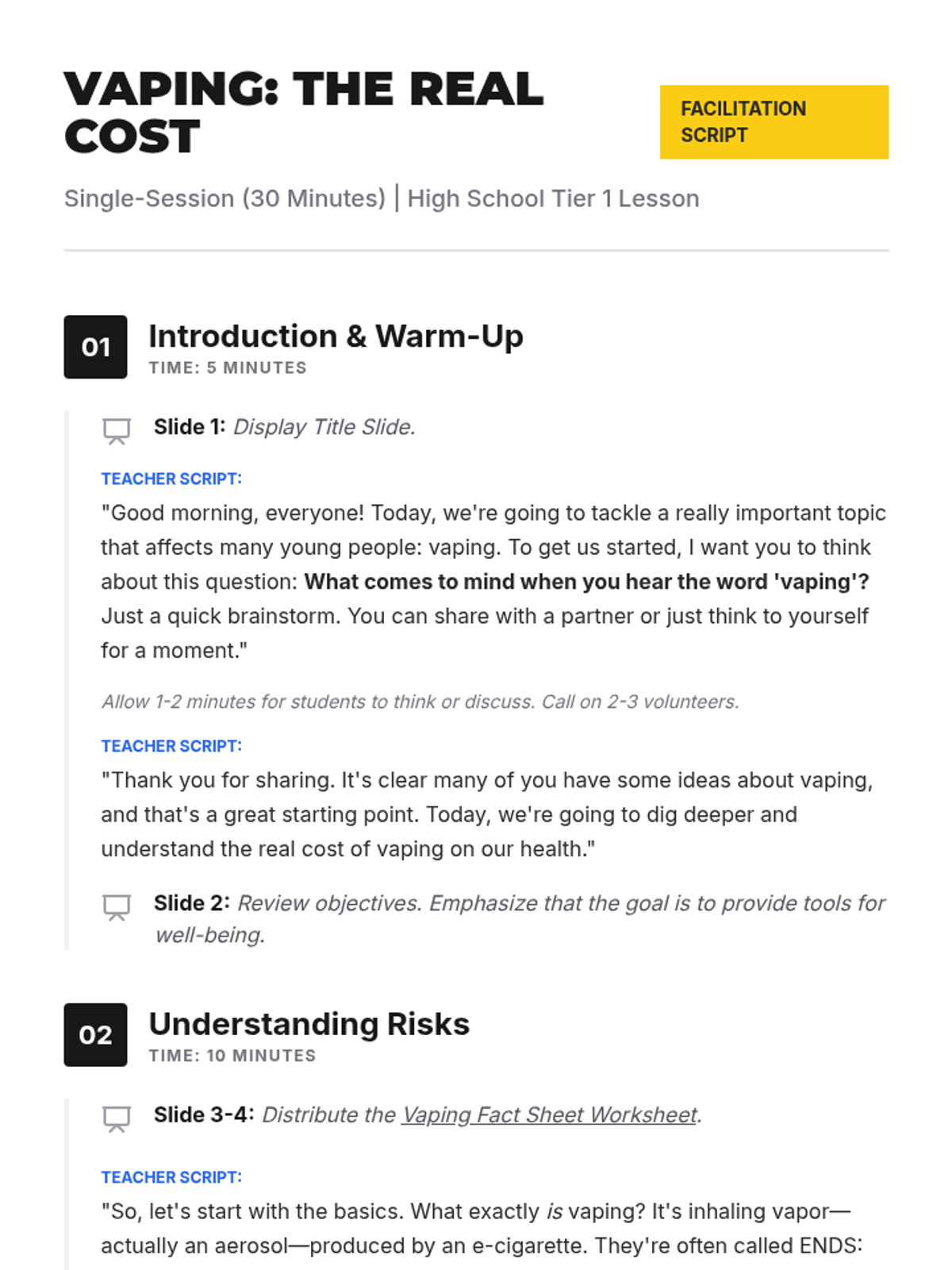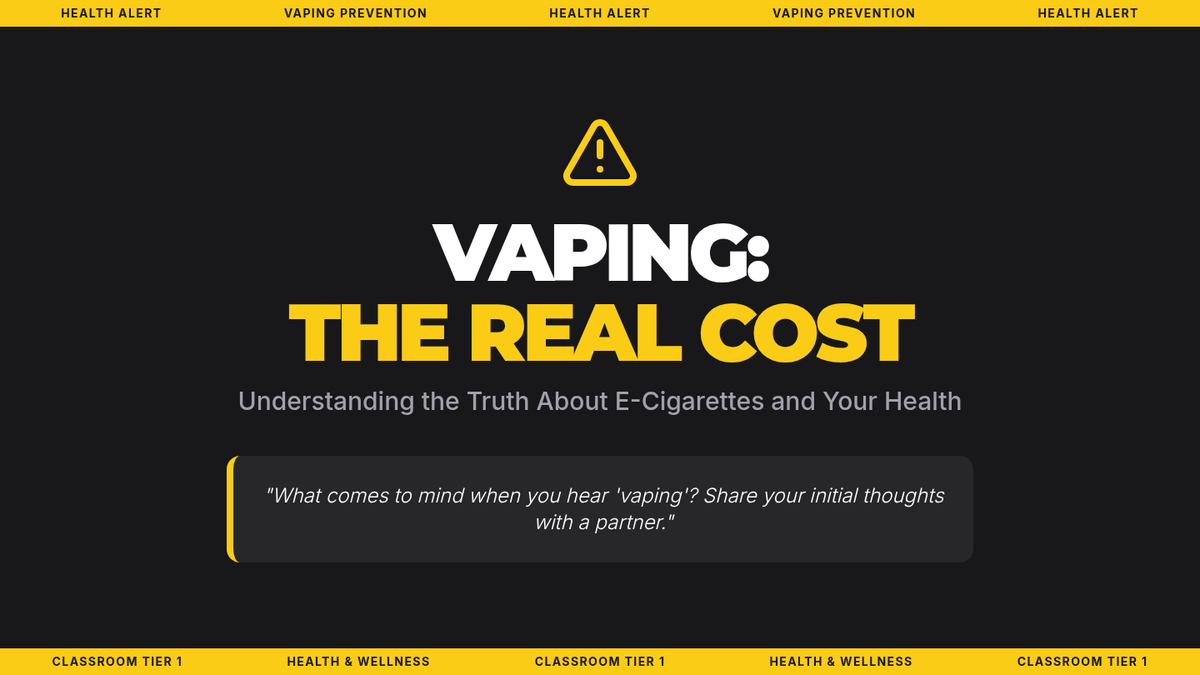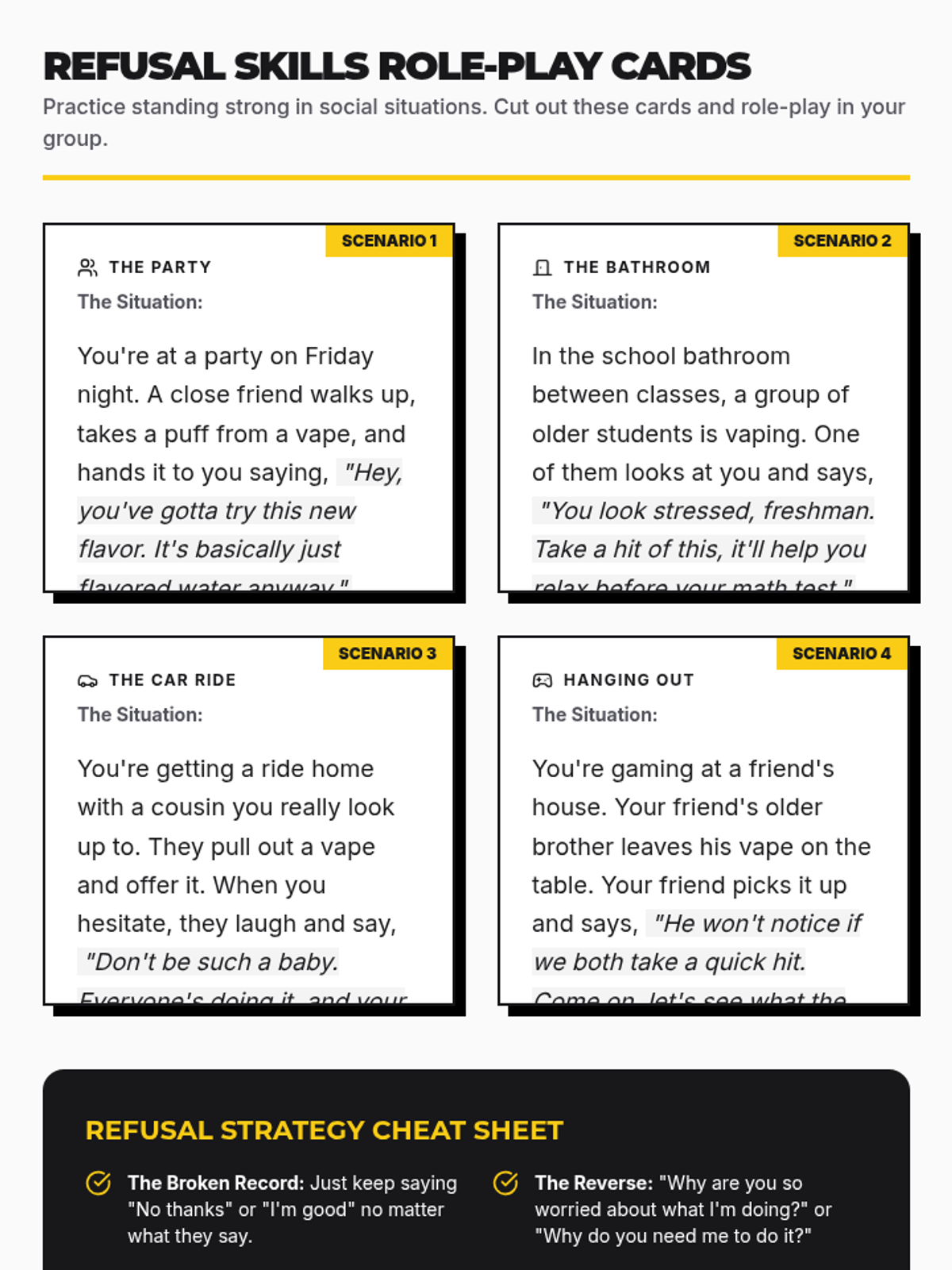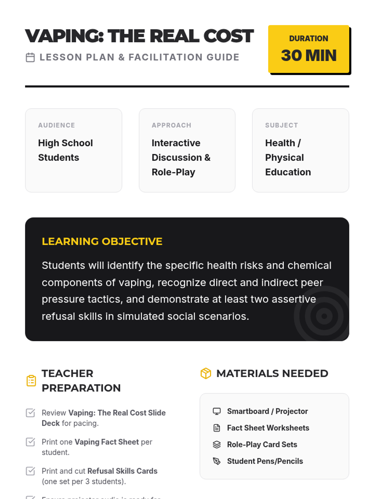 A comprehensive lesson exploring the health risks of vaping, debunking common myths, and practicing refusal skills through real-world scenarios.