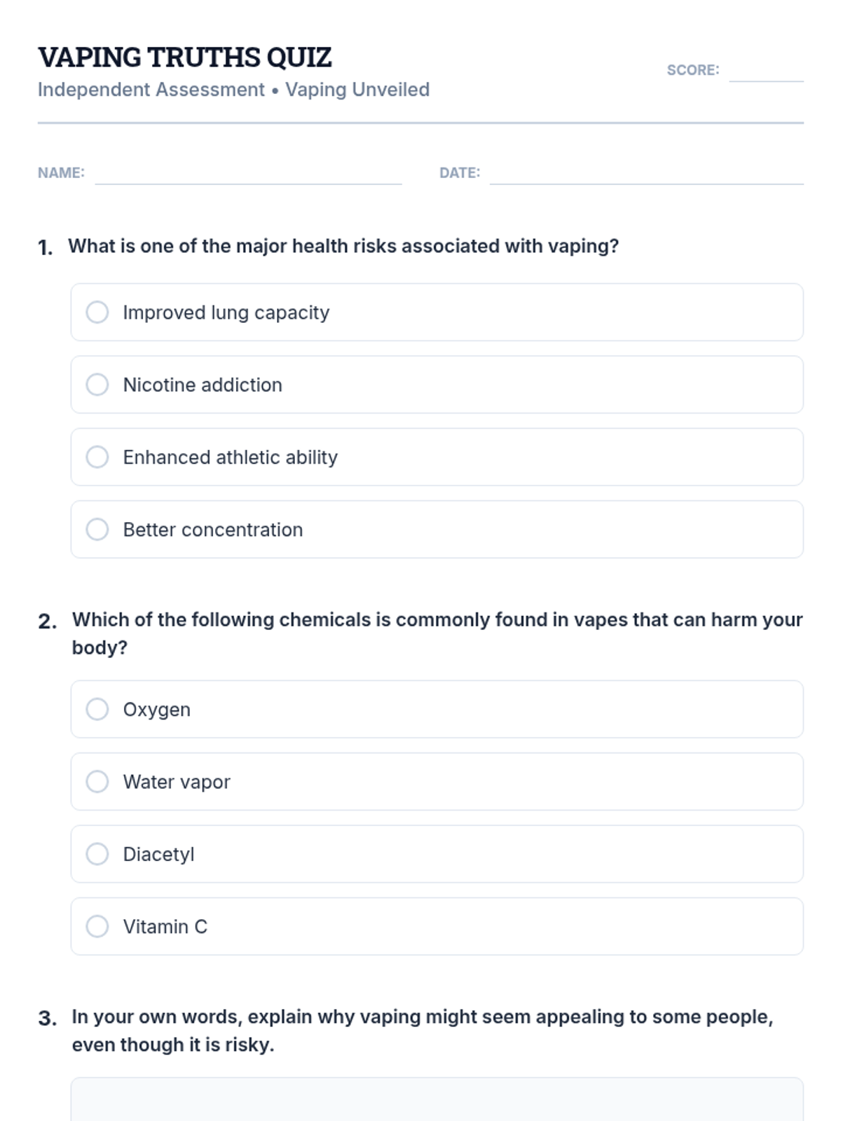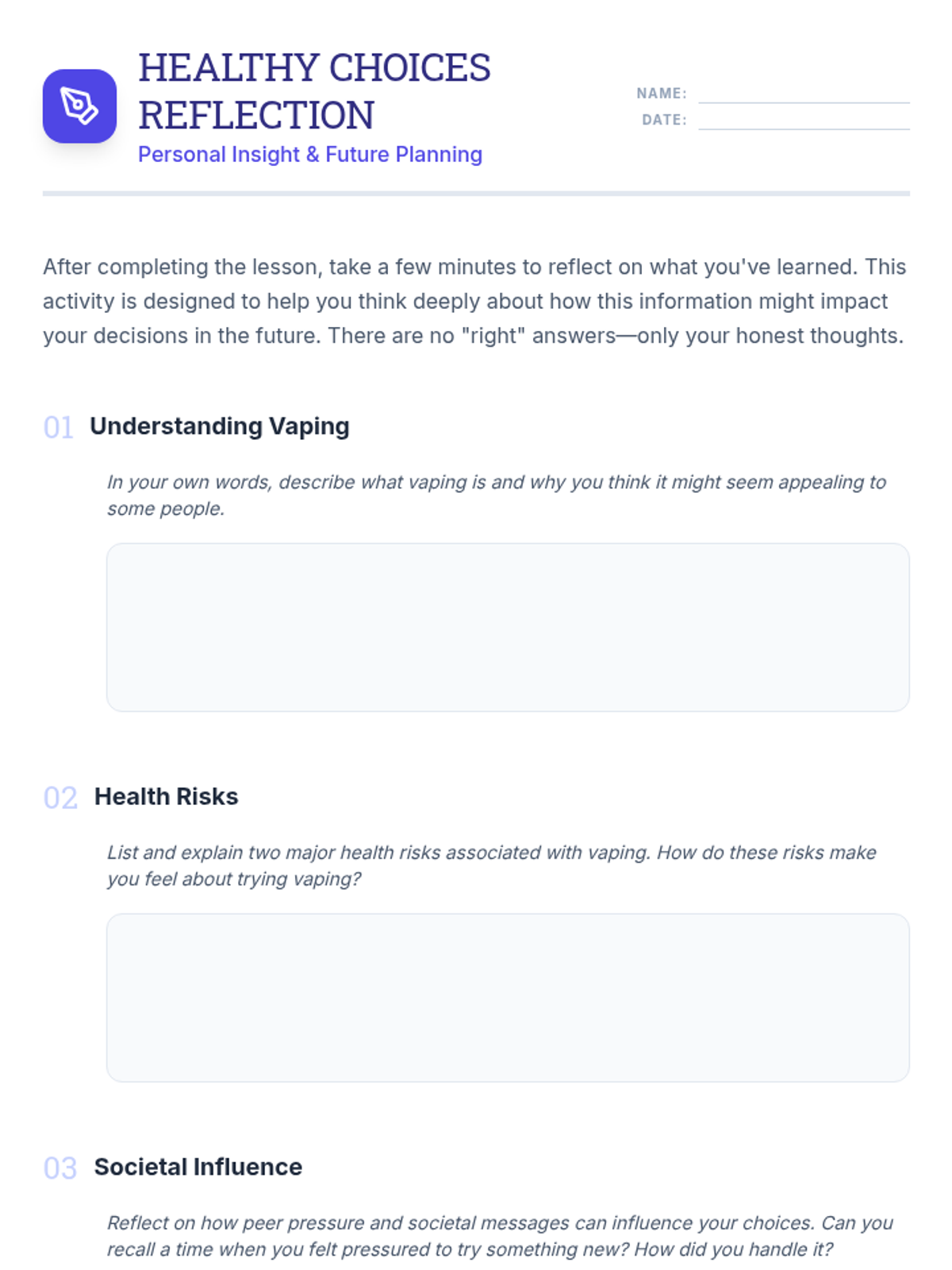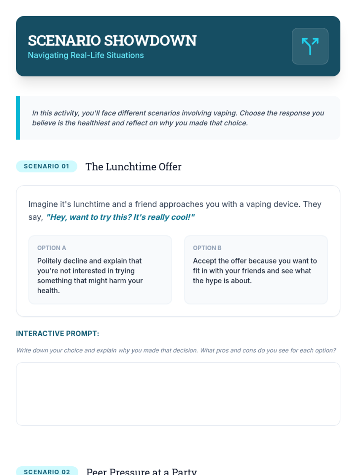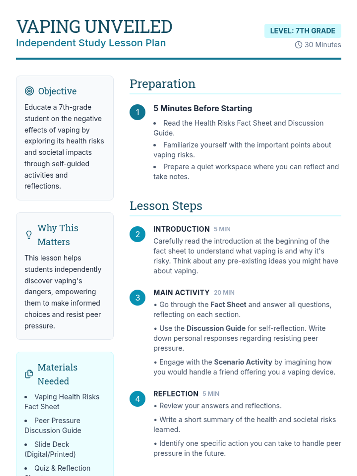 A comprehensive lesson exploring the health risks of vaping, debunking common myths, and practicing refusal skills through real-world scenarios.