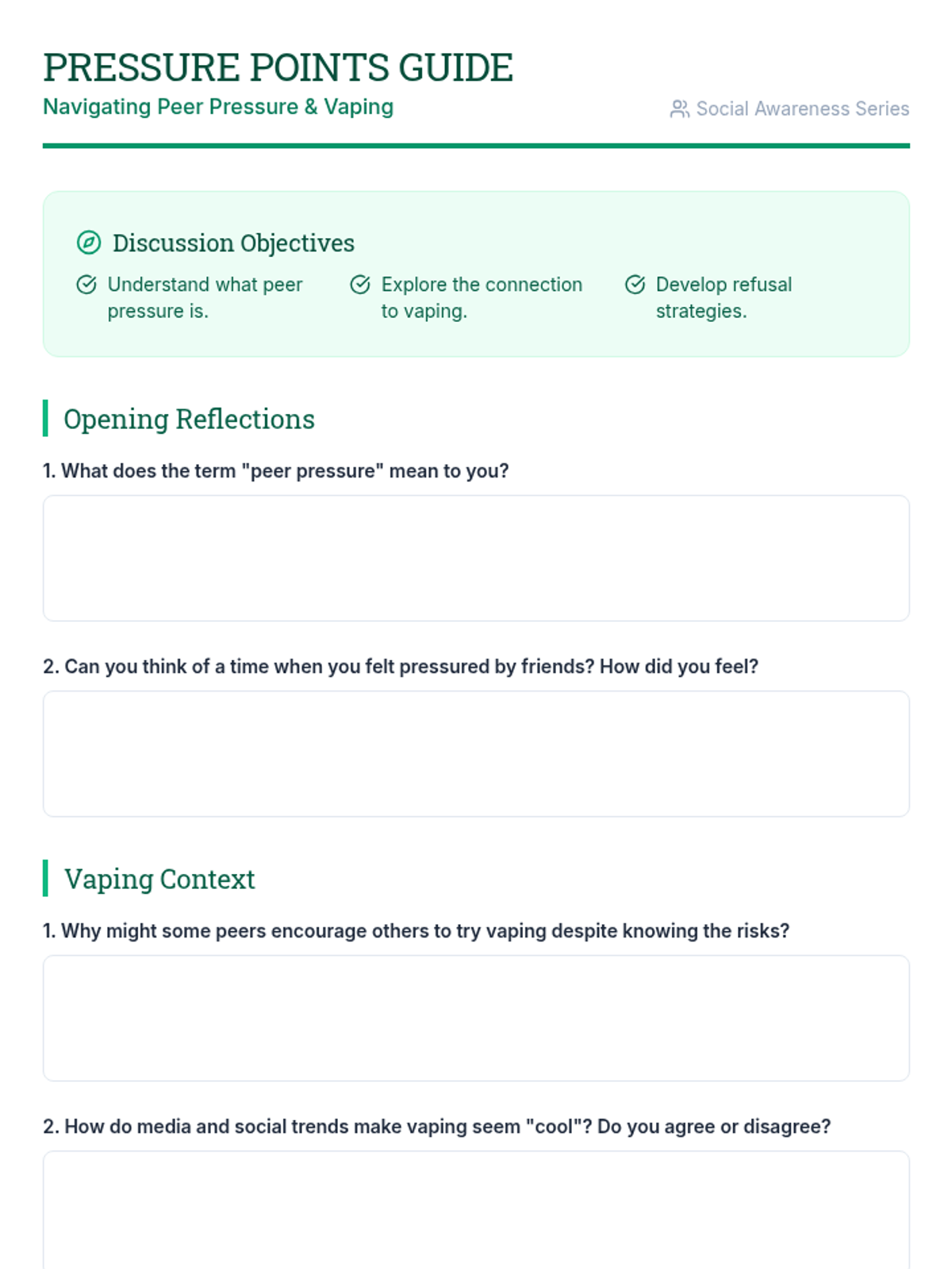 Students identify social pressures and marketing tactics, practicing assertive refusal strategies to navigate real-world situations involving vaping.
