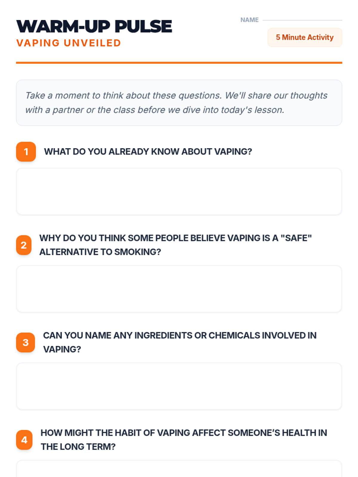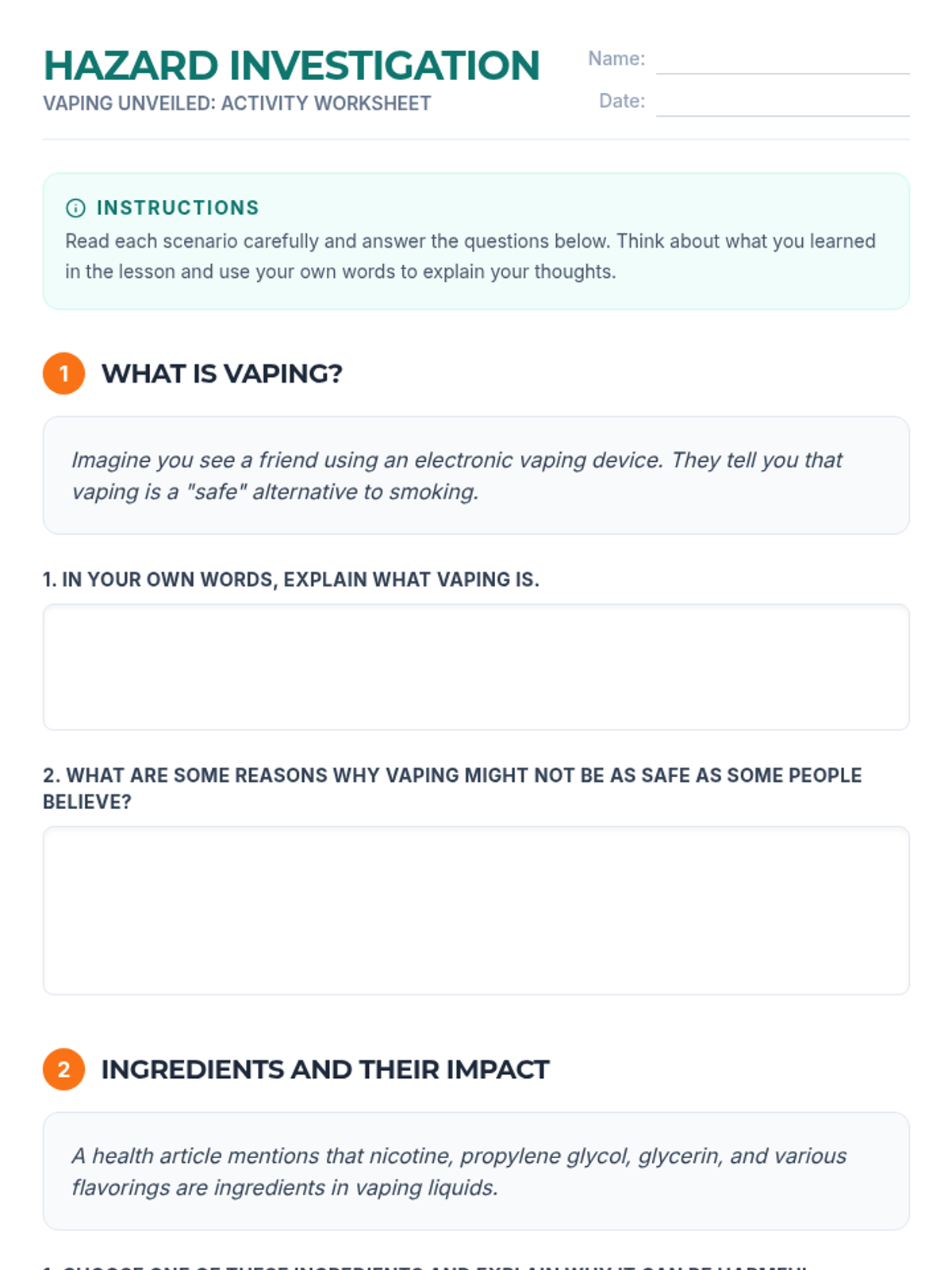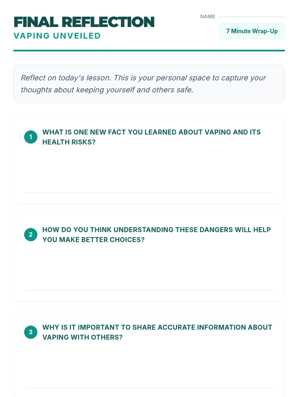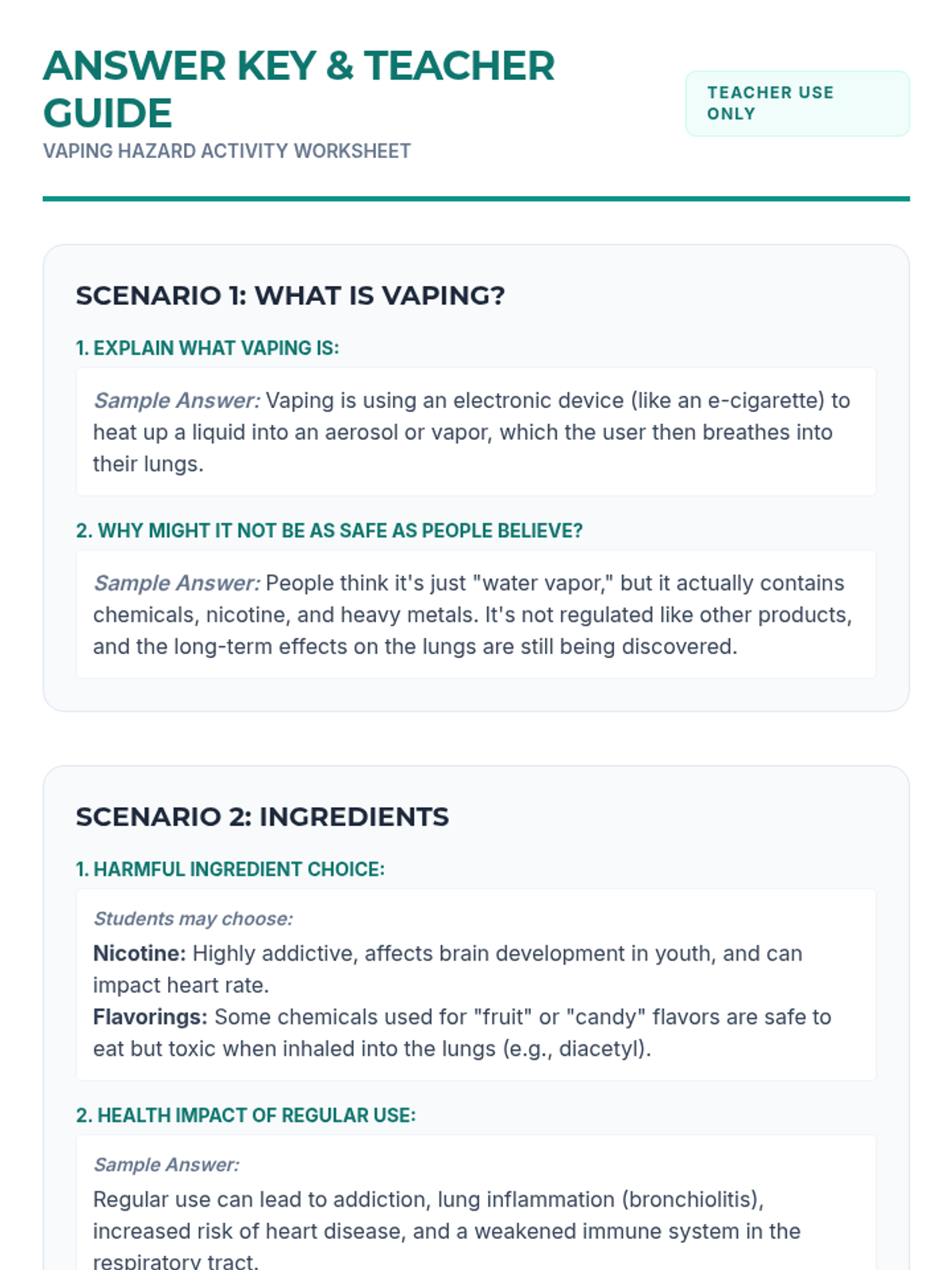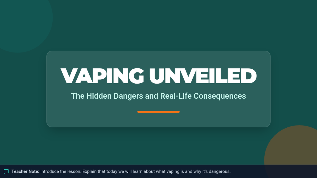 A comprehensive lesson exploring the health risks of vaping, debunking common myths, and practicing refusal skills through real-world scenarios.