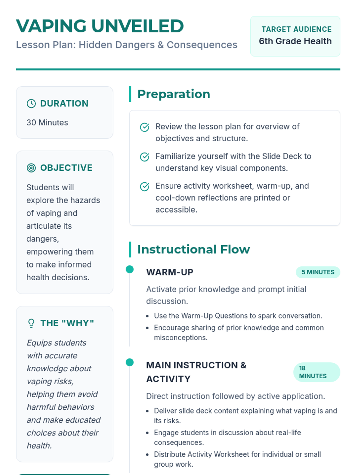 A comprehensive 30-minute health lesson for 6th graders exploring the health risks, chemical ingredients, and real-life consequences of vaping to empower informed decision-making.