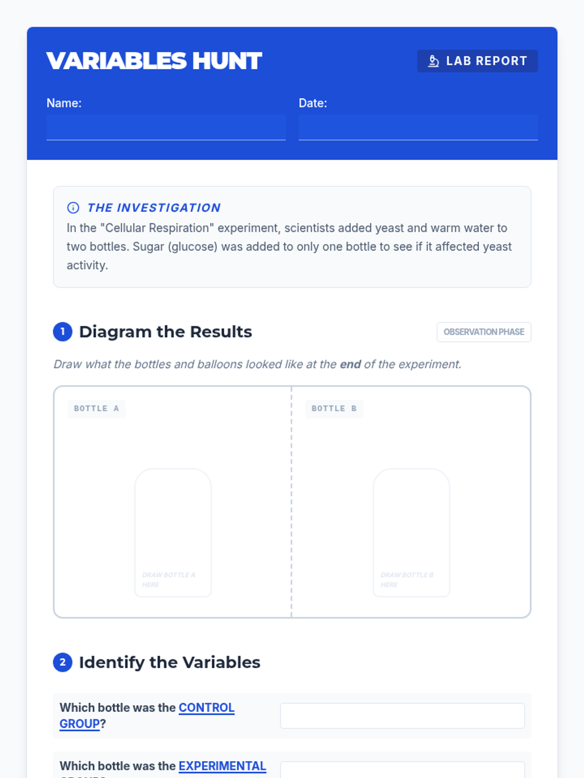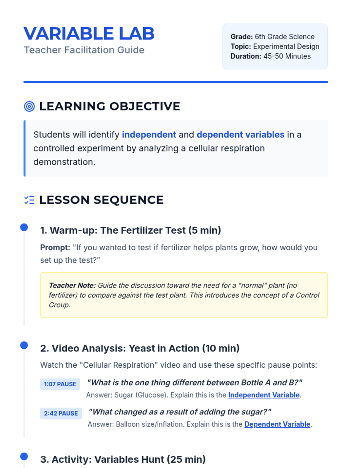 A 6th-grade science lesson focused on identifying independent and dependent variables through a yeast and cellular respiration experiment. Students use a real-world demonstration to distinguish between control and experimental groups.