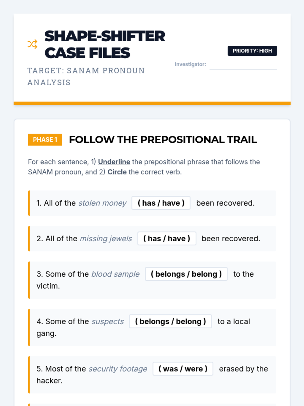 Analyze 'variable' indefinite pronouns (all, some, none, etc.) that change agreement based on context.