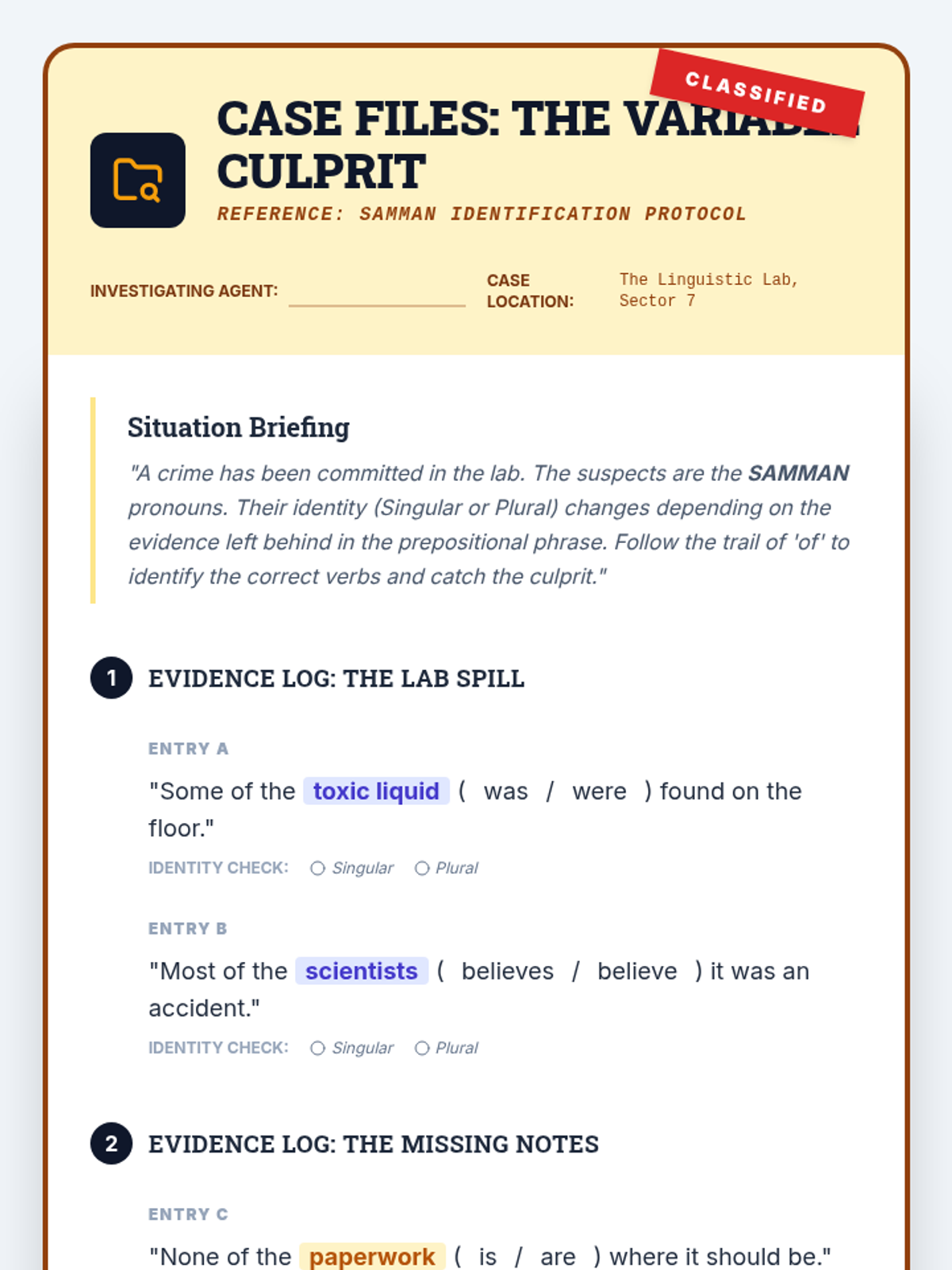 Students learn to use the SAMMAN rule (Some, Any, More, Most, All, None) to determine agreement based on the object of the following prepositional phrase.