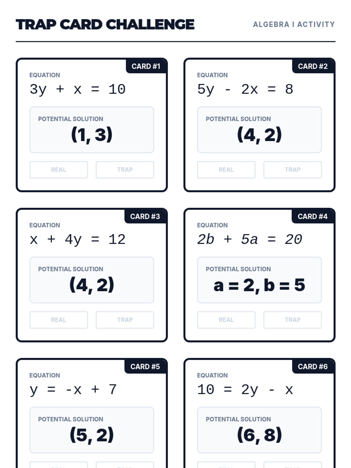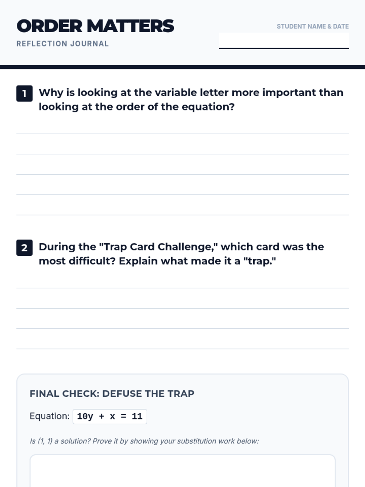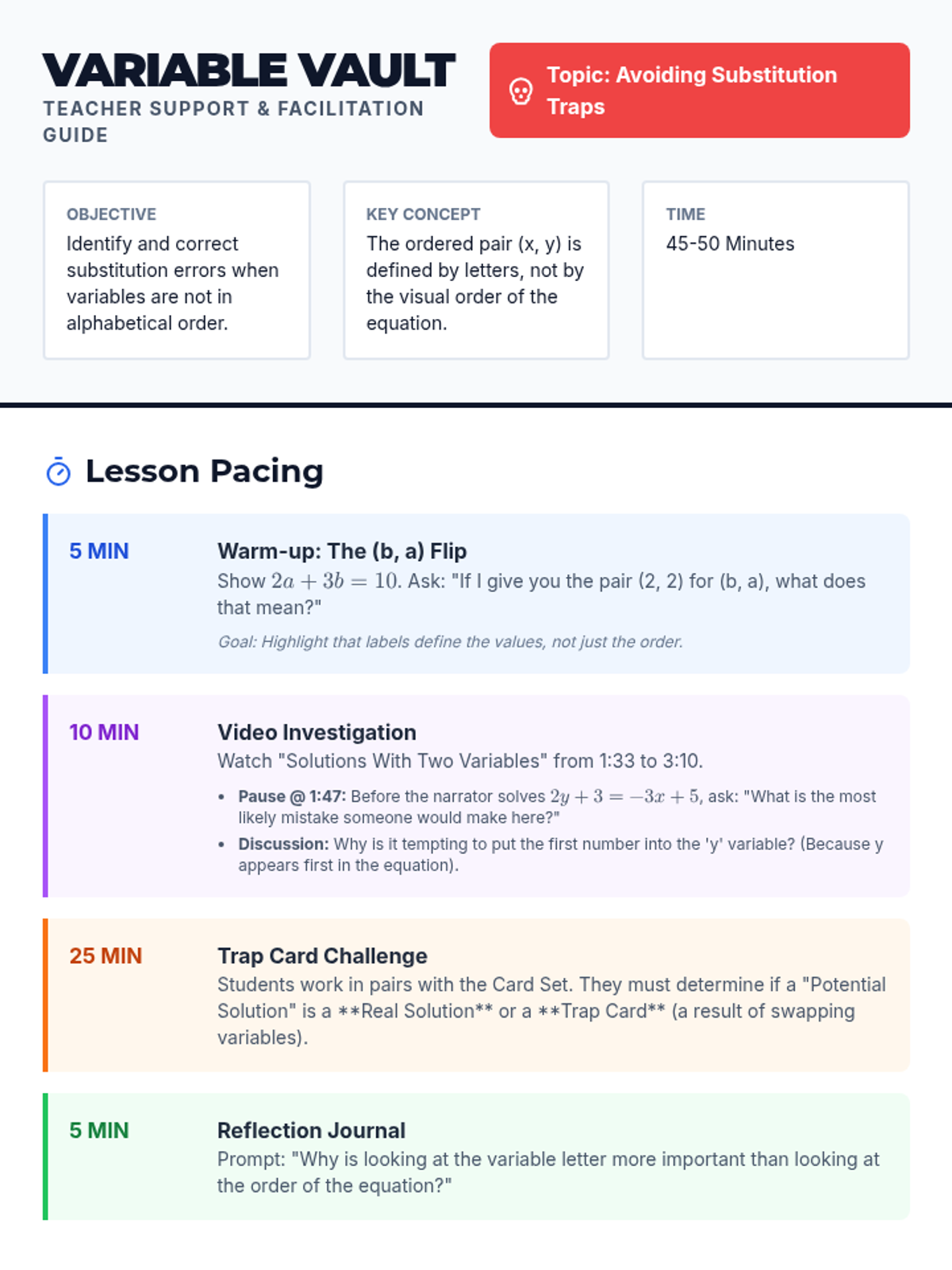 Students learn to identify and avoid the 'variable order trap' when substituting ordered pairs into equations where variables are not alphabetical. This lesson features a video-based investigation, a cooperative 'Trap Card' sorting activity, and reflective journaling.