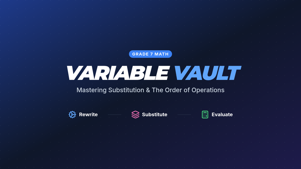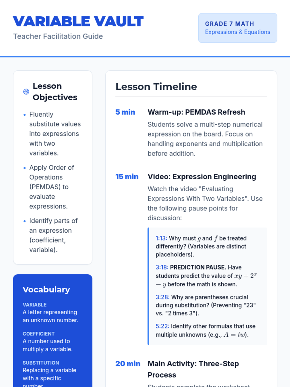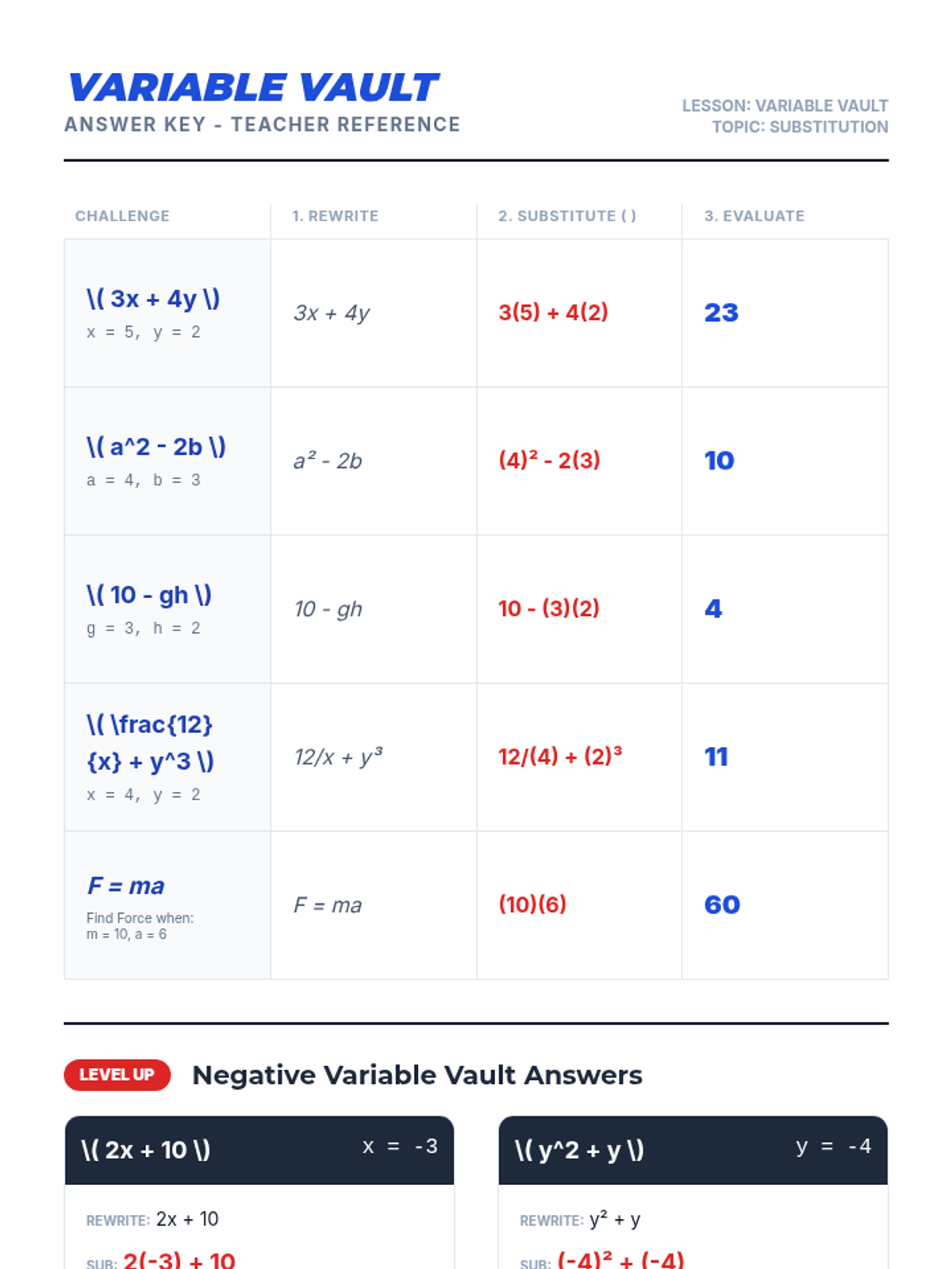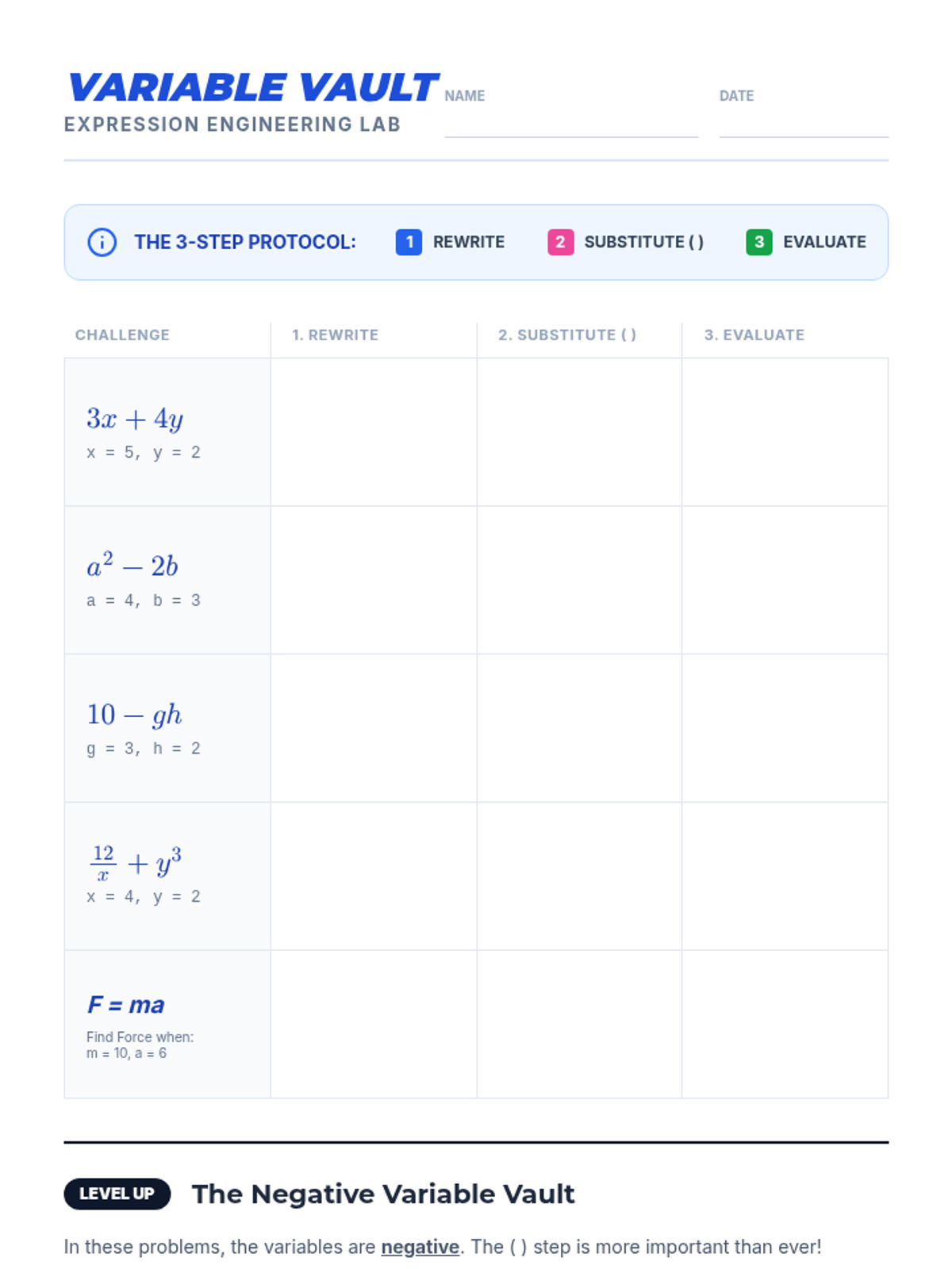 Students learn to evaluate algebraic expressions with two variables using a specific three-step process: Rewrite, Substitute, and Evaluate. The lesson connects mathematical substitution to real-world automotive engineering and physics formulas.