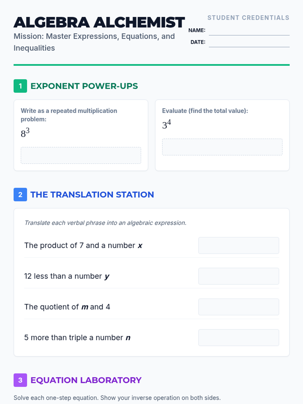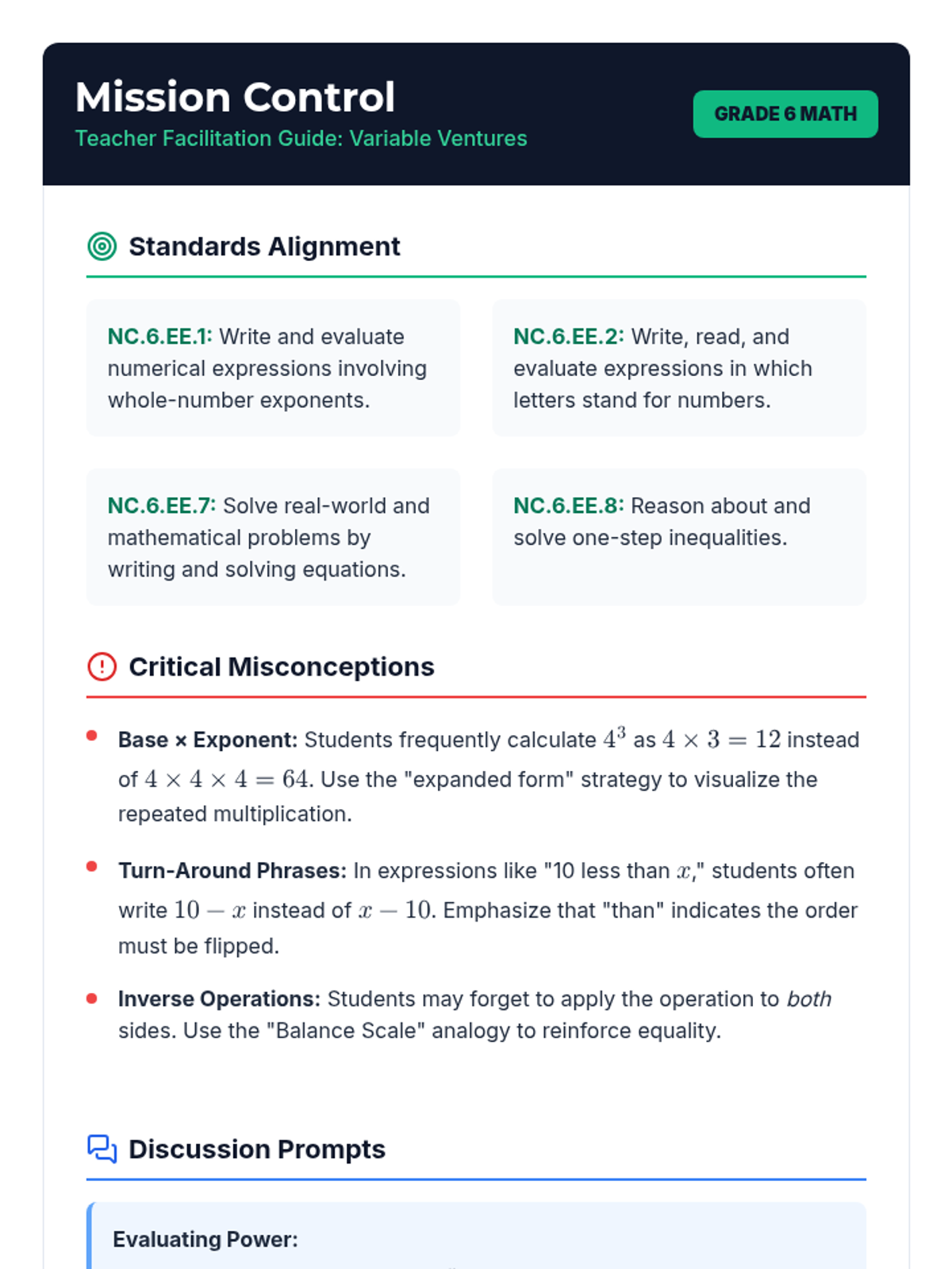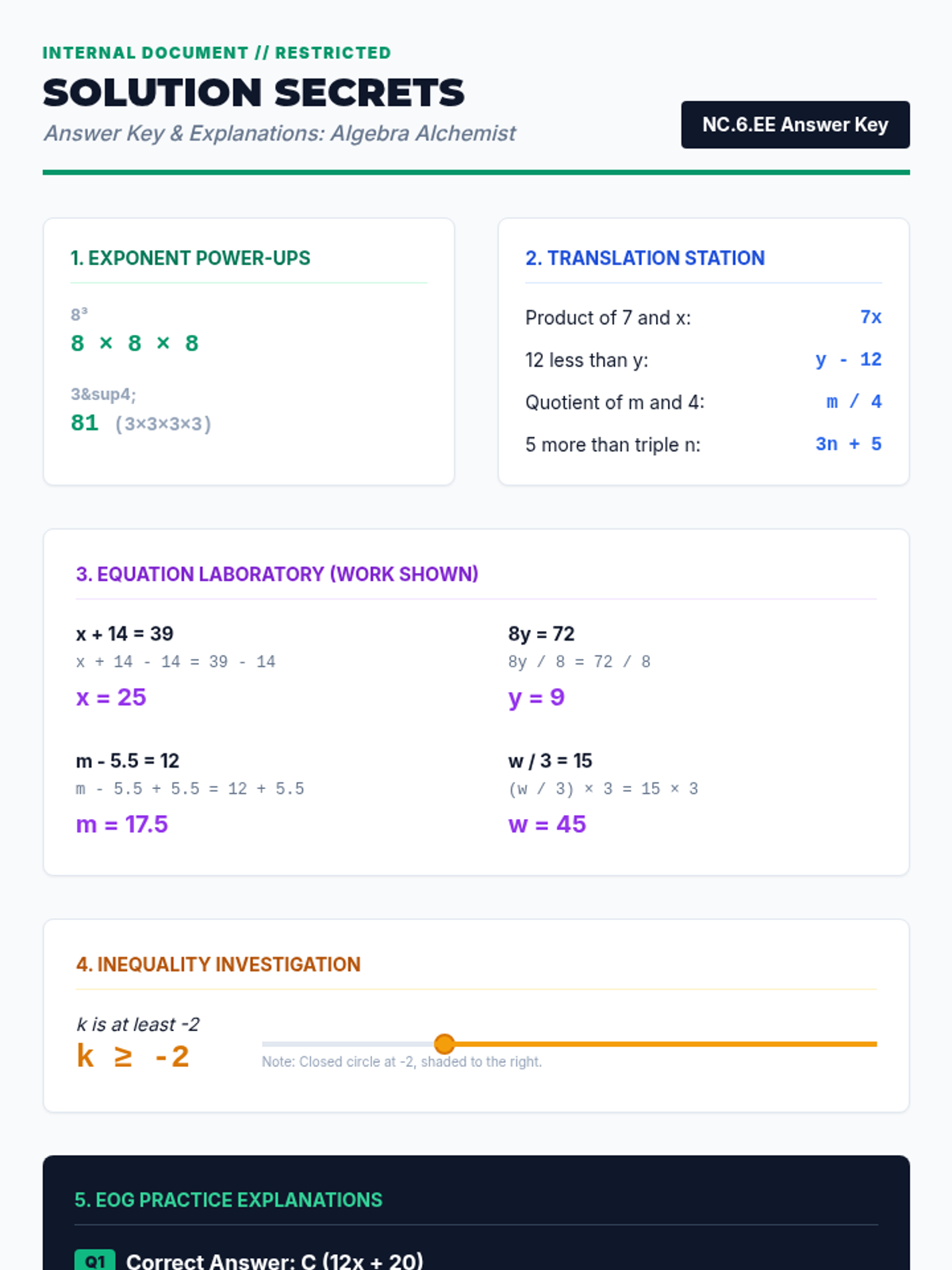 This lesson covers NC.6.EE standards, focusing on writing, reading, and evaluating algebraic expressions with whole-number exponents, and solving one-step equations and inequalities in real-world contexts. It includes a comprehensive slide deck, student practice, and teacher supports designed for NC EOG preparation.