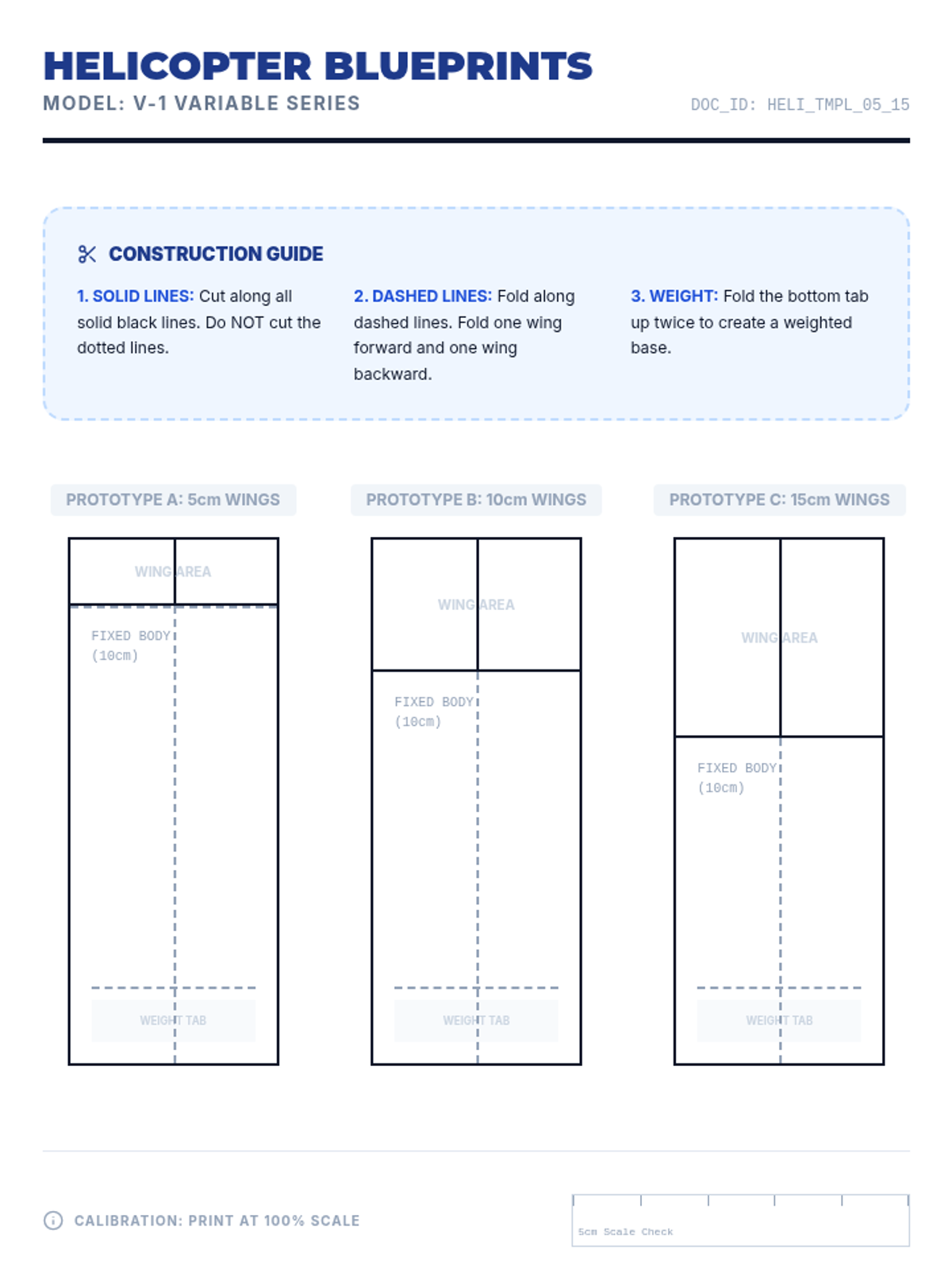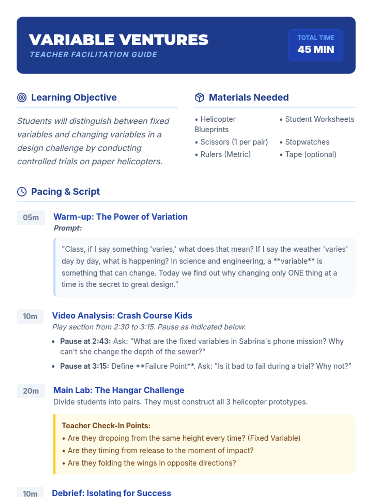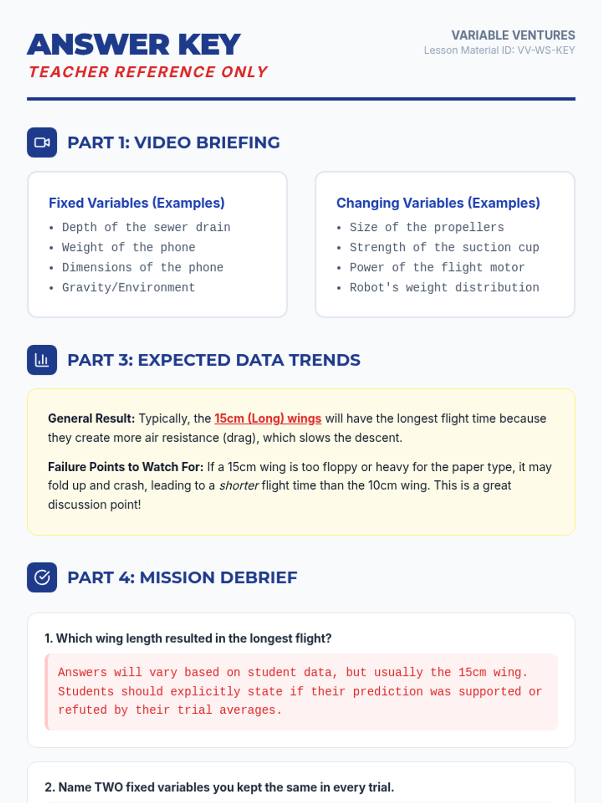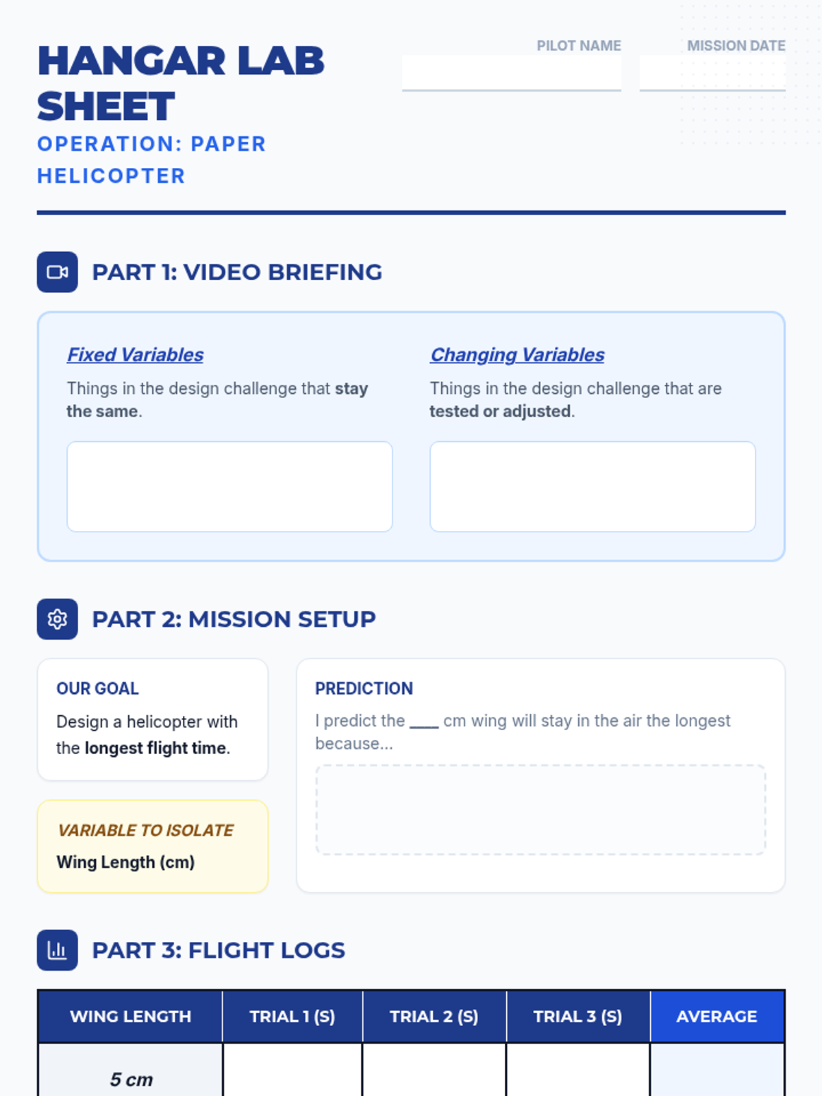 Students explore the Engineering Design Process by distinguishing between fixed and changing variables through a video analysis of a robot challenge and a hands-on paper helicopter design lab.