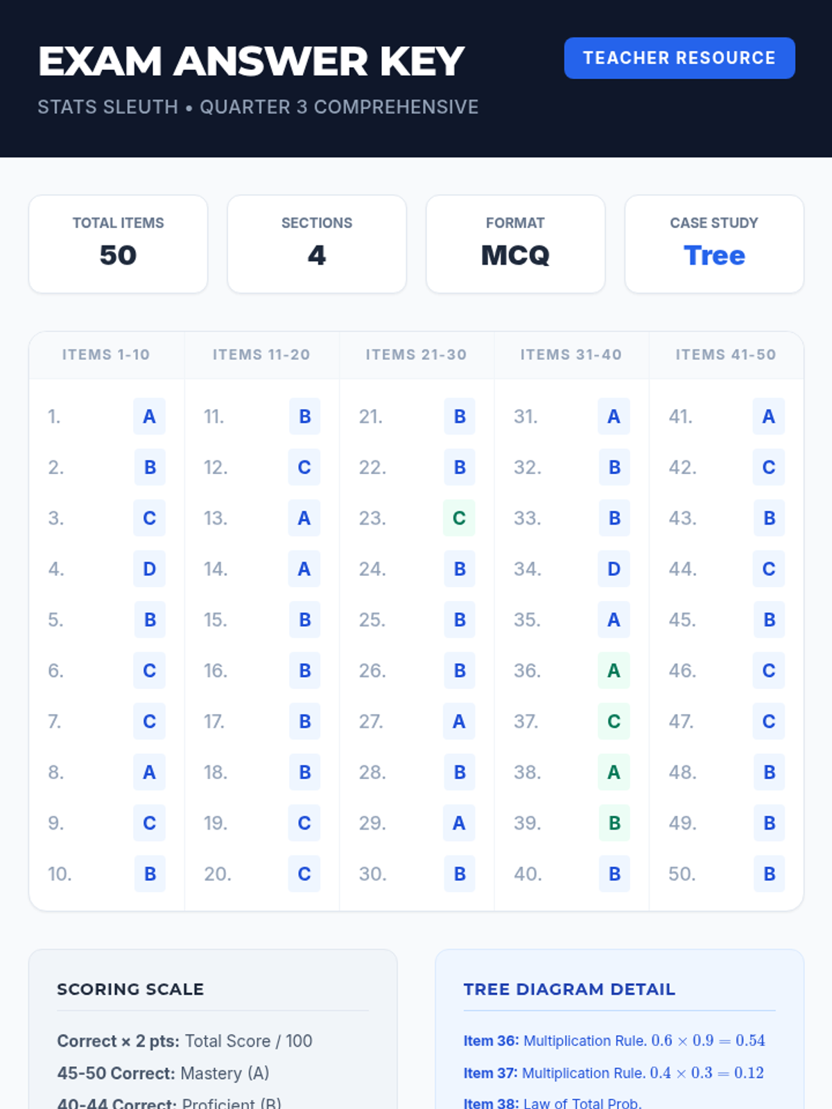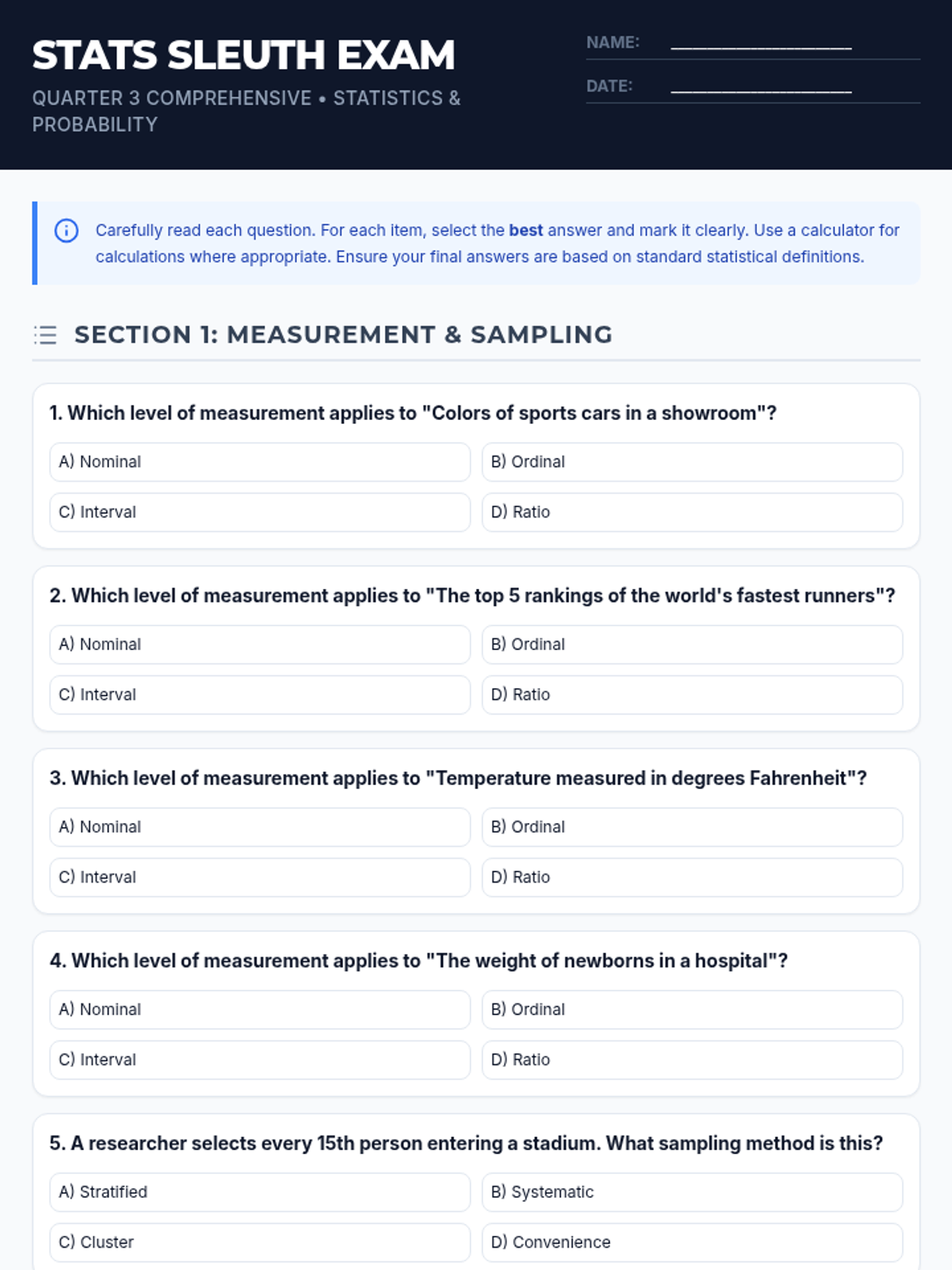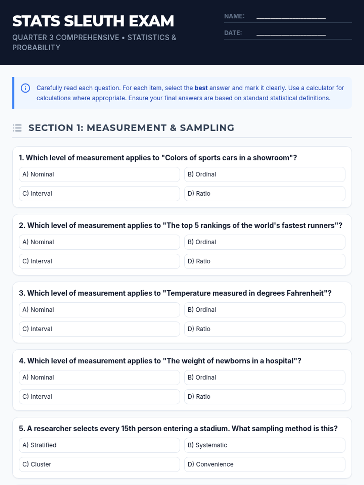 A comprehensive assessment covering descriptive statistics, data distributions, measures of variation, and basic probability theory including tree diagrams.