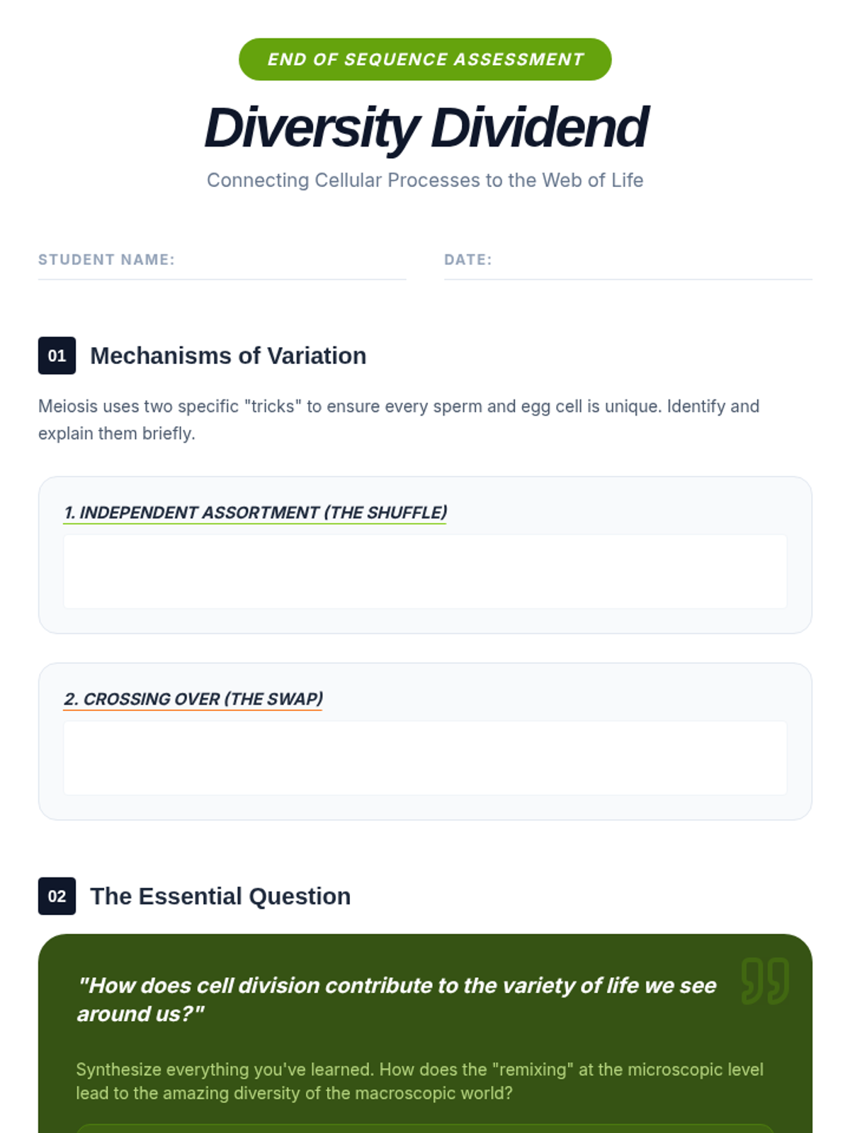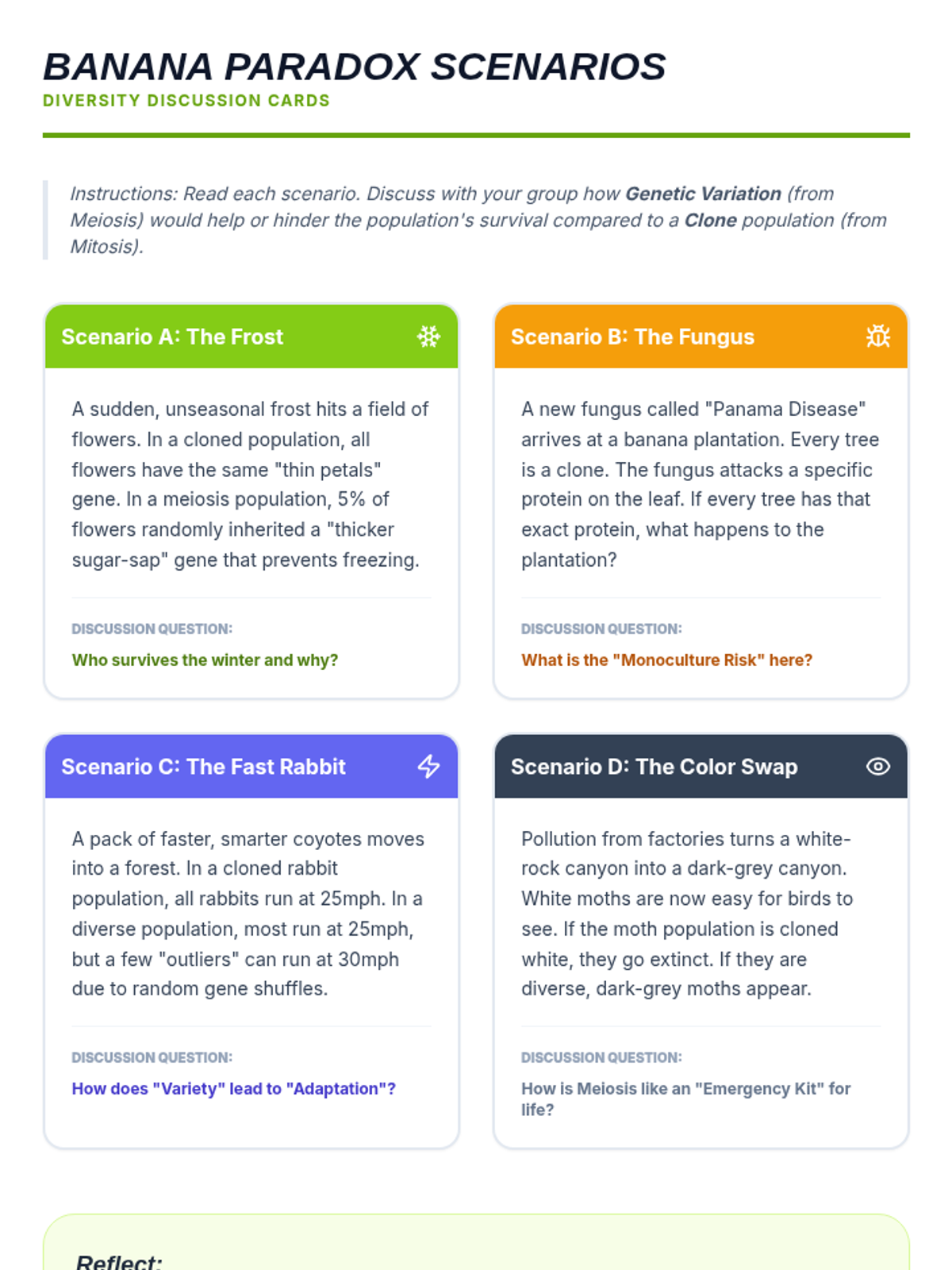 Students analyze the evolutionary benefits of genetic diversity and the risks of monocultures, connecting cellular processes to population survival.
