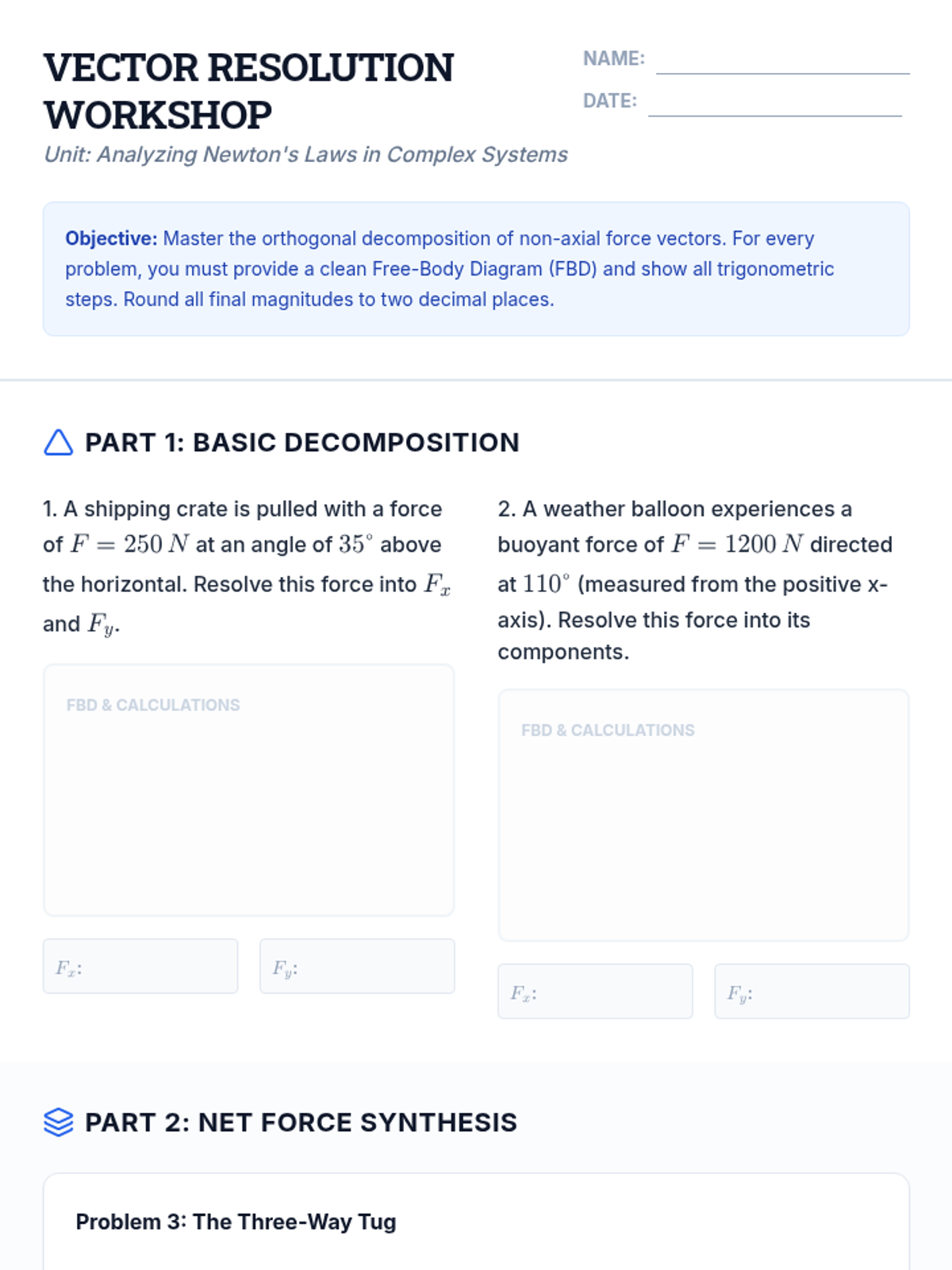 Focuses on breaking diagonal forces into orthogonal components using trigonometry and constructing precise free-body diagrams for equilibrium and non-equilibrium states.