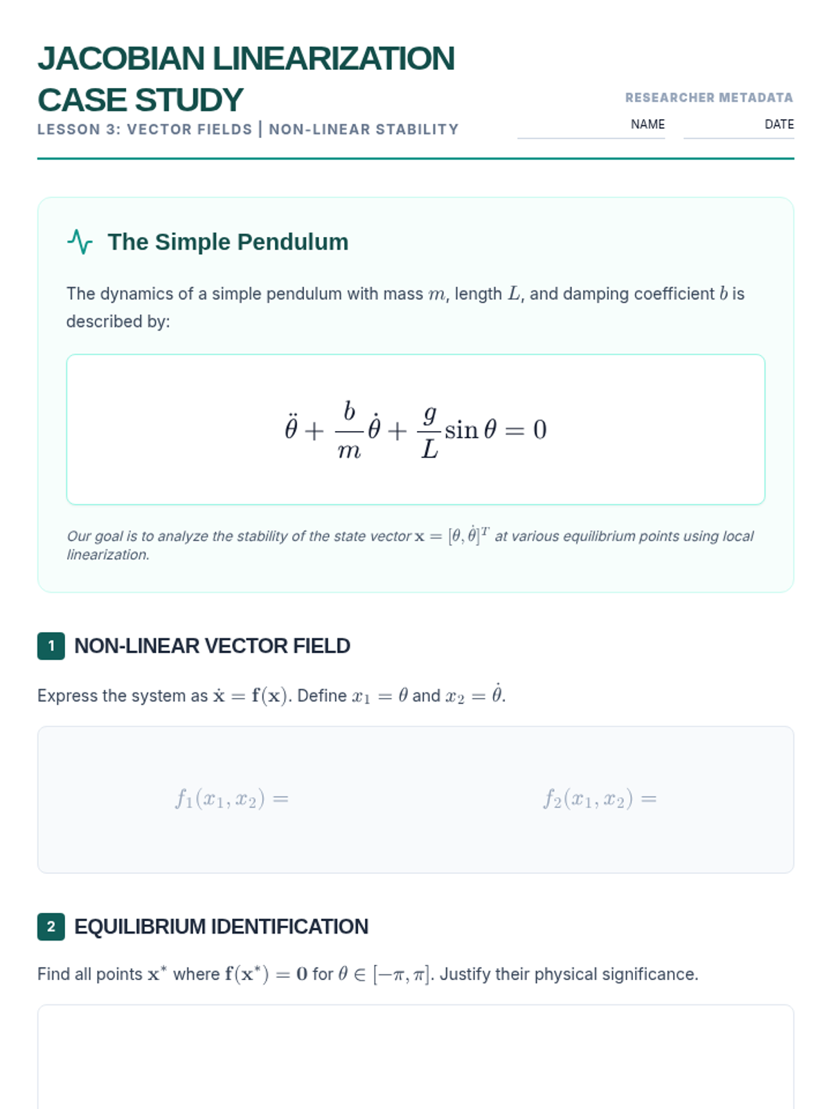 Students treat the system dynamics as a vector field and analyze equilibrium points. They utilize Jacobian linearization to determine local stability of non-linear vector fields.