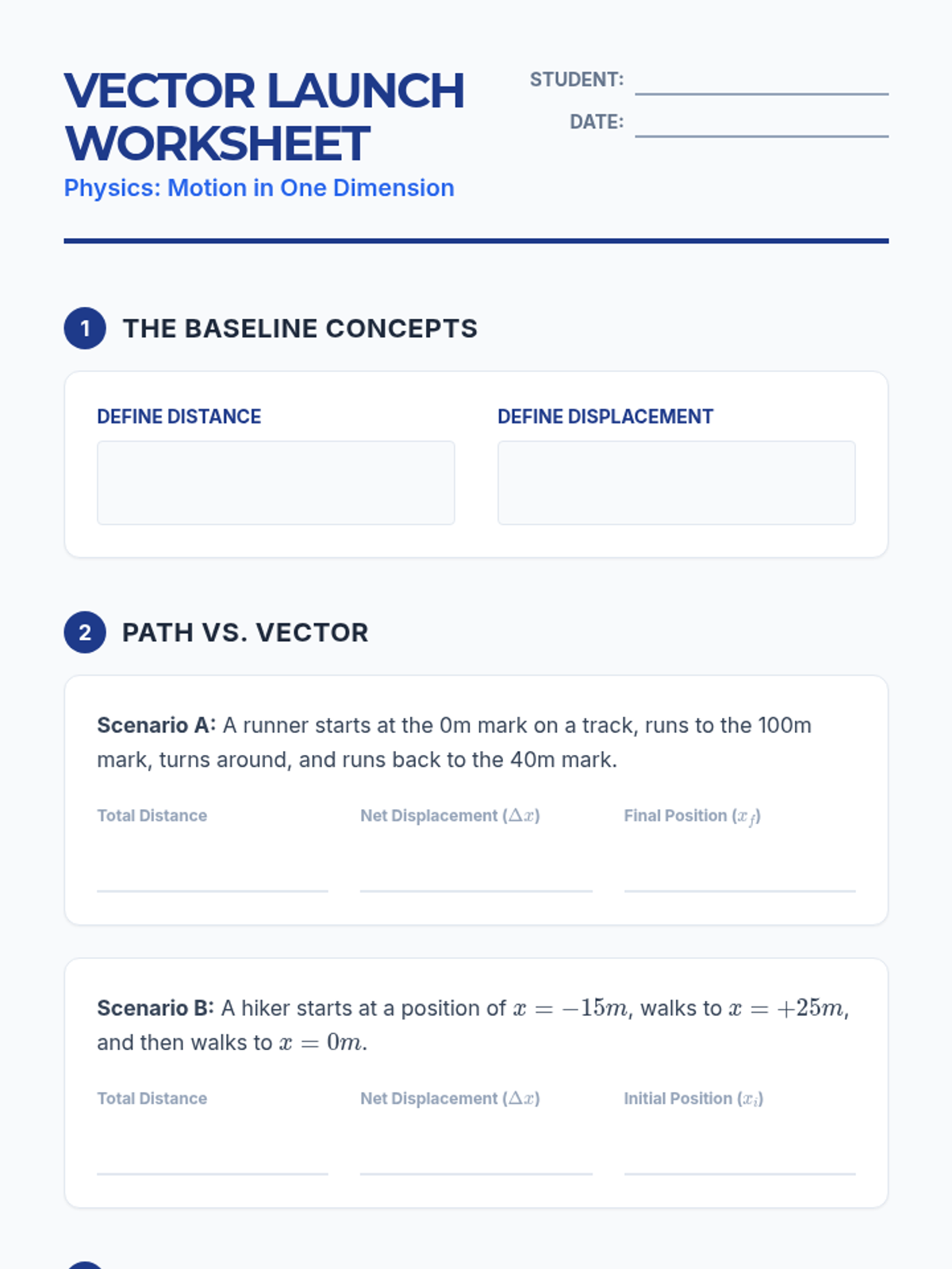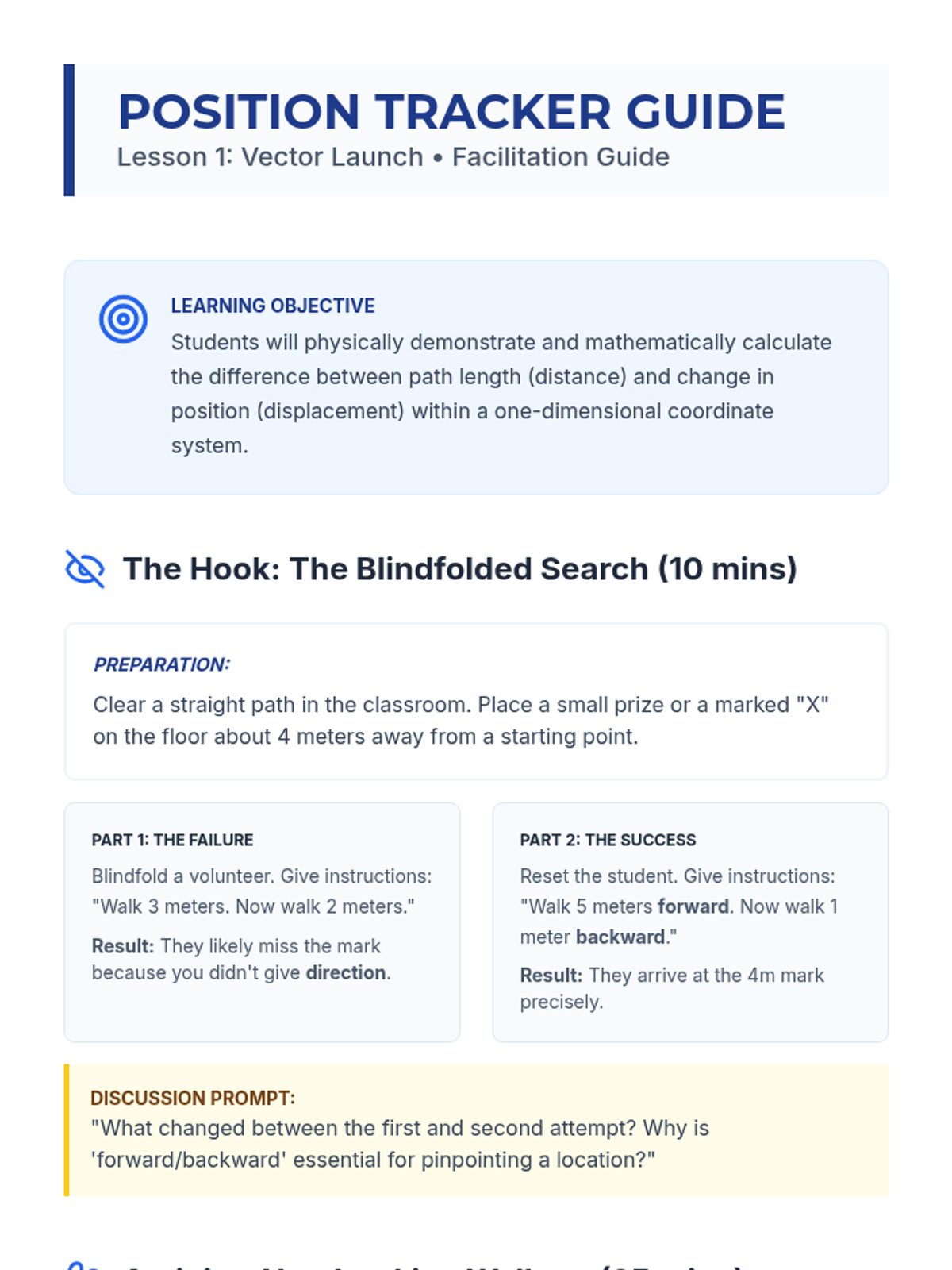 Students explore the critical difference between distance and displacement using number lines and physical walking activities. They define frame of reference and practice mapping 1D motion vectors.