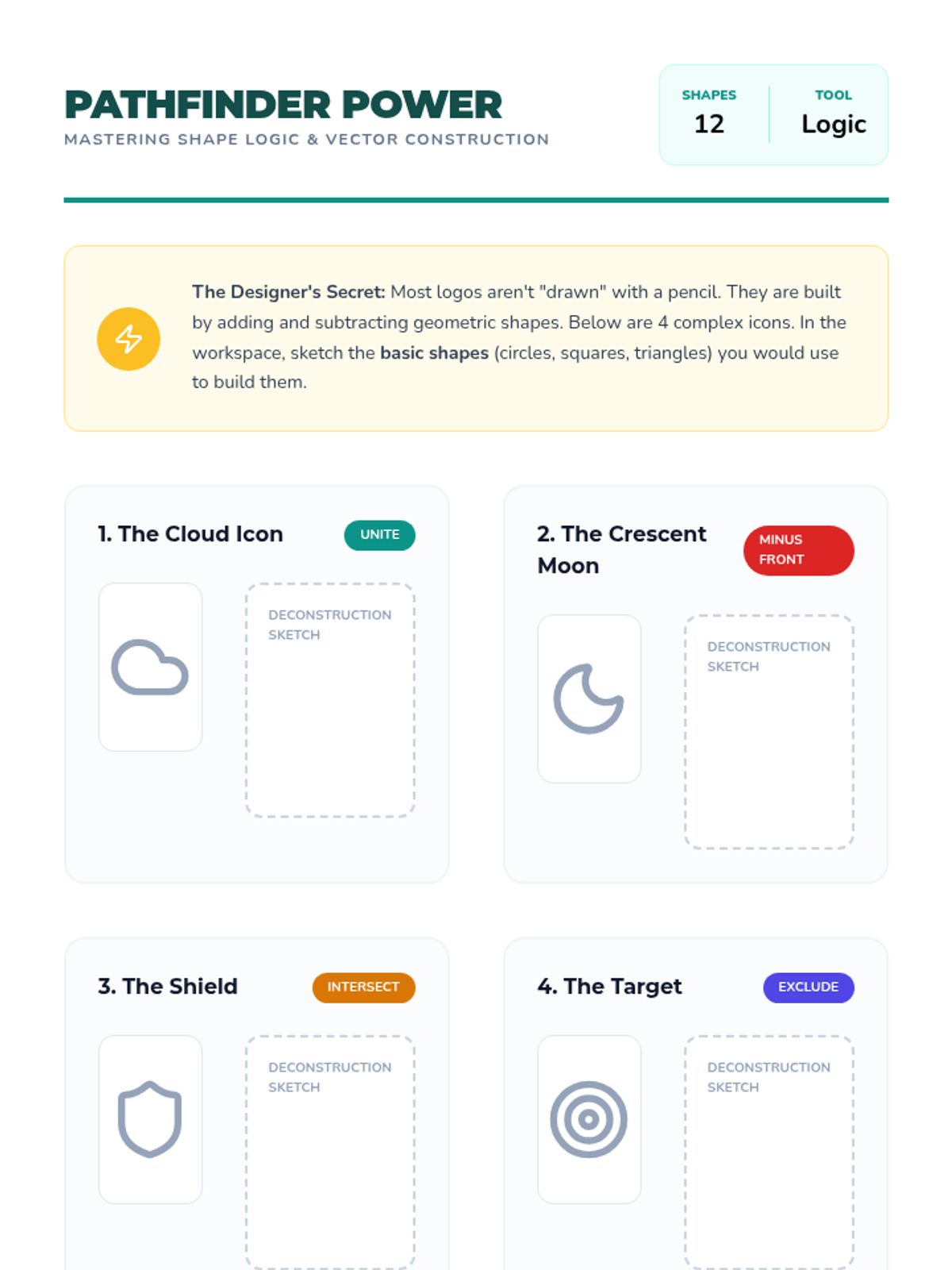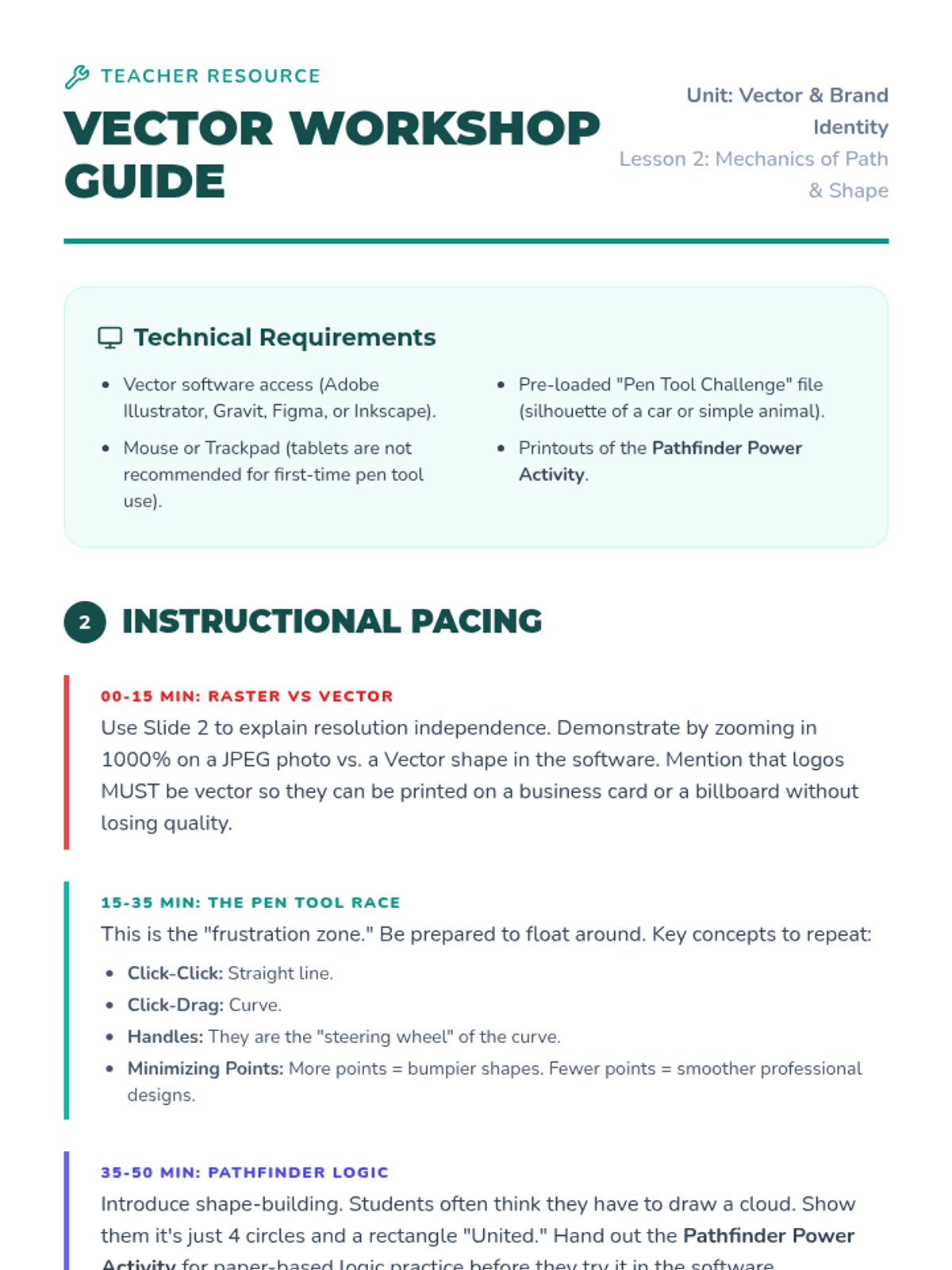 An introduction to the mechanics of vector graphics, focusing on the pen tool, Bezier curves, and pathfinder operations for geometric construction.
