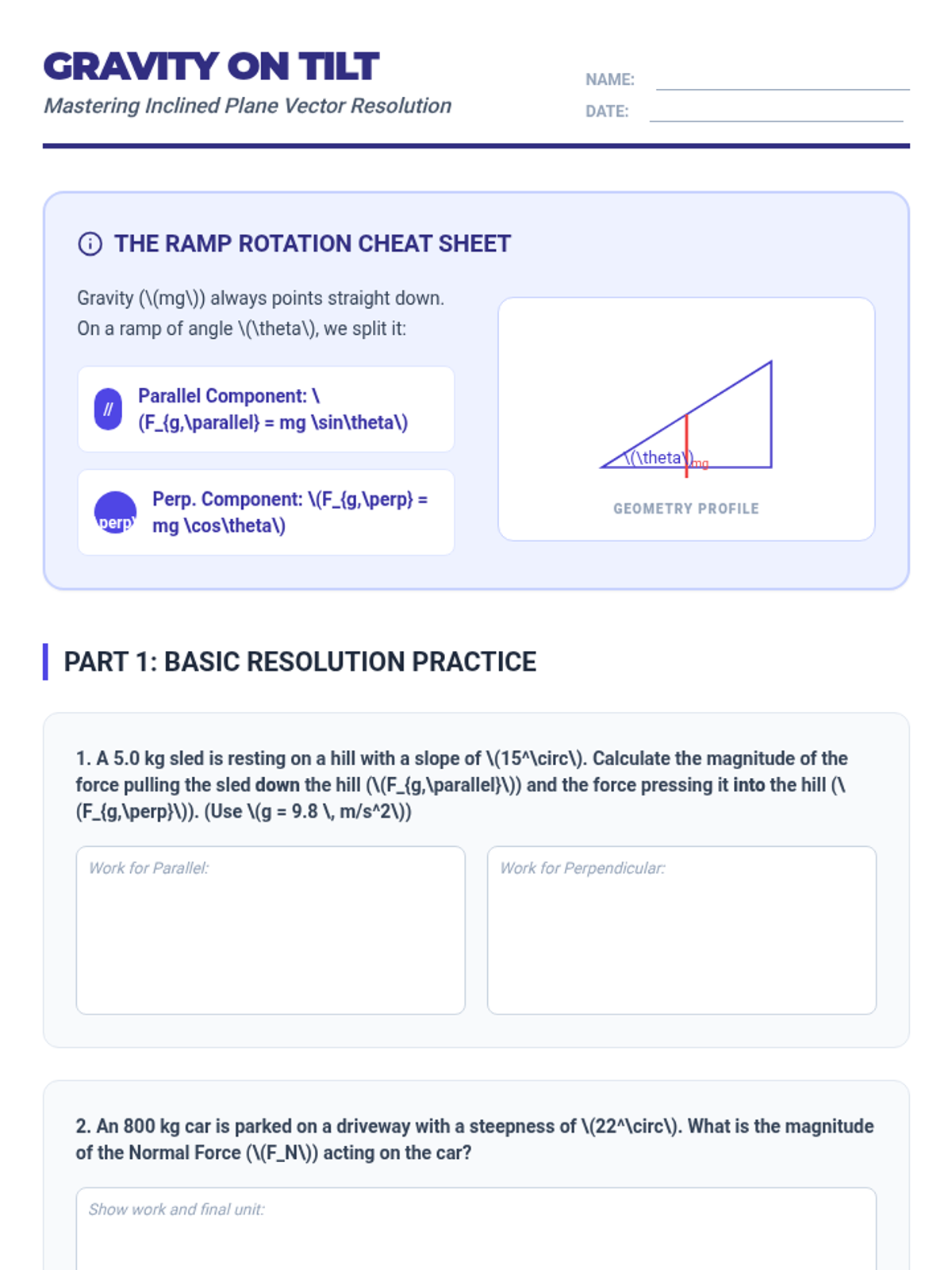 Mastering the geometry of inclined planes by resolving gravitational vectors into parallel and perpendicular components.