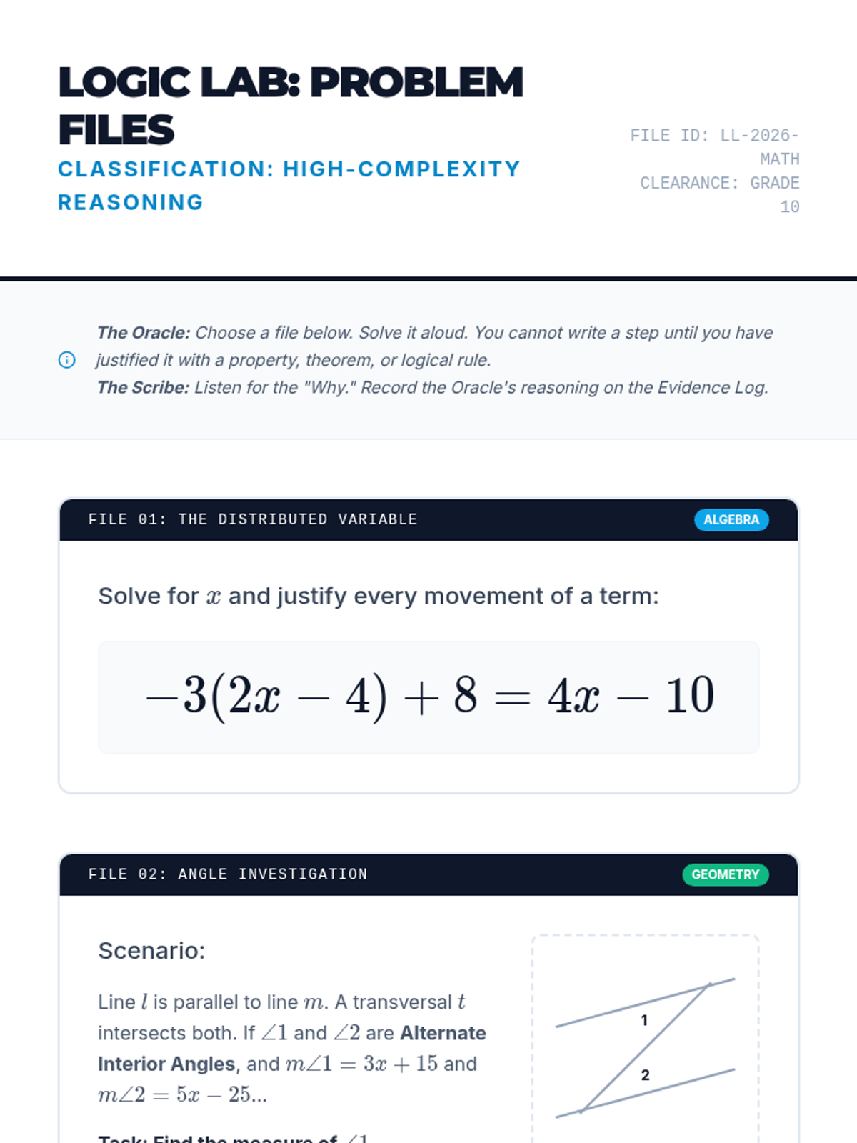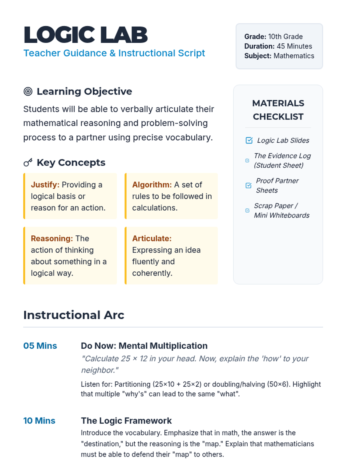 A 10th-grade math lesson focused on developing mathematical communication skills. Students practice verbalizing their internal logic and justifying their algorithmic choices to a partner.