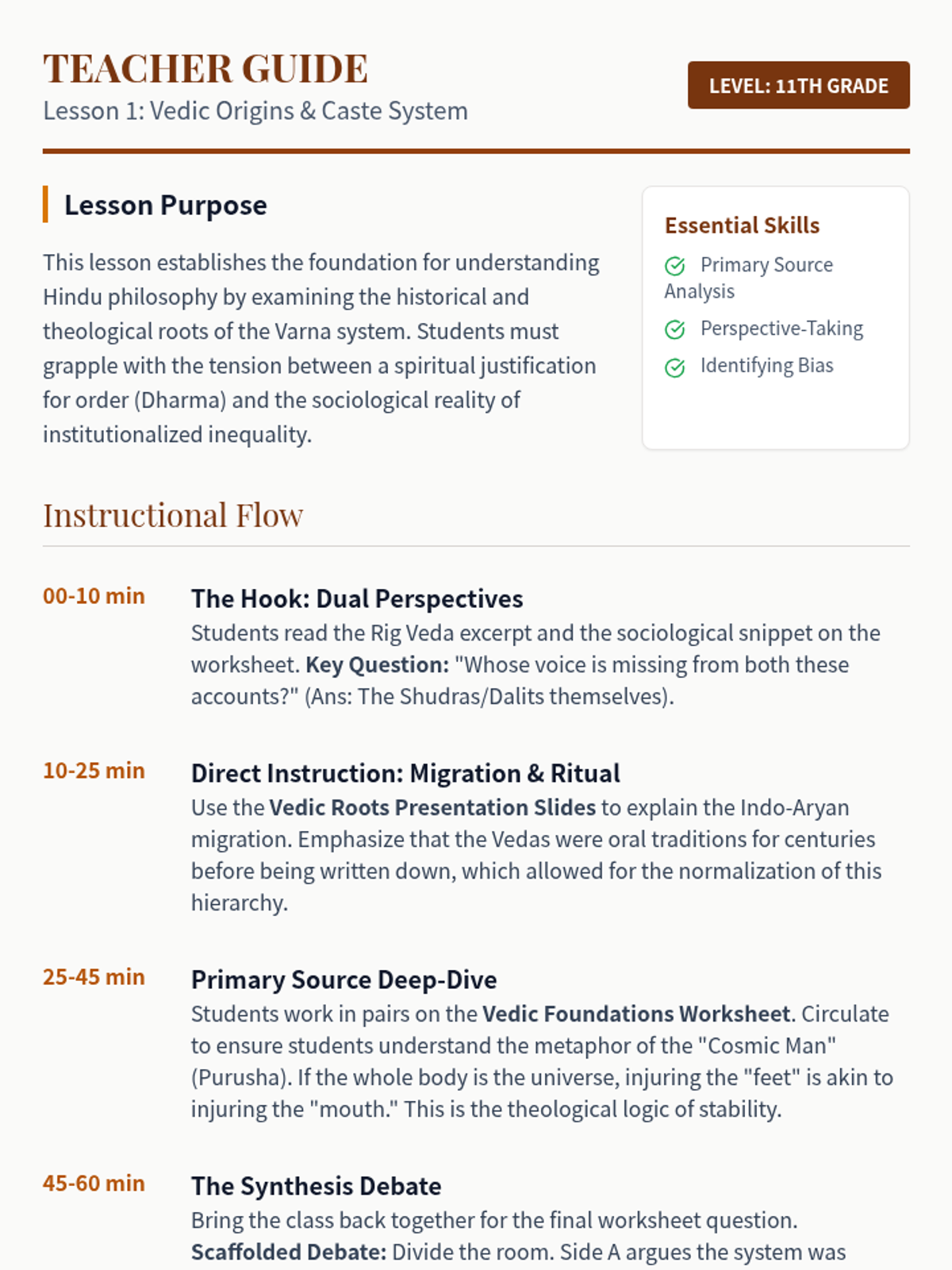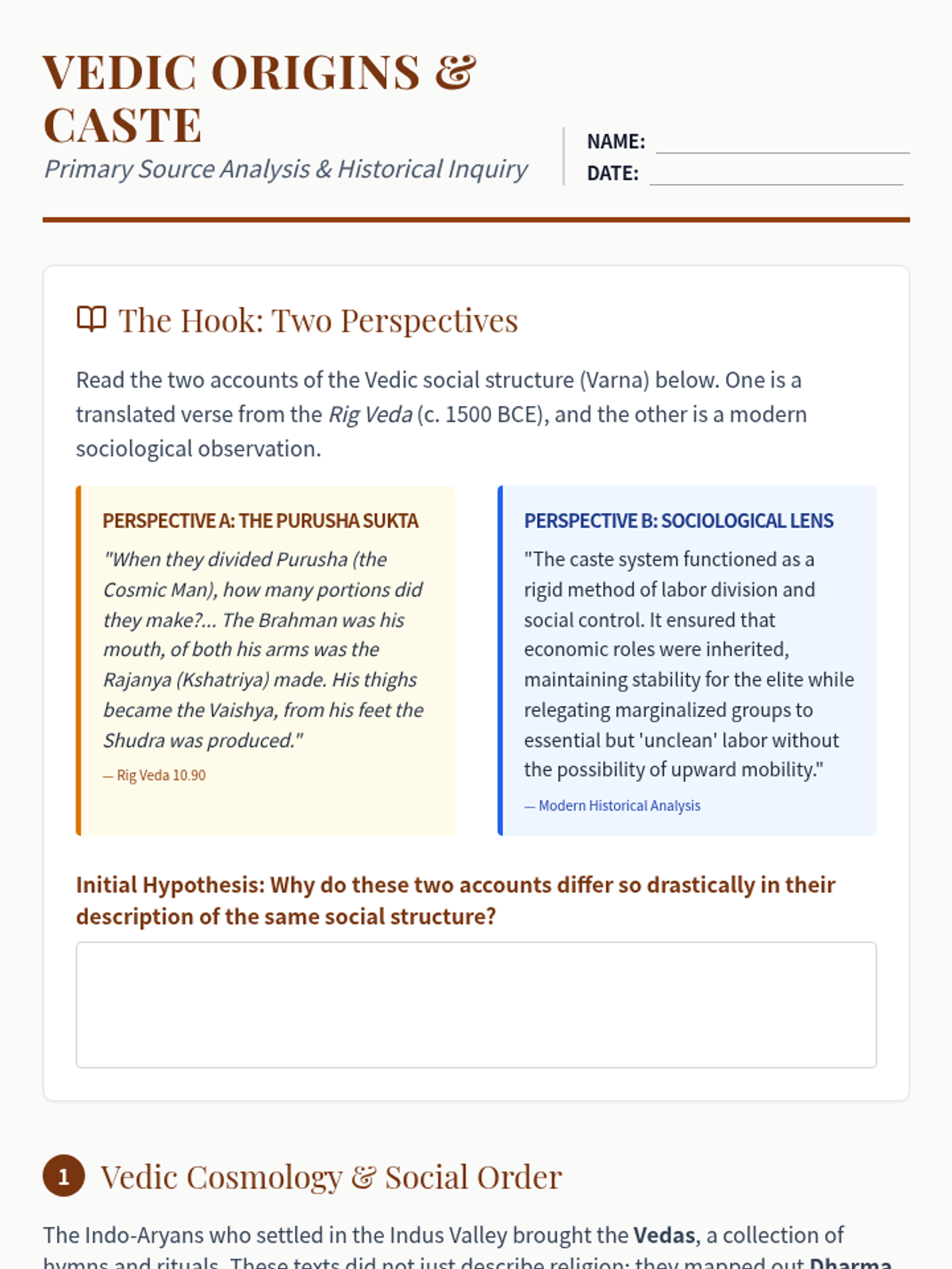 Students investigate the historical context of the Indus Valley Civilization and the Vedas to understand the origins of the caste system (Varna). They analyze primary texts to distinguish between theological justifications and sociological impacts.