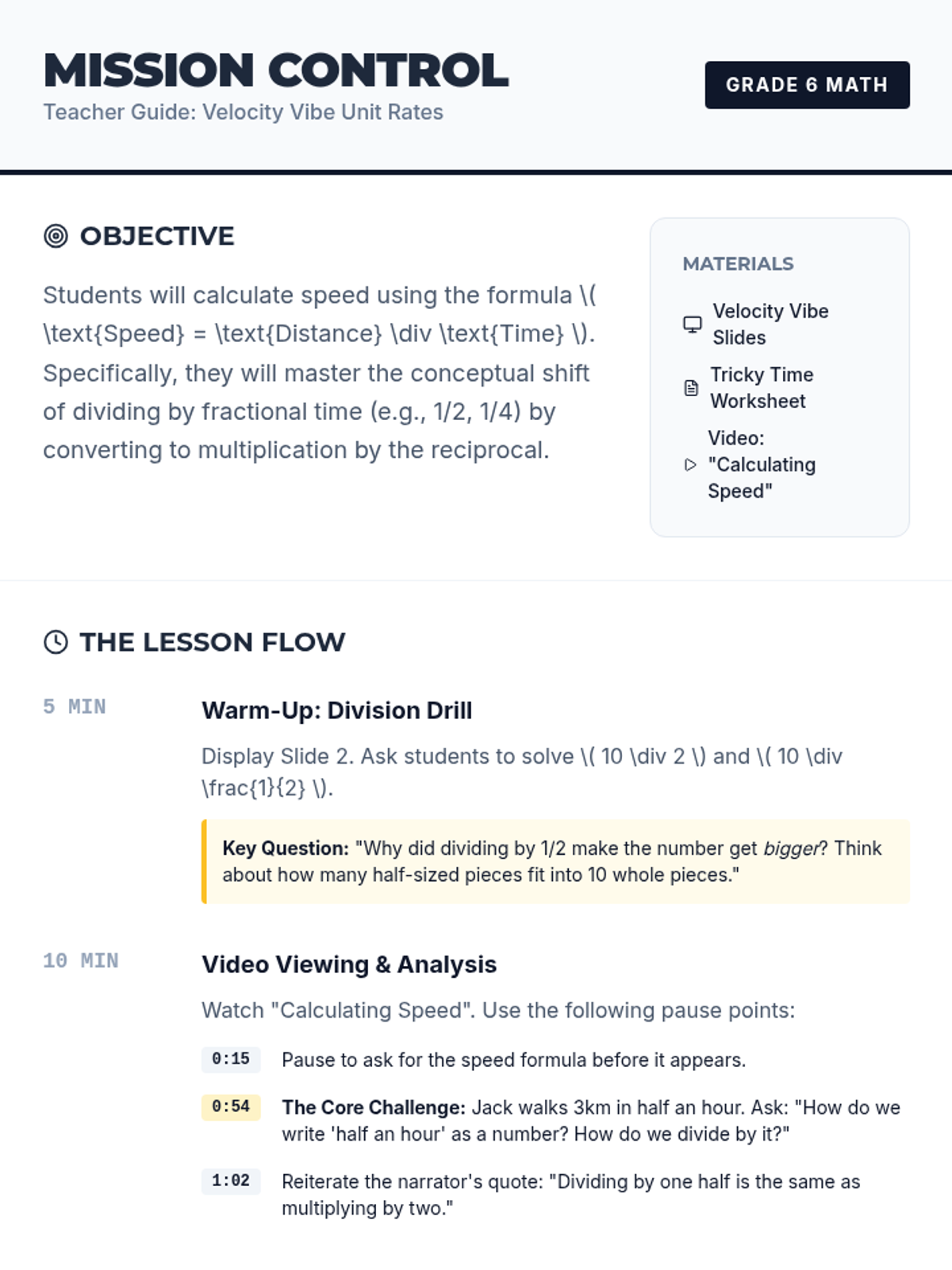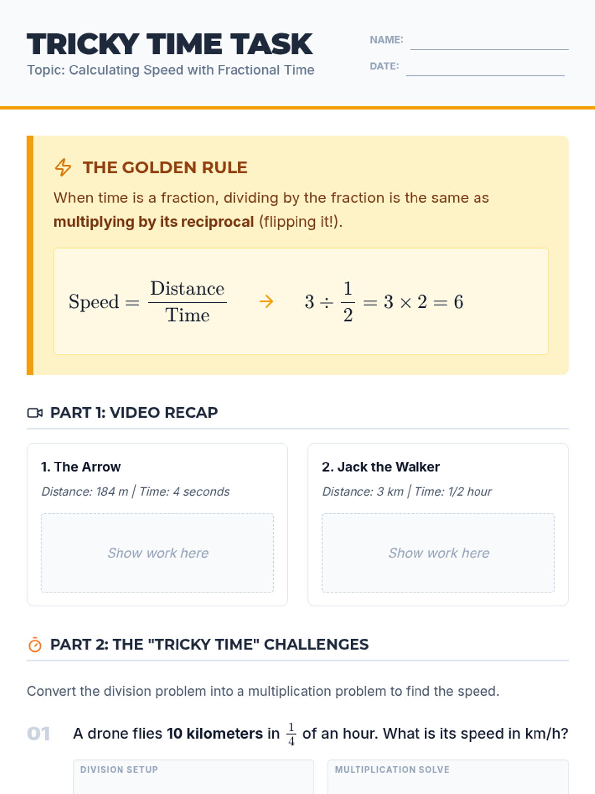 A high-energy 6th-grade lesson on calculating speed, specifically focusing on the conceptual challenge of dividing by fractional time. Students use the 'Calculating Speed' video to master the formula Speed = Distance / Time when time is given as fractions like 1/2 or 1/4.