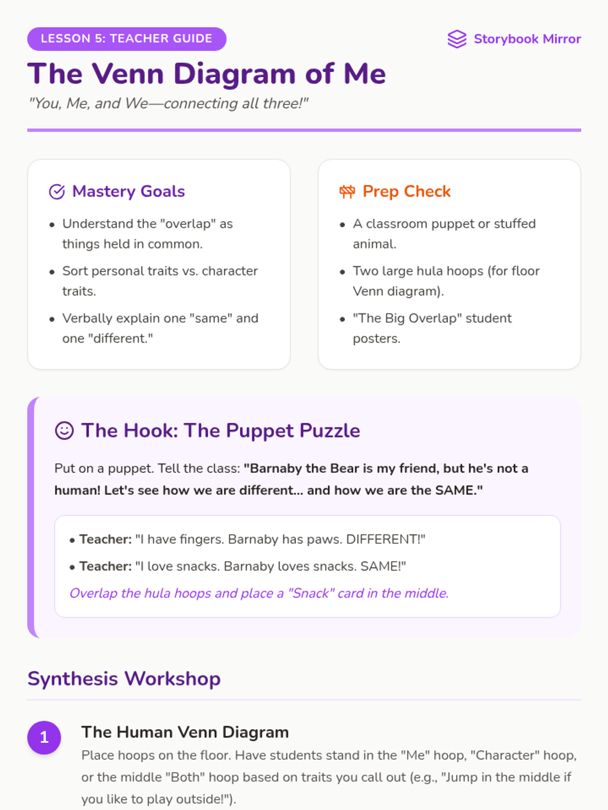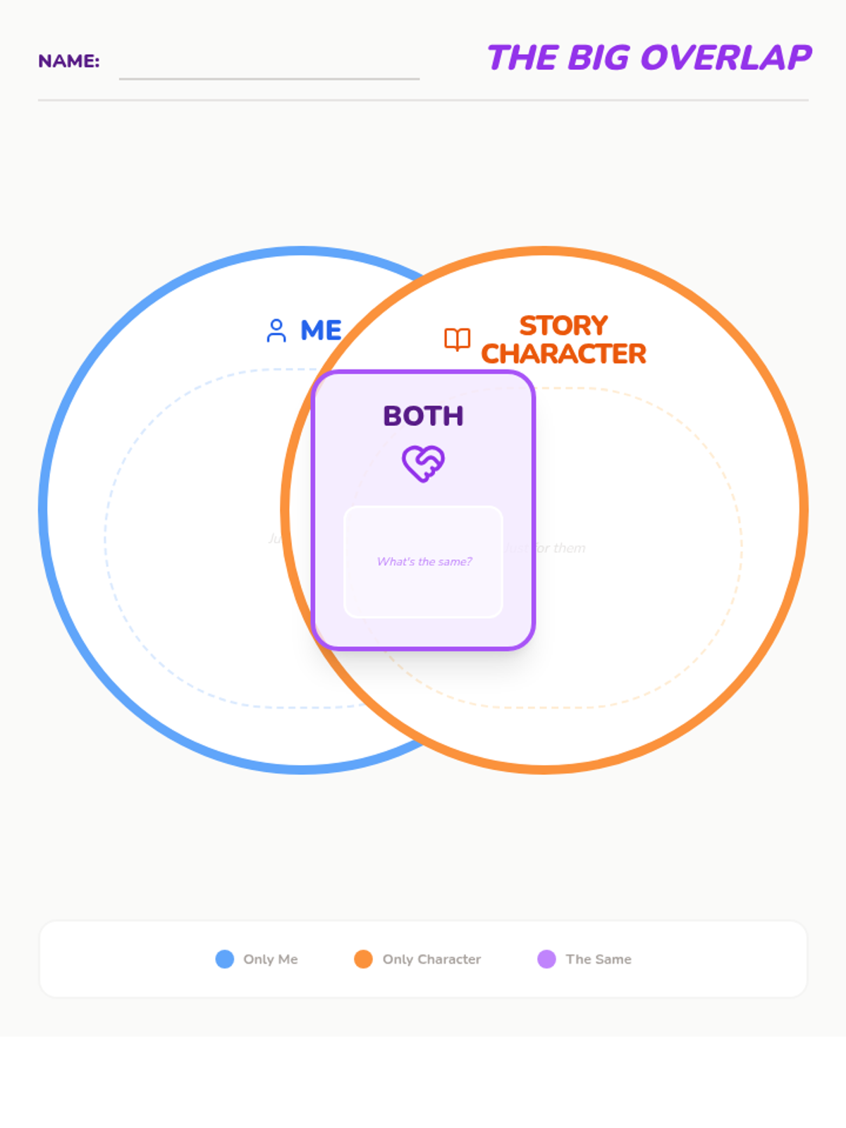 Students synthesize their learning by creating a simplified Venn diagram, identifying traits or experiences that are unique to a book character, unique to themselves, and shared by both.