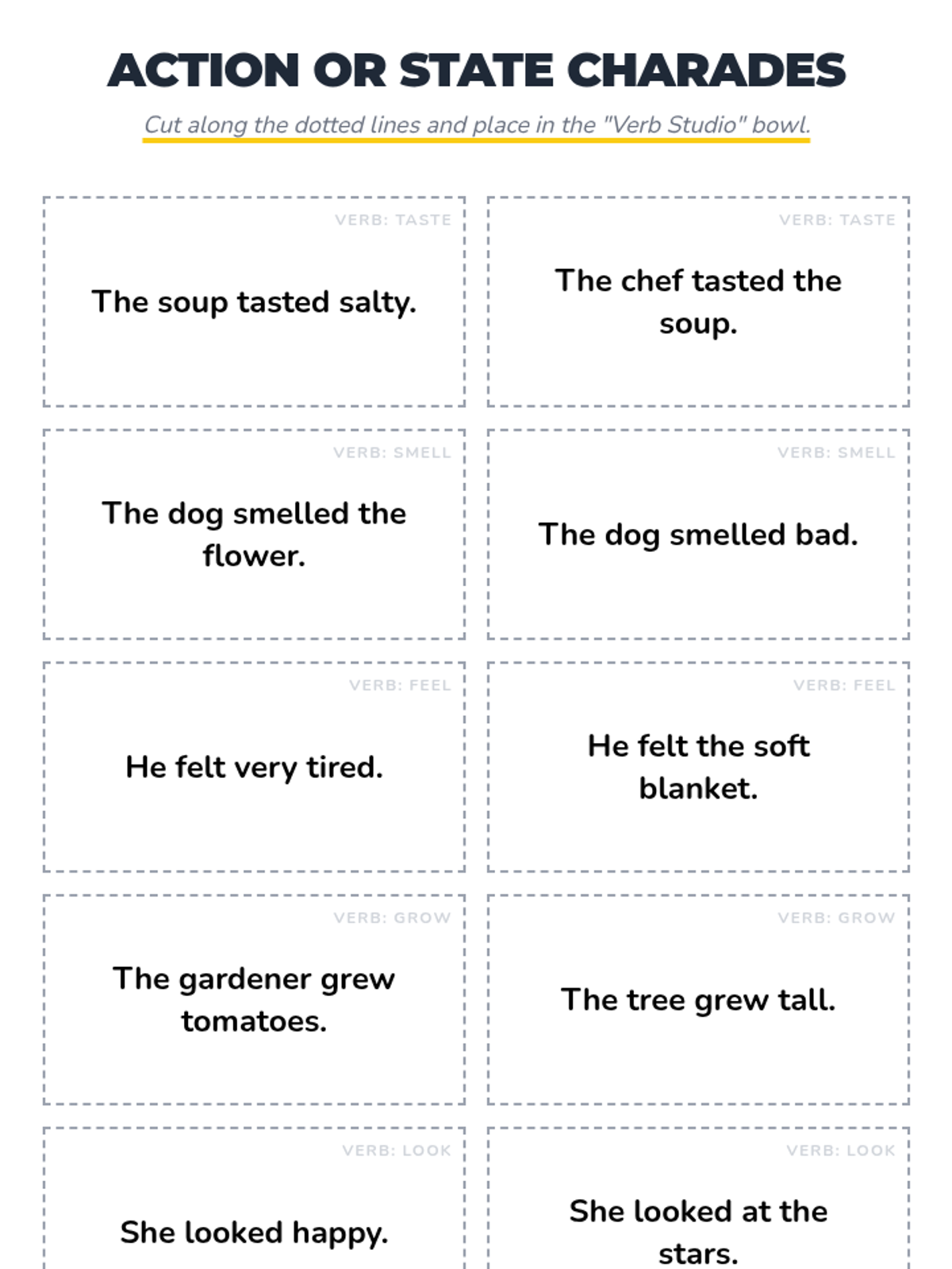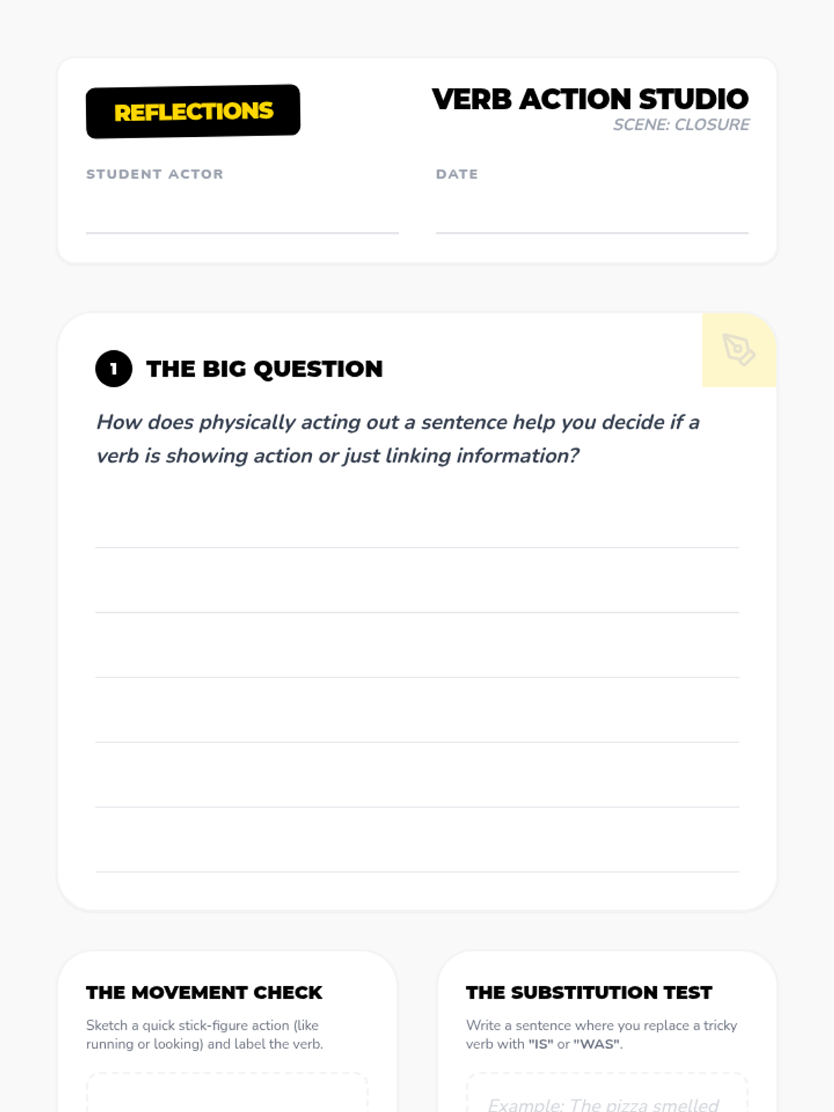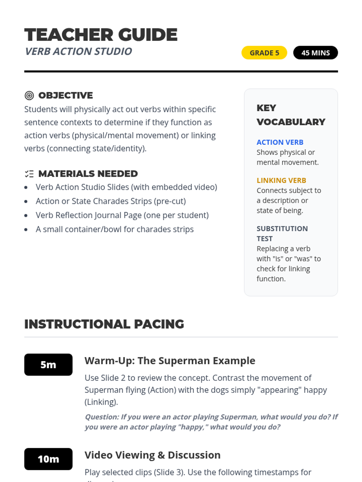 A high-energy, performance-based lesson where students use physical movement and charades to distinguish between action verbs and linking verbs. Inspired by the 'Movement means Action' rule, students act out sentences to test grammatical functions.