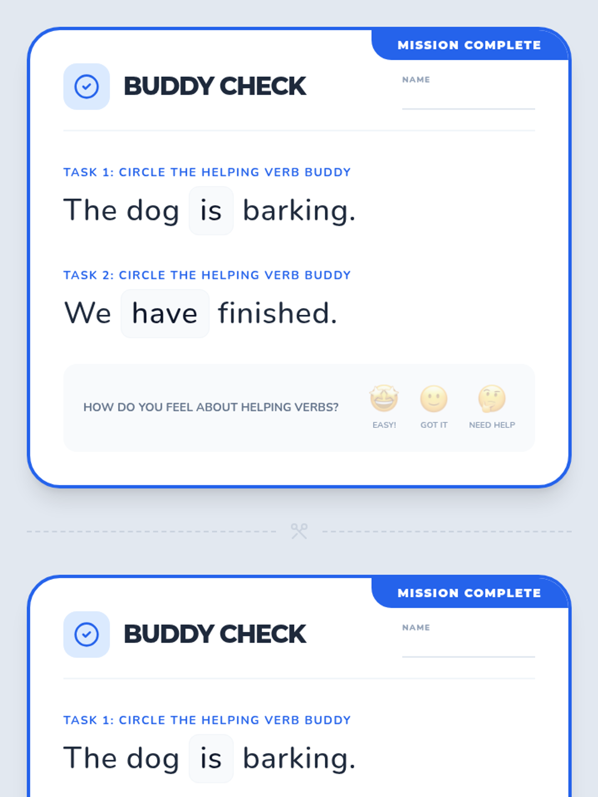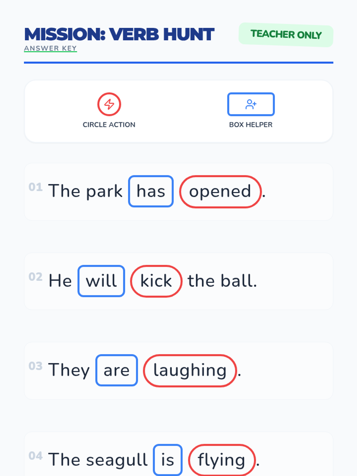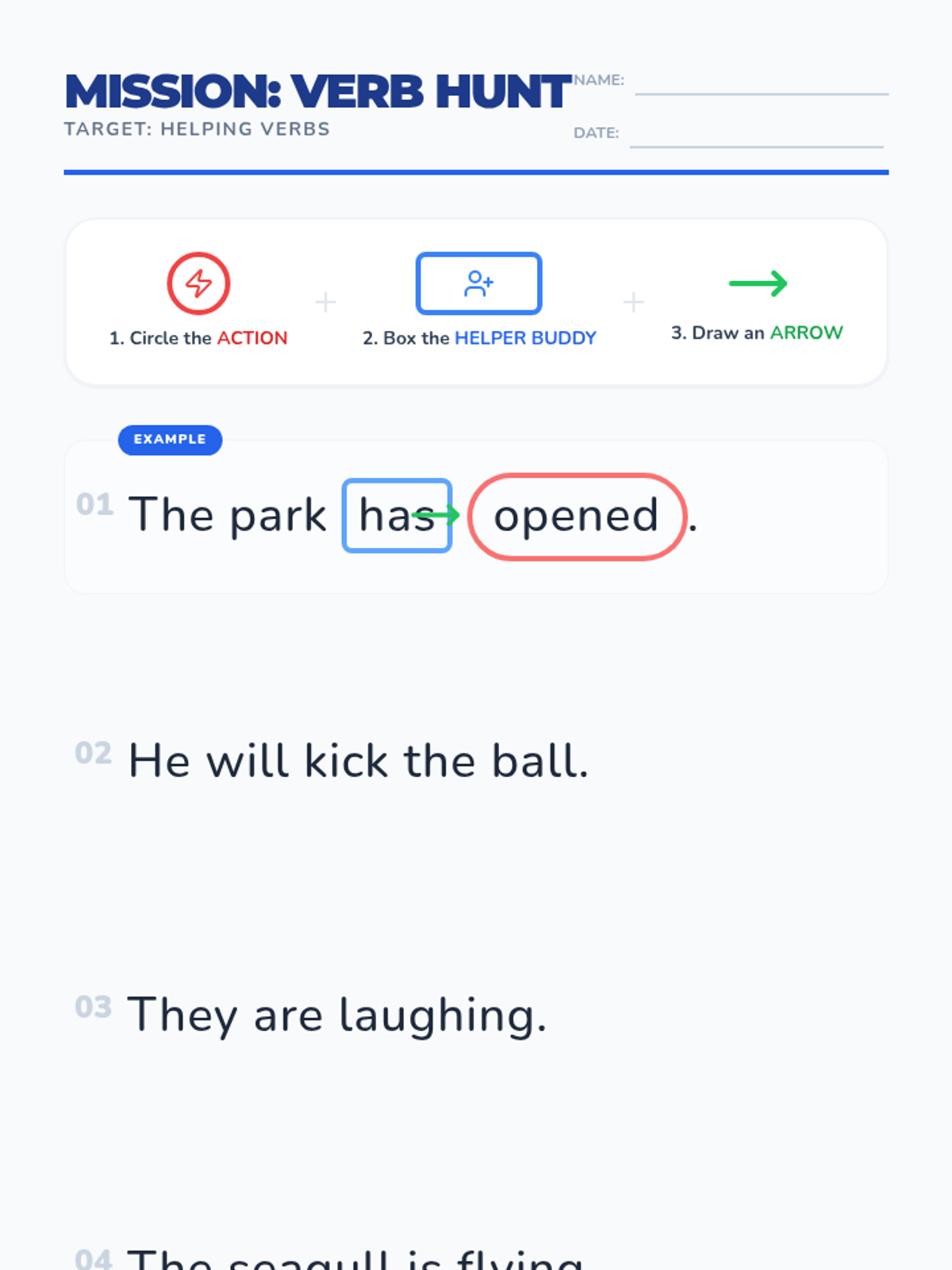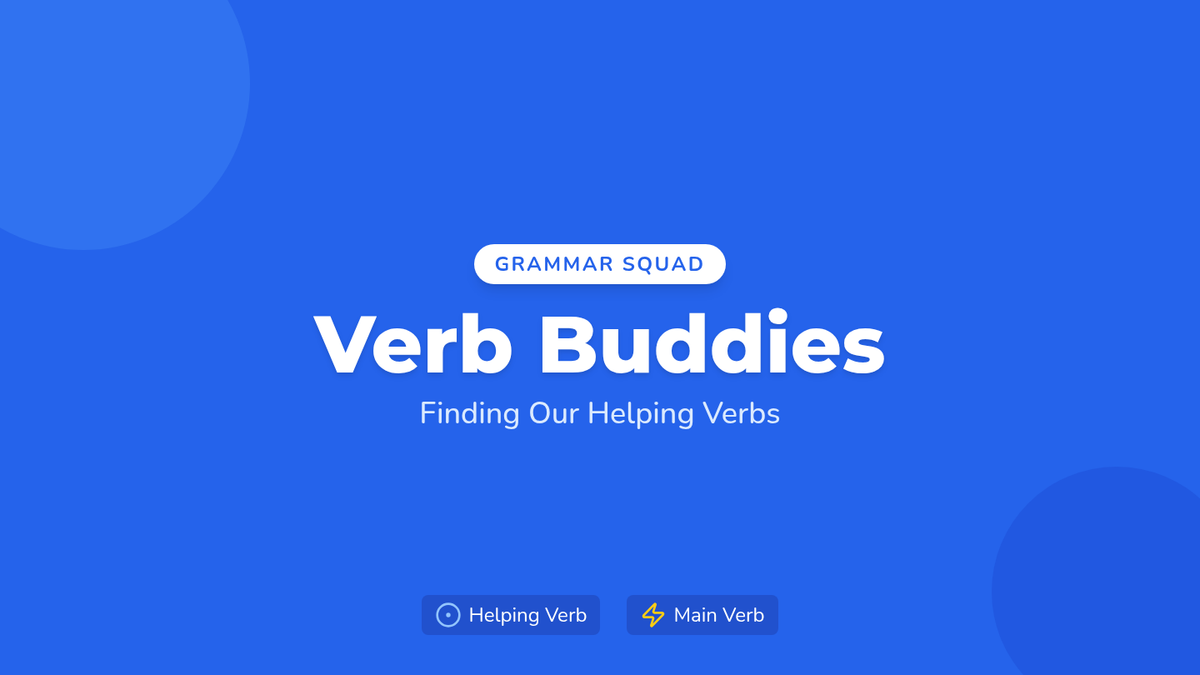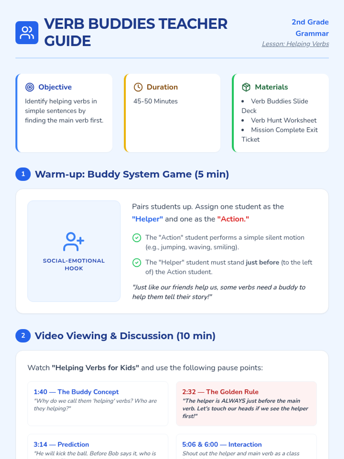 Students learn to identify helping verbs in simple sentences by first finding the action (main verb) and then locating its 'buddy' helper right before it. The lesson uses a friendship-themed analogy and interactive video practice.