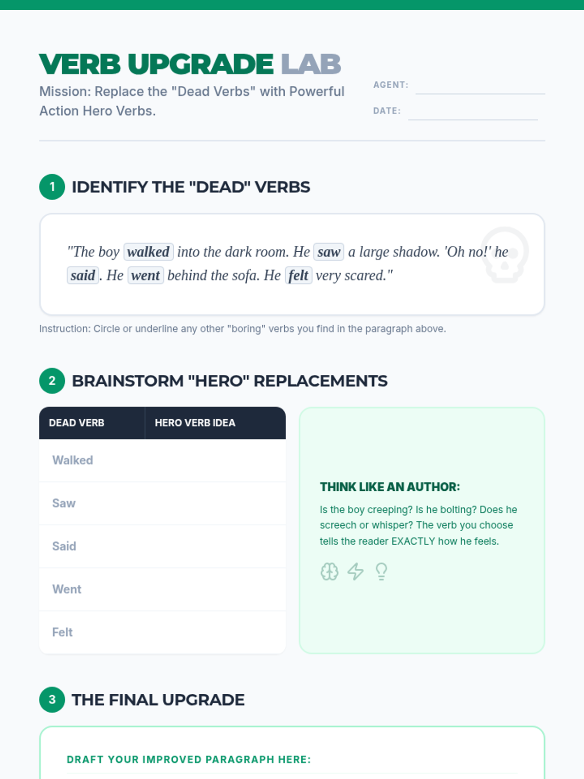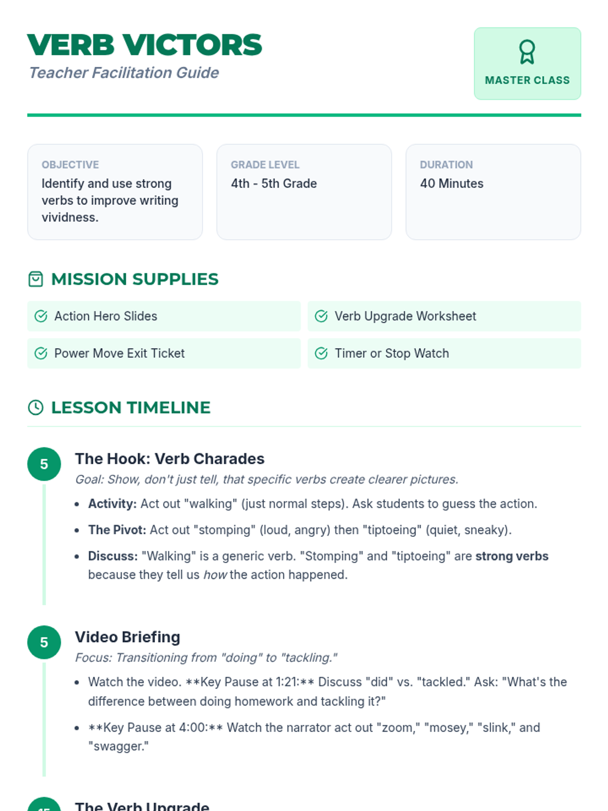 A high-energy lesson for upper elementary students focused on replacing weak 'dead' verbs with vivid, powerful action words to enhance writing quality and reader engagement.