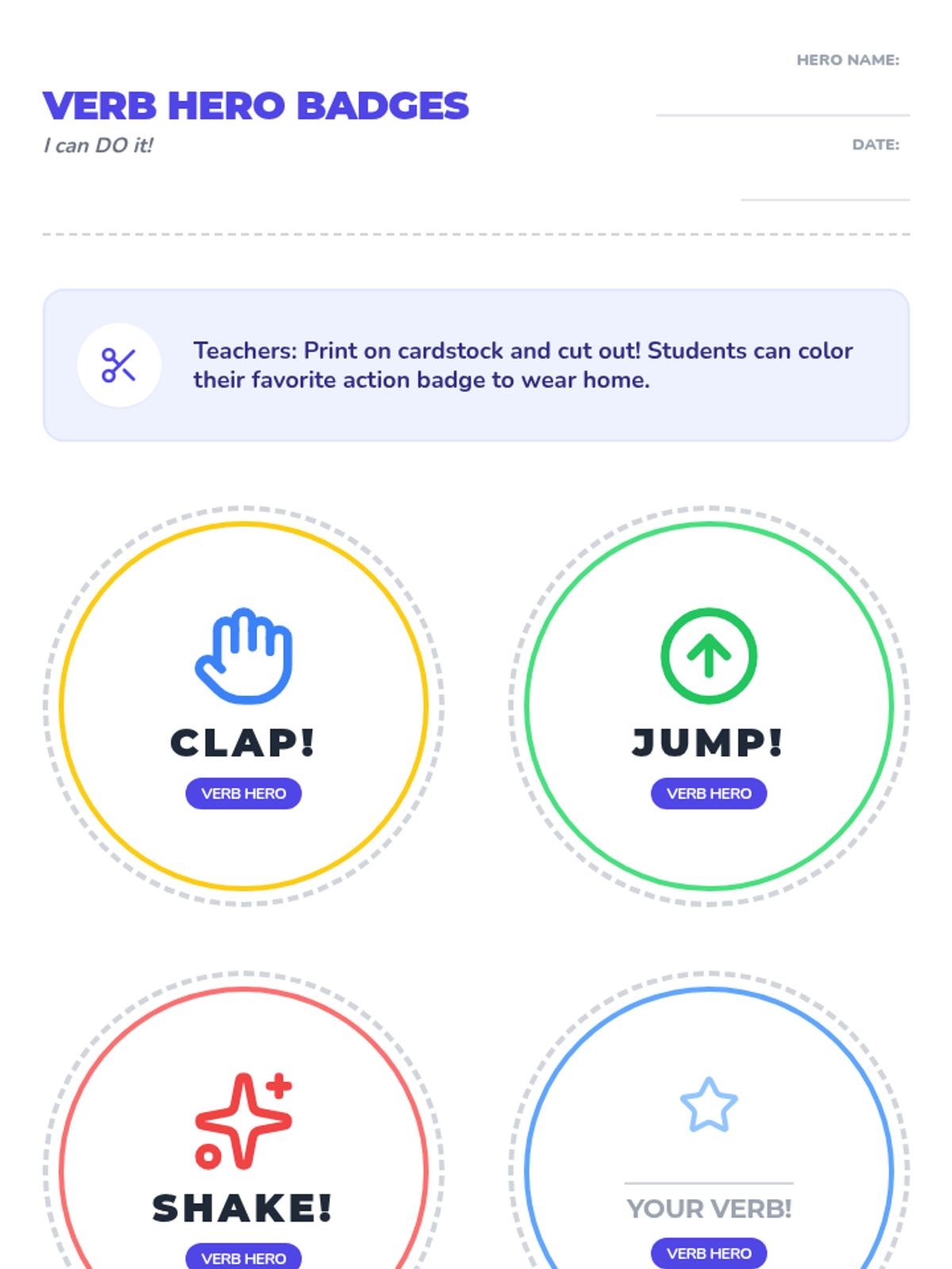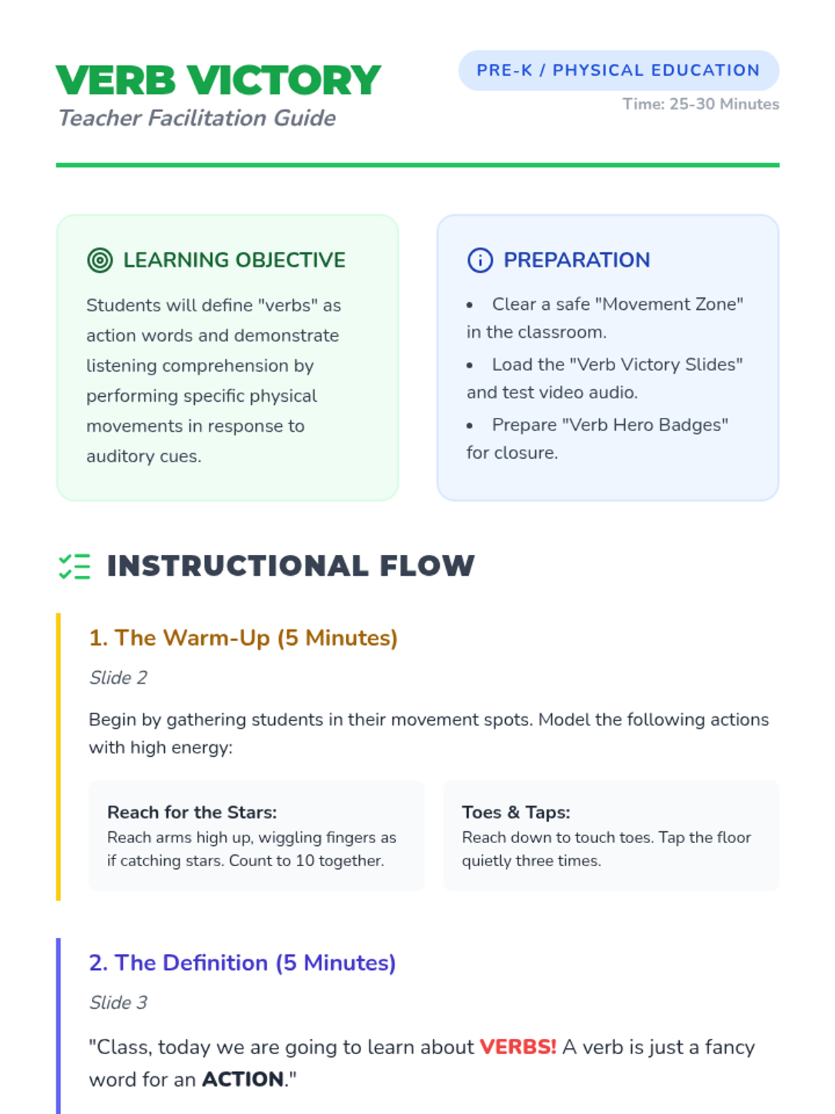A high-energy lesson for Pre-K students to develop gross motor skills and listening comprehension through action-packed music and games. Students will learn the concept of verbs as 'action words' while moving their bodies to the 'Verb Rap Song'.
