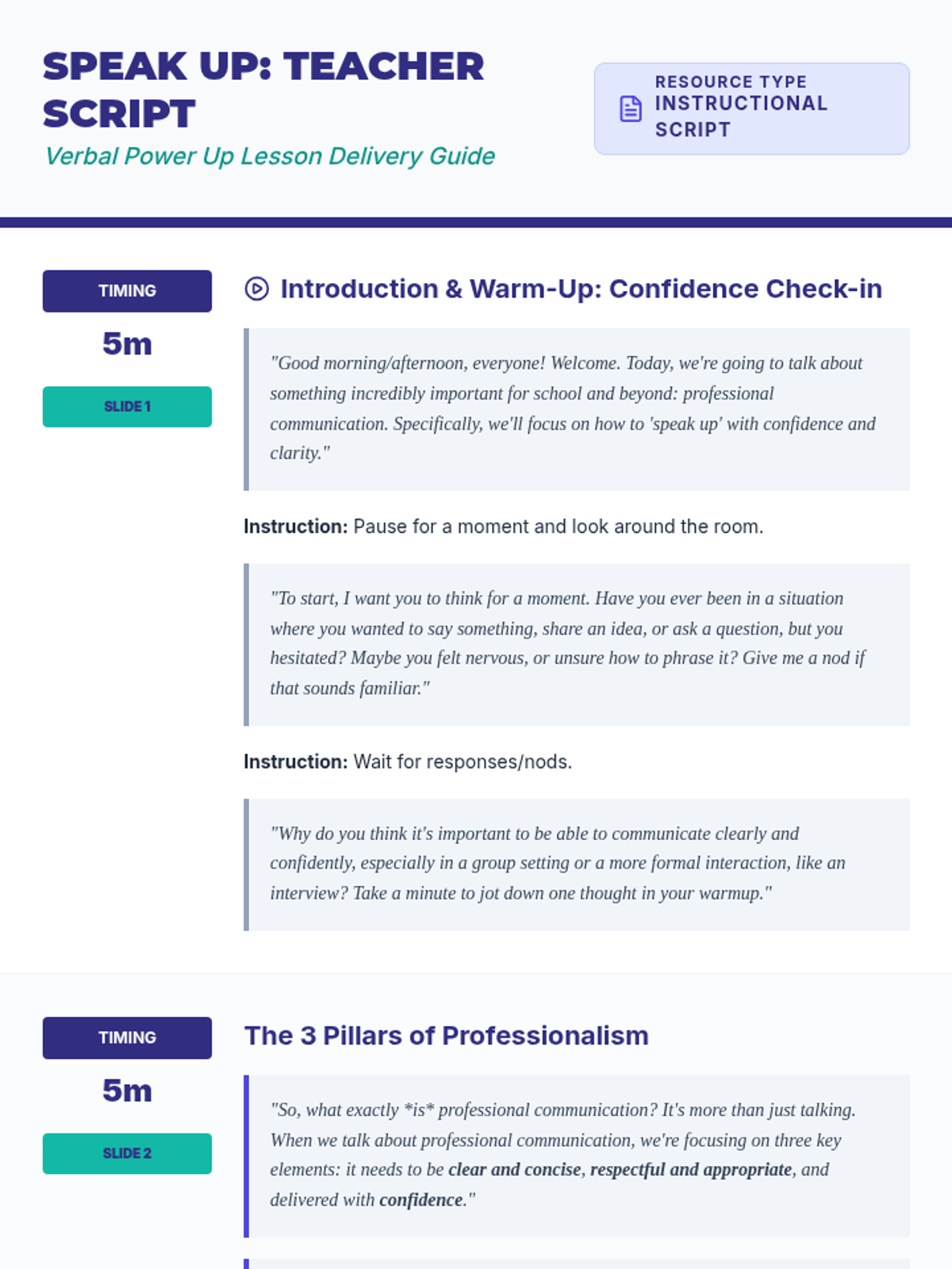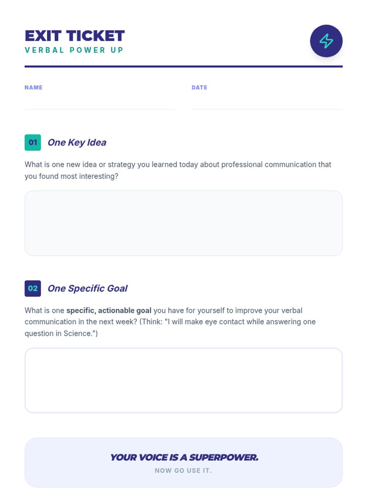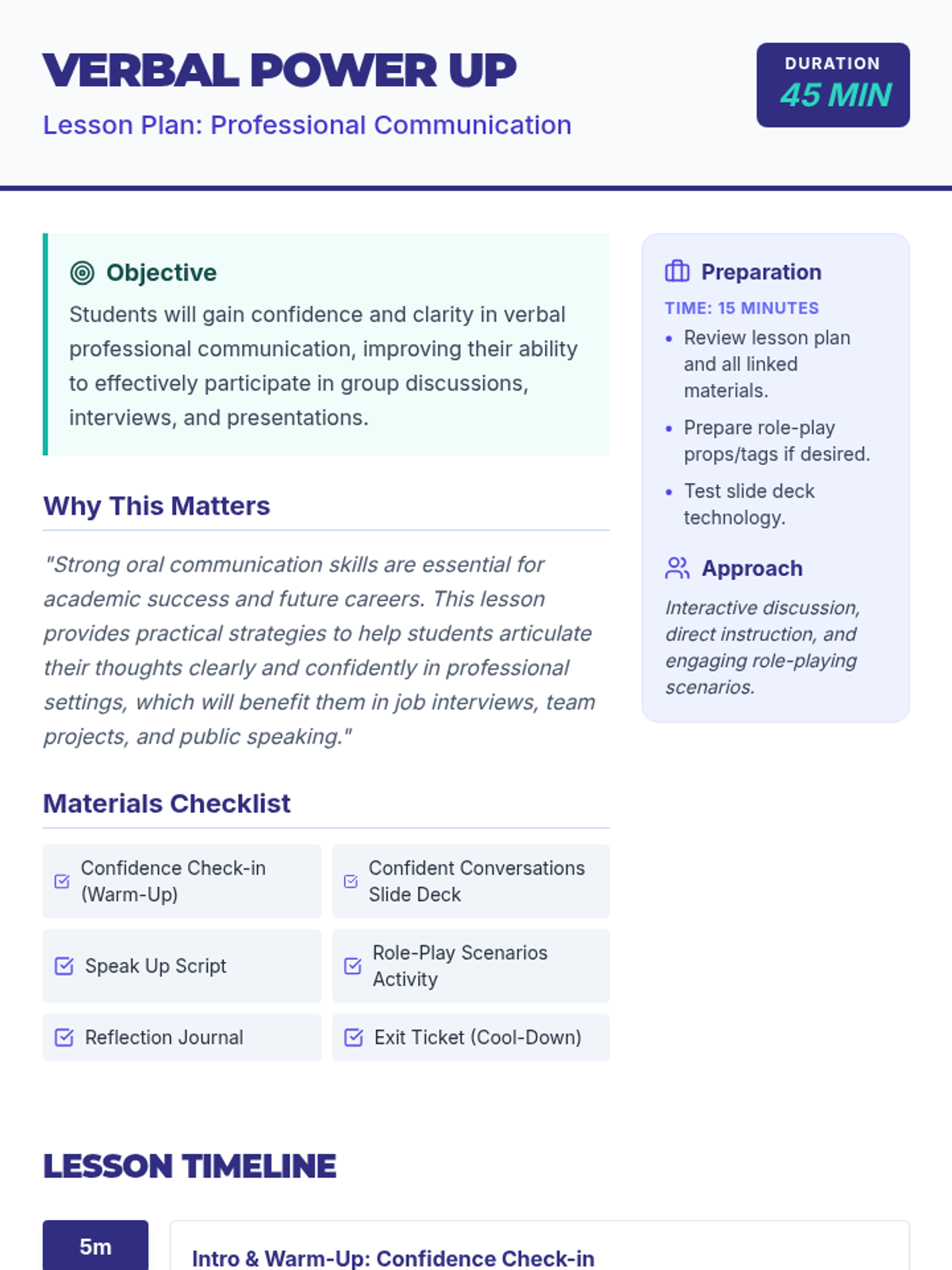 A 45-minute workshop designed to help 10th-grade students build confidence and clarity in verbal professional communication, specifically for group settings, interviews, and presentations.