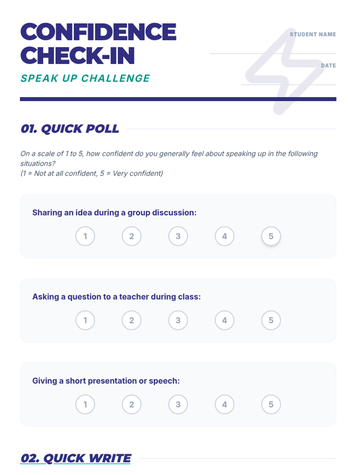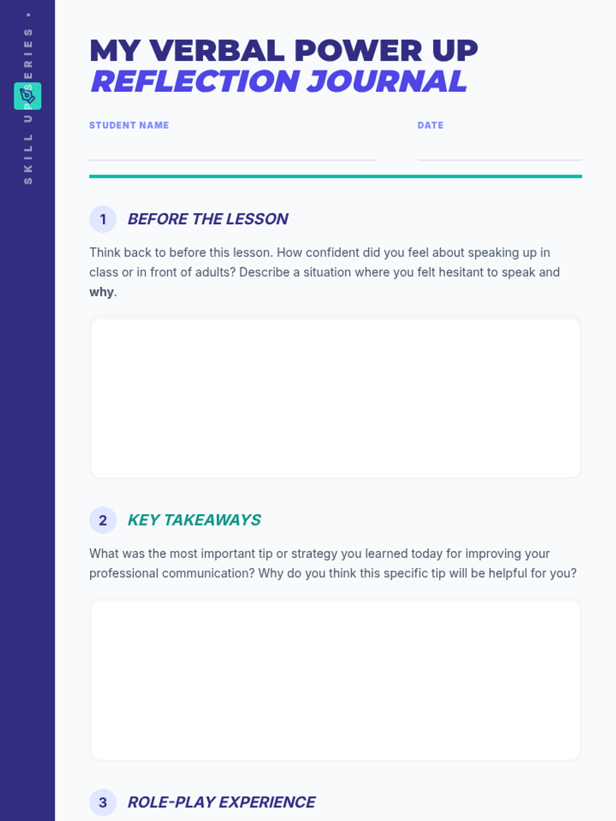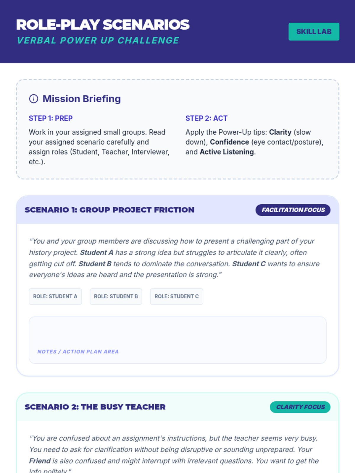 A 45-minute workshop designed to help 10th-grade students build confidence and clarity in verbal professional communication, specifically for group settings, interviews, and presentations.