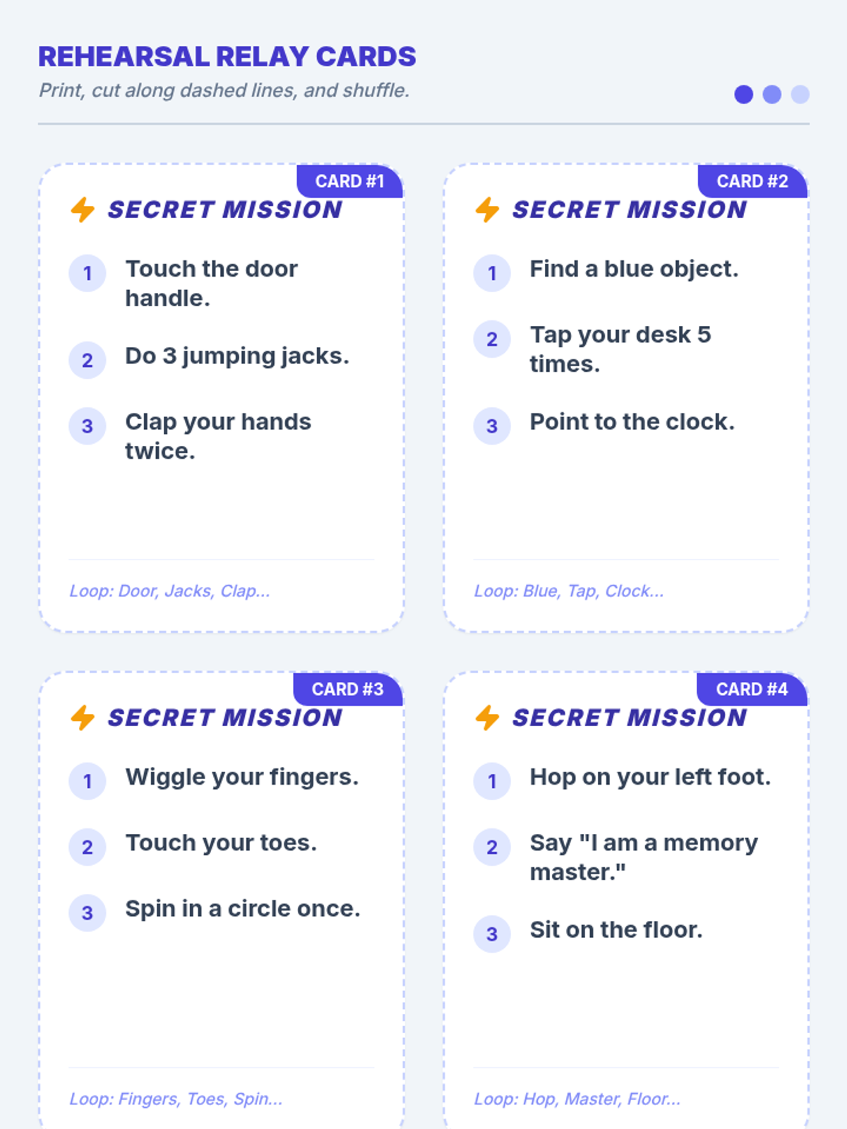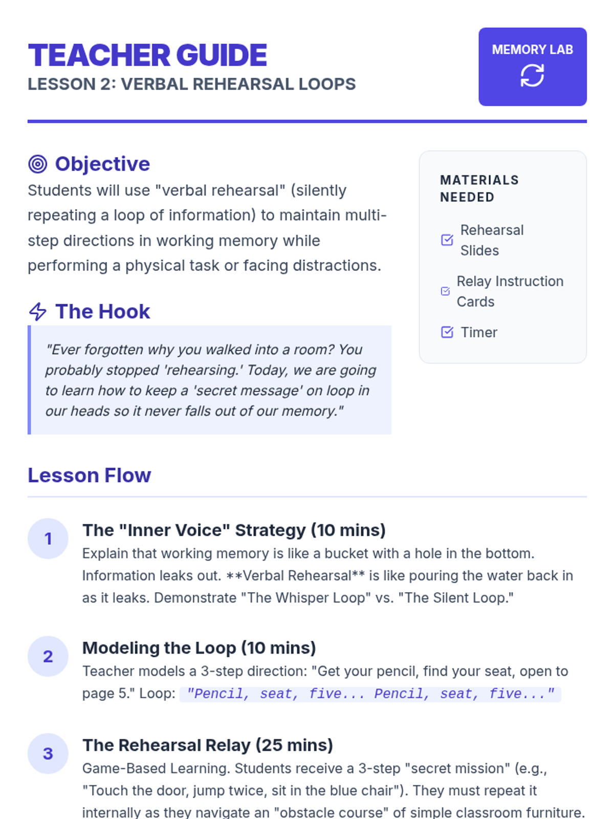 Students practice using an 'inner voice' to repeat instructions internally, maintaining focus during tasks that involve physical movement or potential distractions.