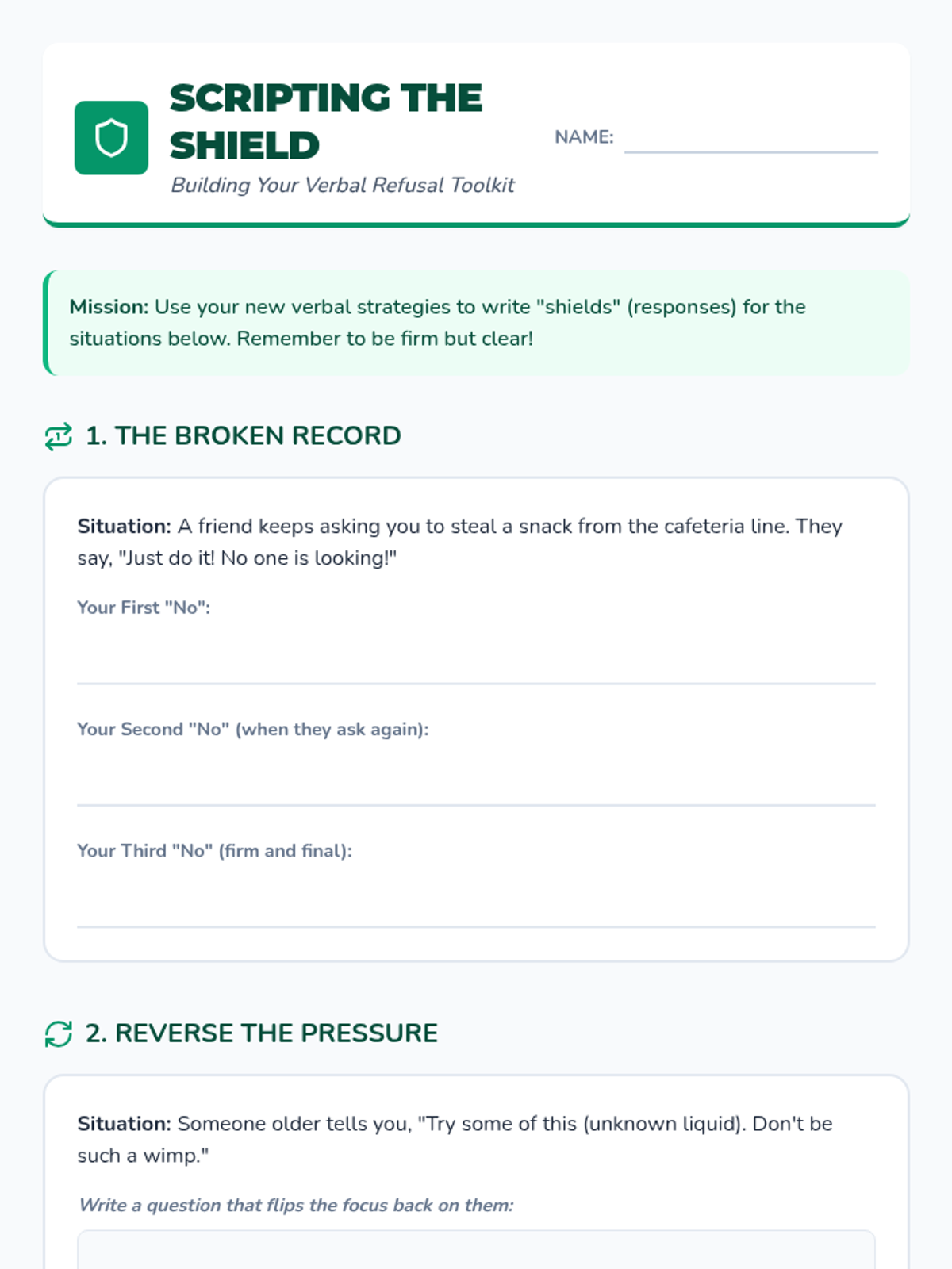 This lesson introduces specific verbal techniques such as the 'Broken Record,' 'Reverse the Pressure,' and 'Better Alternative' methods. Students practice scripting responses to ensure they have ready-made phrases for high-risk situations.