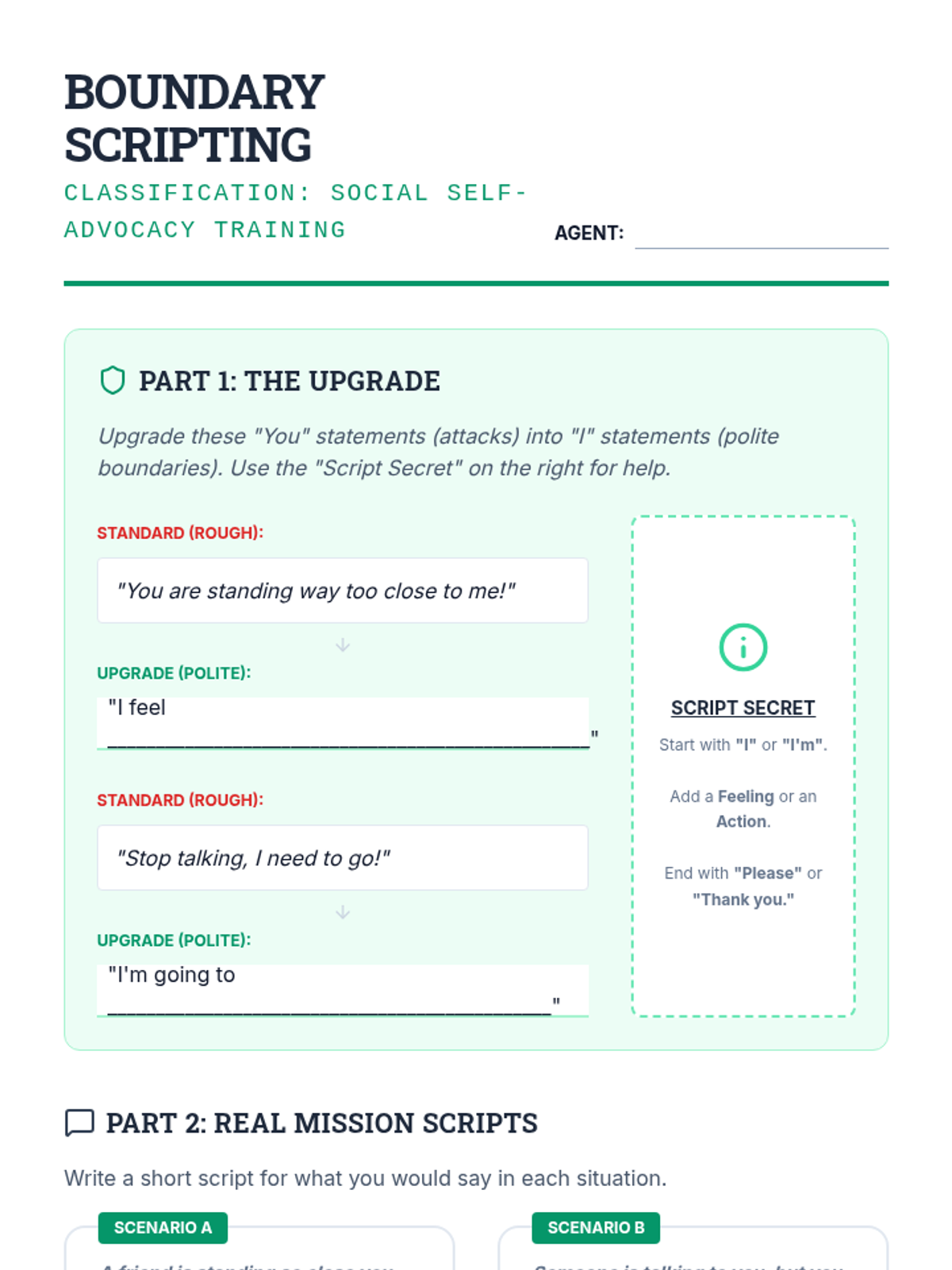 Students learn and practice polite scripts to self-advocate for their own personal space and boundary needs.