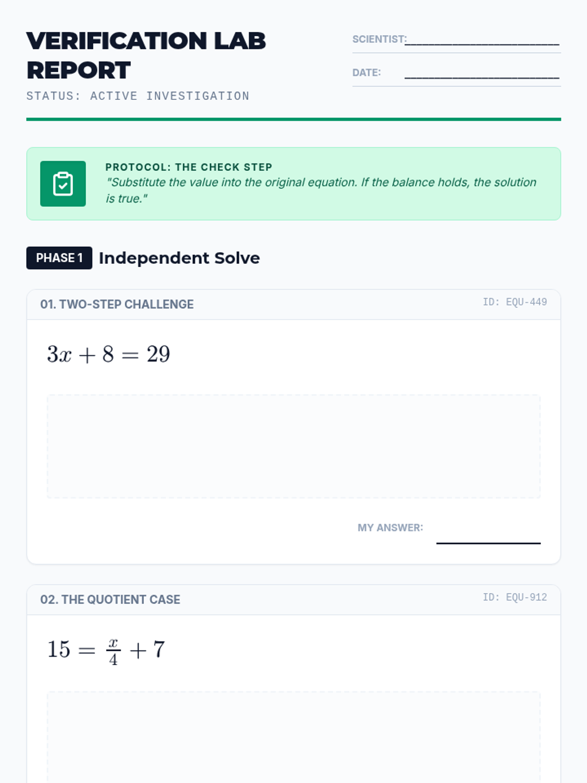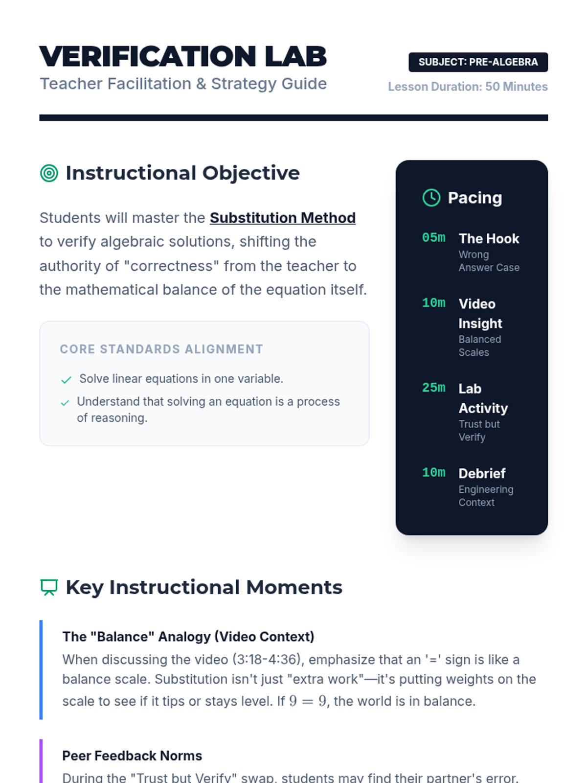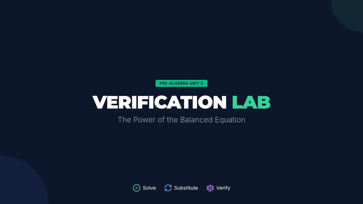 A Pre-Algebra lesson focused on the critical skill of verifying solutions through substitution, featuring a 'Trust but Verify' collaborative activity and video-based instruction on balanced equations.