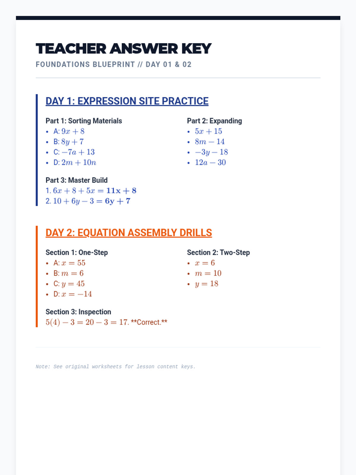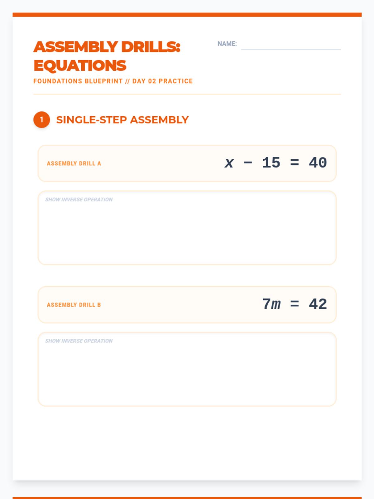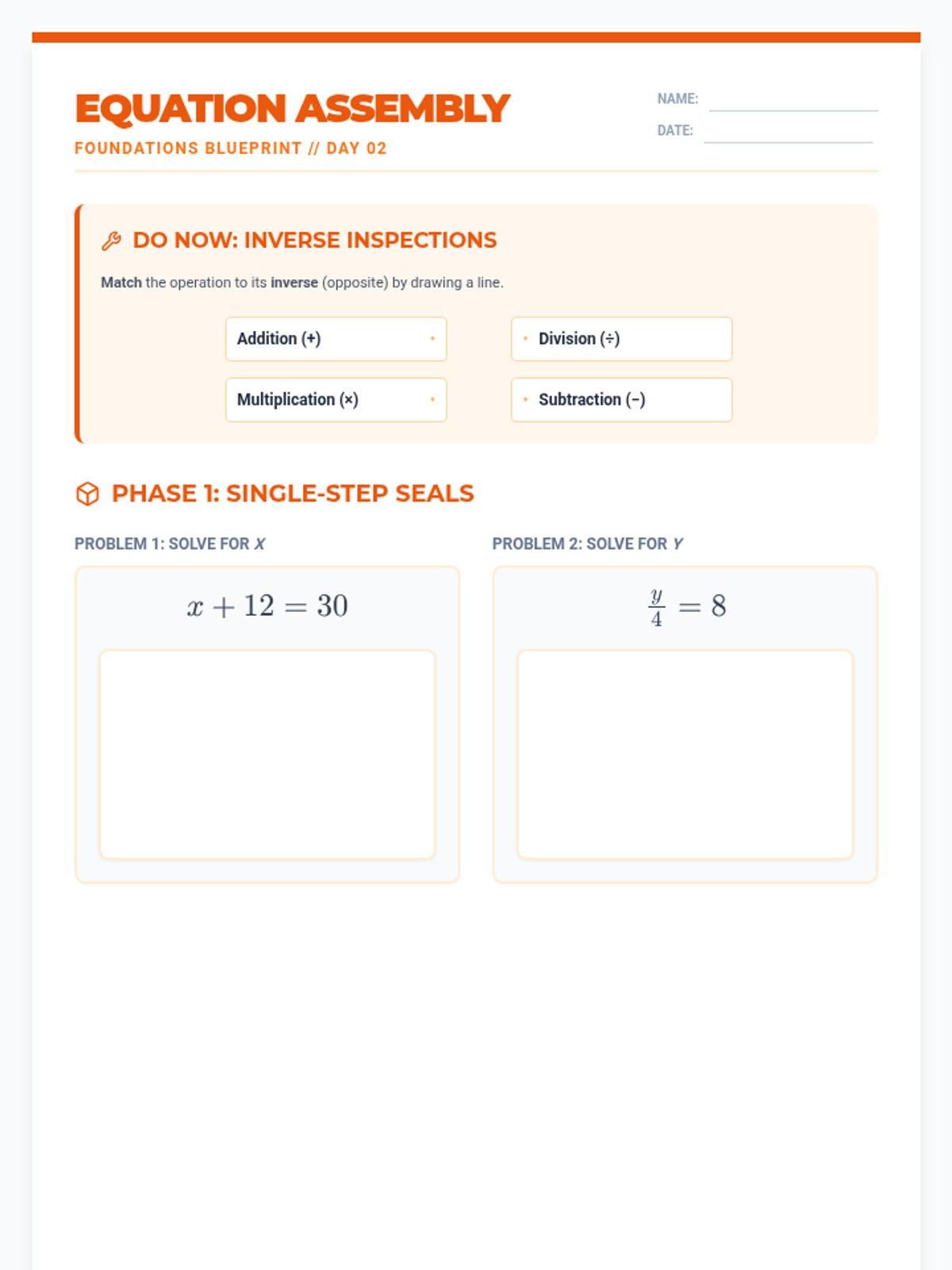 Covers solving one-step and two-step equations using inverse operations and verifying solutions through substitution.