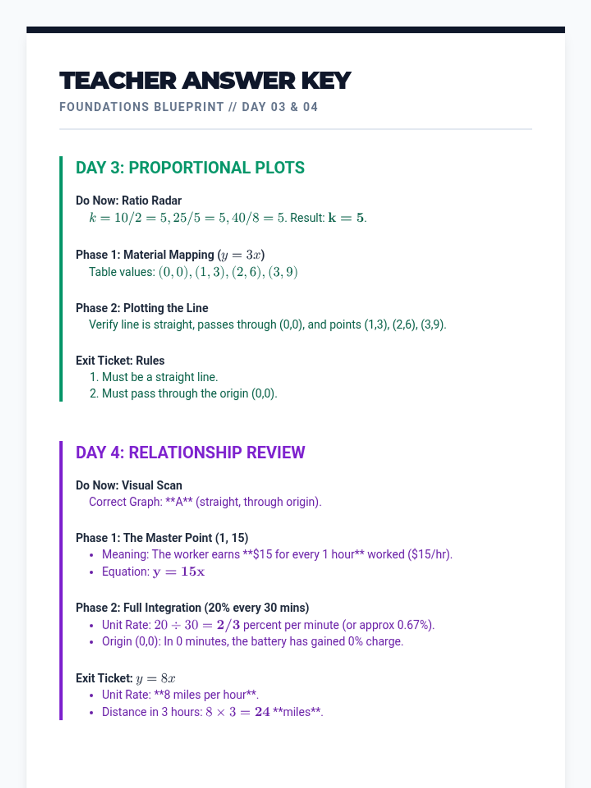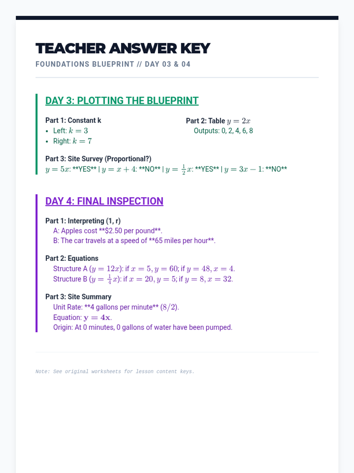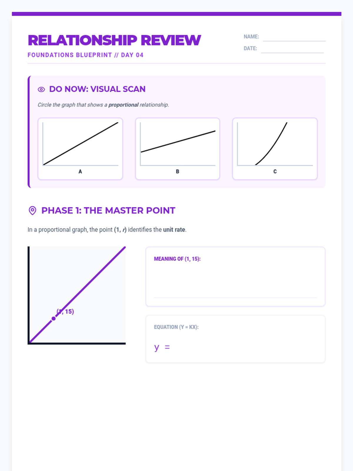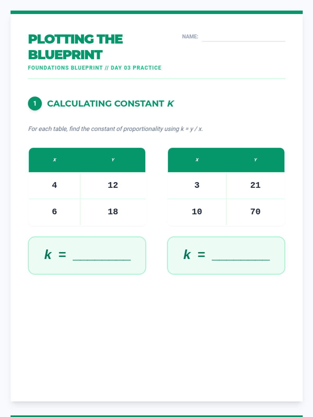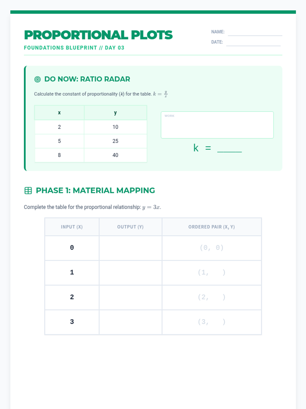 Students identify the constant of proportionality from tables and translate proportional relationships onto coordinate planes.