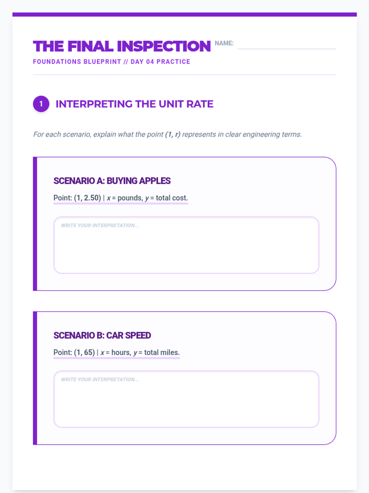 In-depth look at interpreting points on a proportional graph, specifically the unit rate (1, r) and the origin (0, 0).