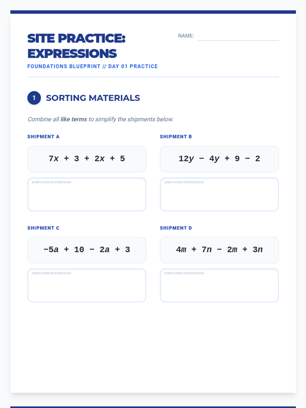 Focuses on identifying terms, combining like terms, and applying the distributive property to simplify algebraic expressions.