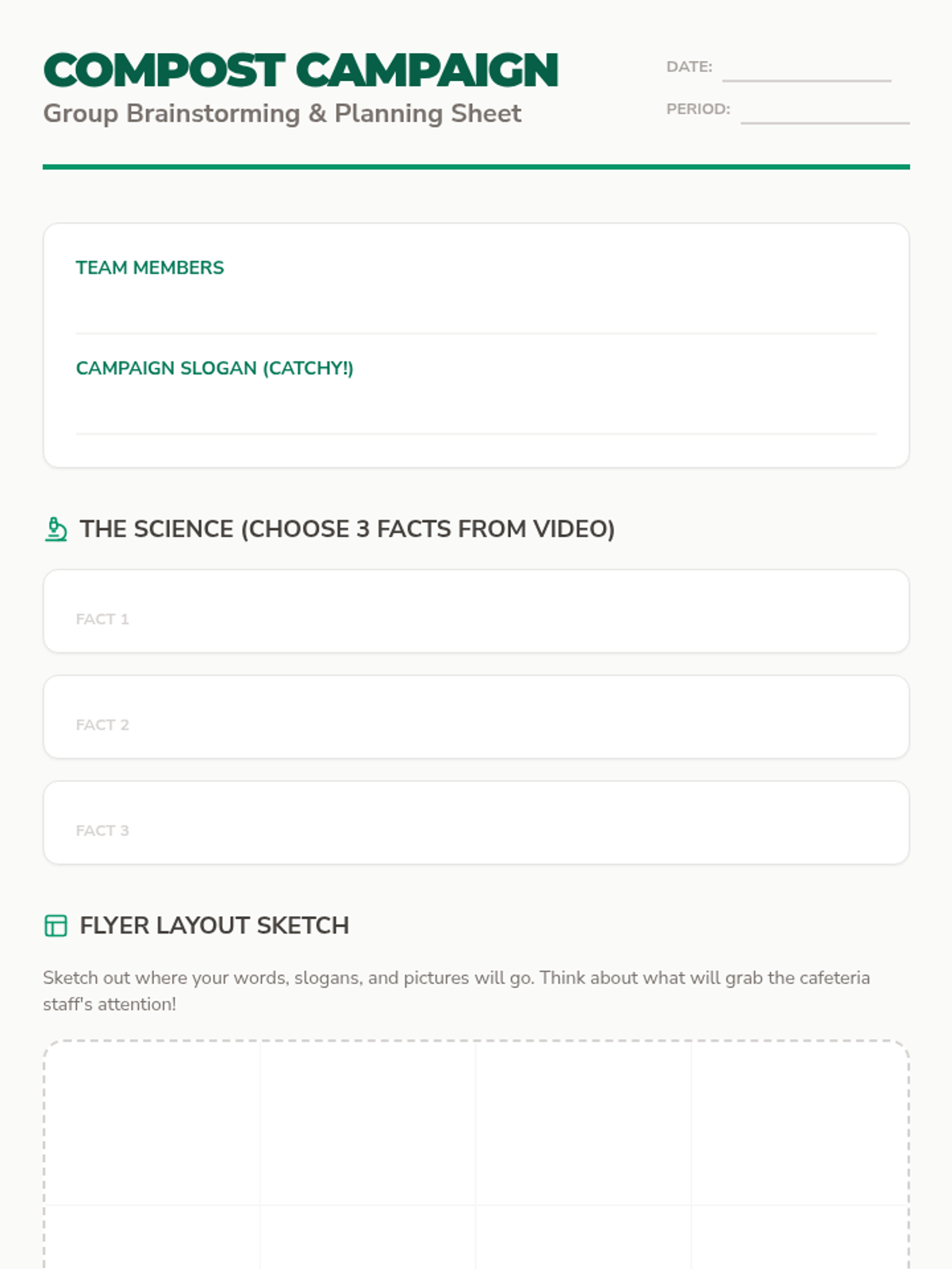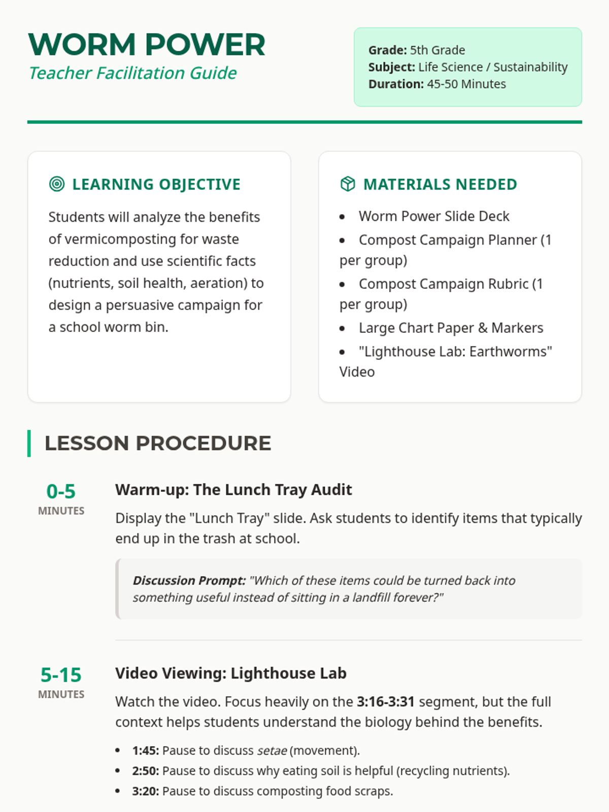 Students will investigate the ecological benefits of earthworms and vermicomposting through a hands-on 'Compost Campaign' design project, using scientific facts to persuade their school to reduce food waste.