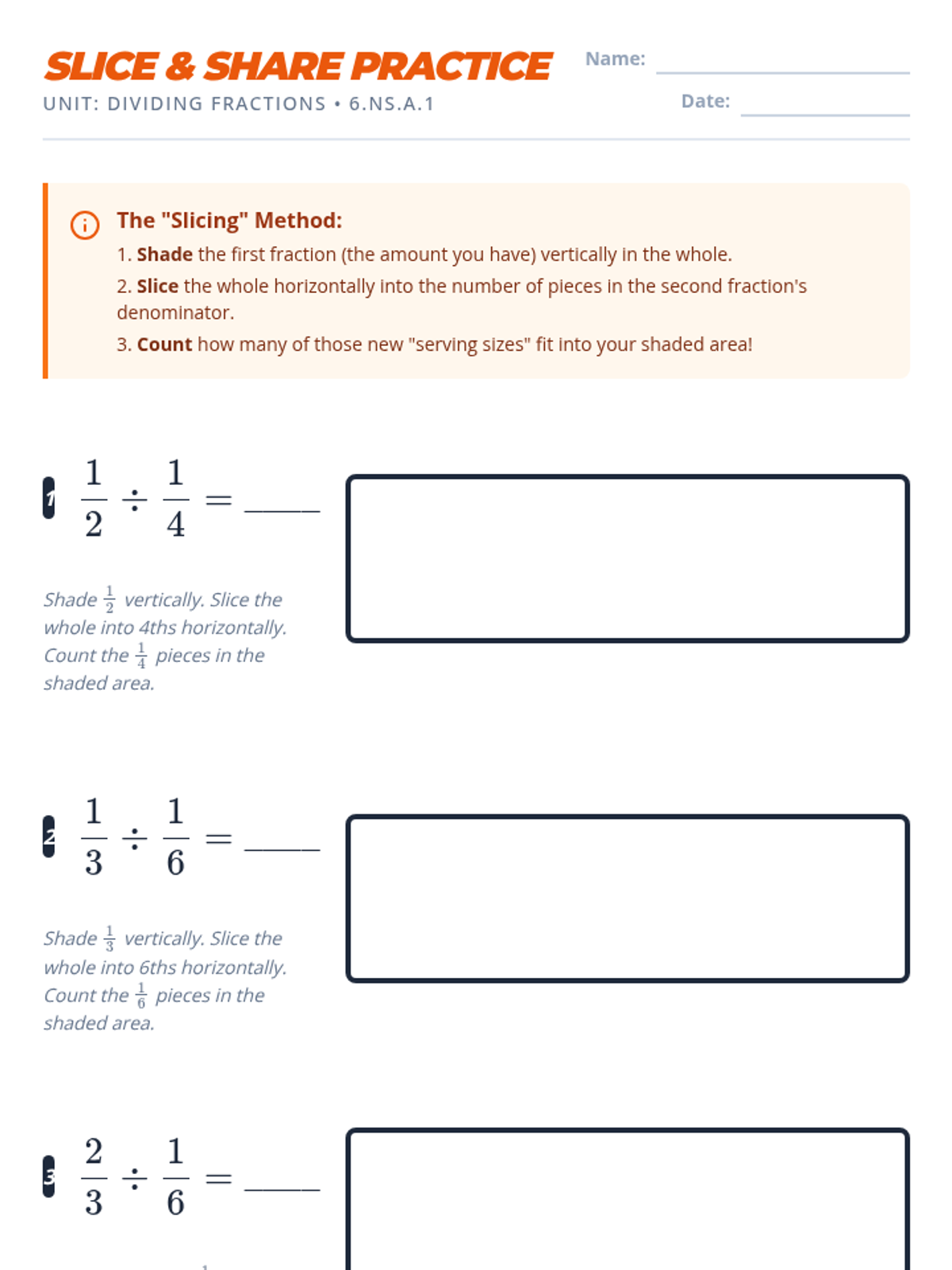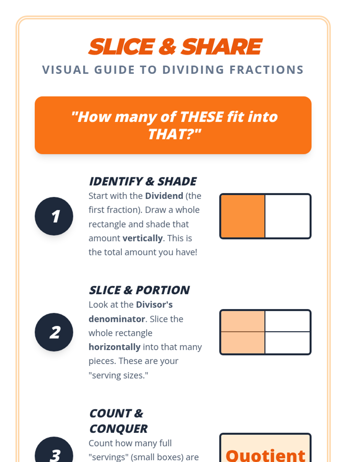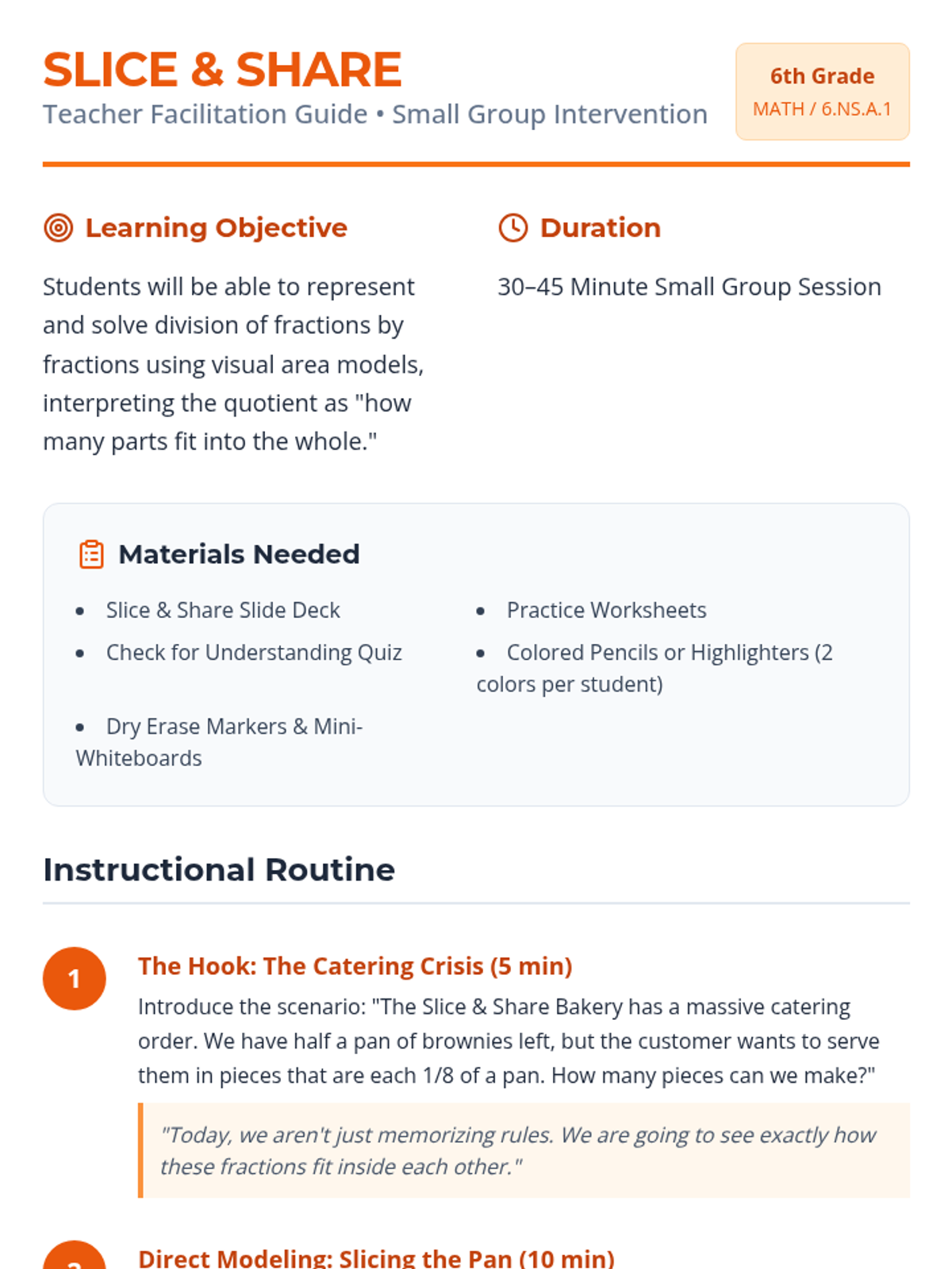 A targeted small-group intervention lesson focusing on dividing fractions using visual area models to build conceptual understanding. Students will 'slice and share' to visualize how many times one fractional part fits into another.