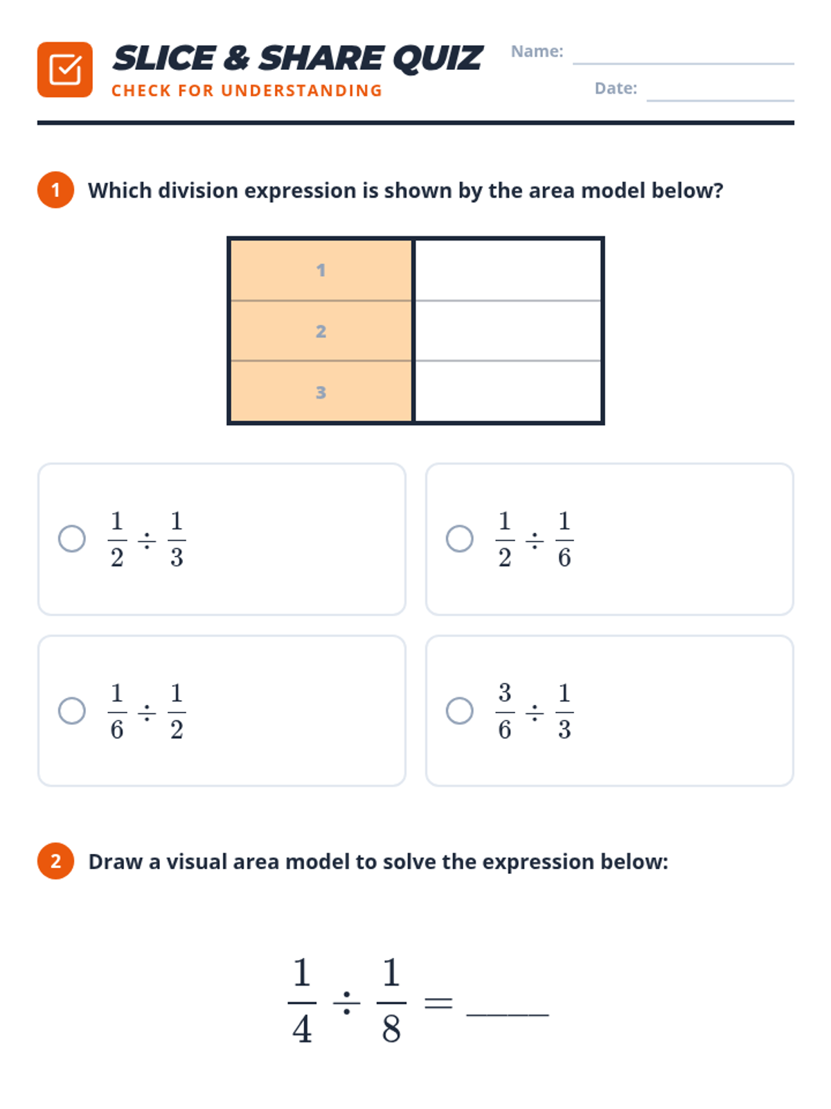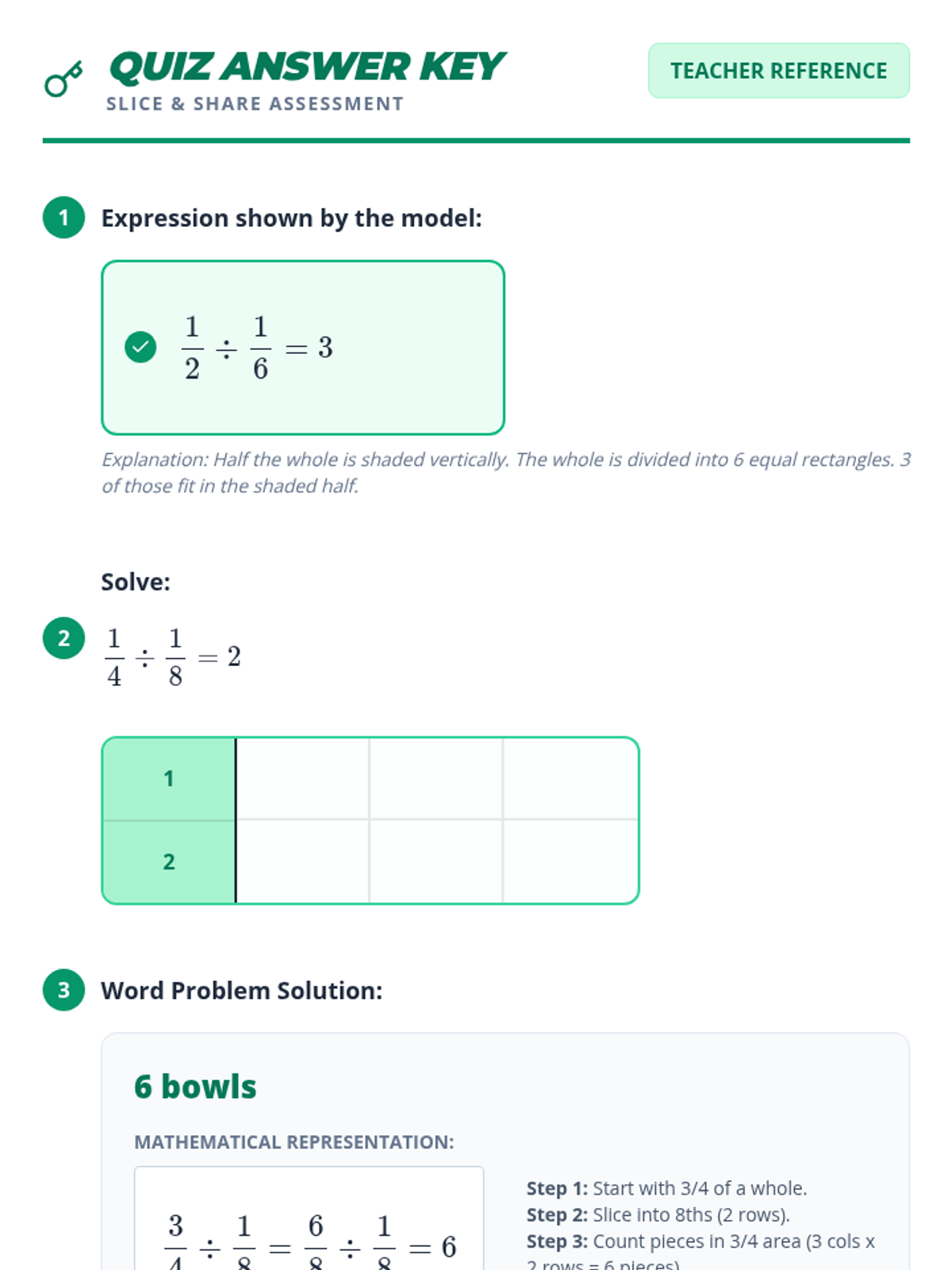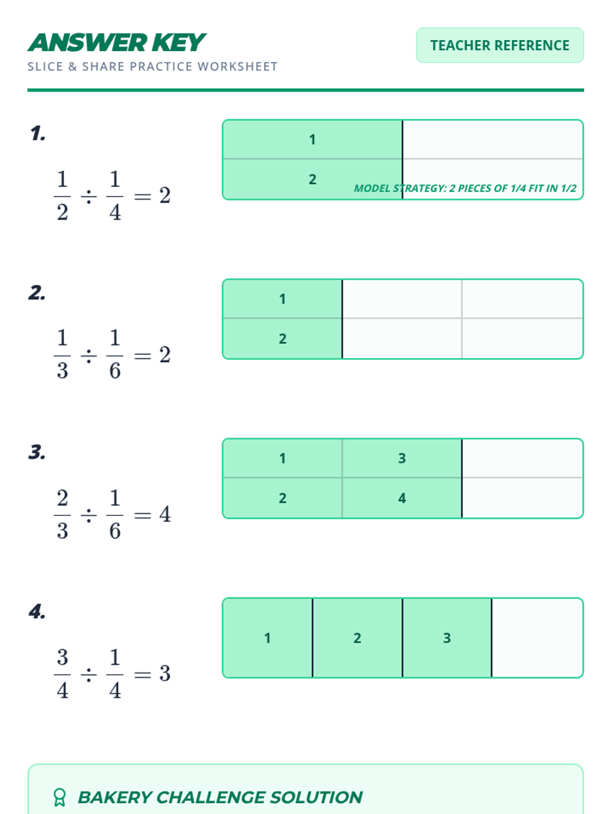 A targeted small-group intervention lesson focusing on dividing fractions using visual area models to build conceptual understanding. Students will 'slice and share' to visualize how many times one fractional part fits into another.
