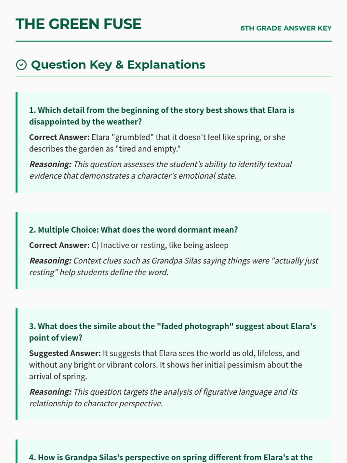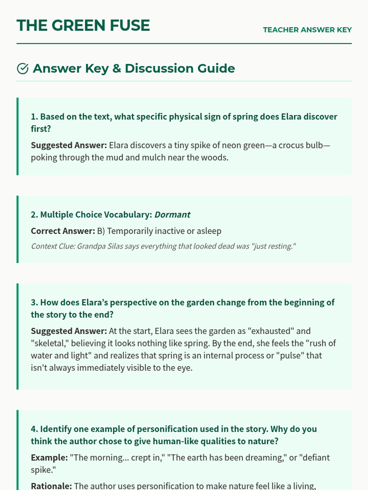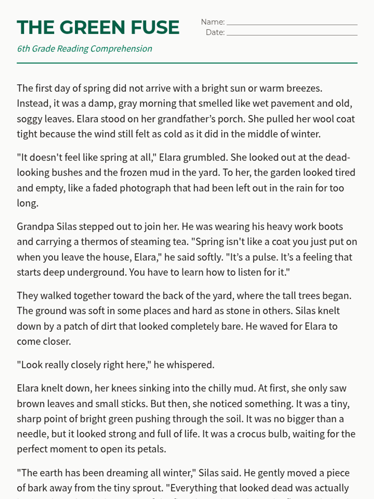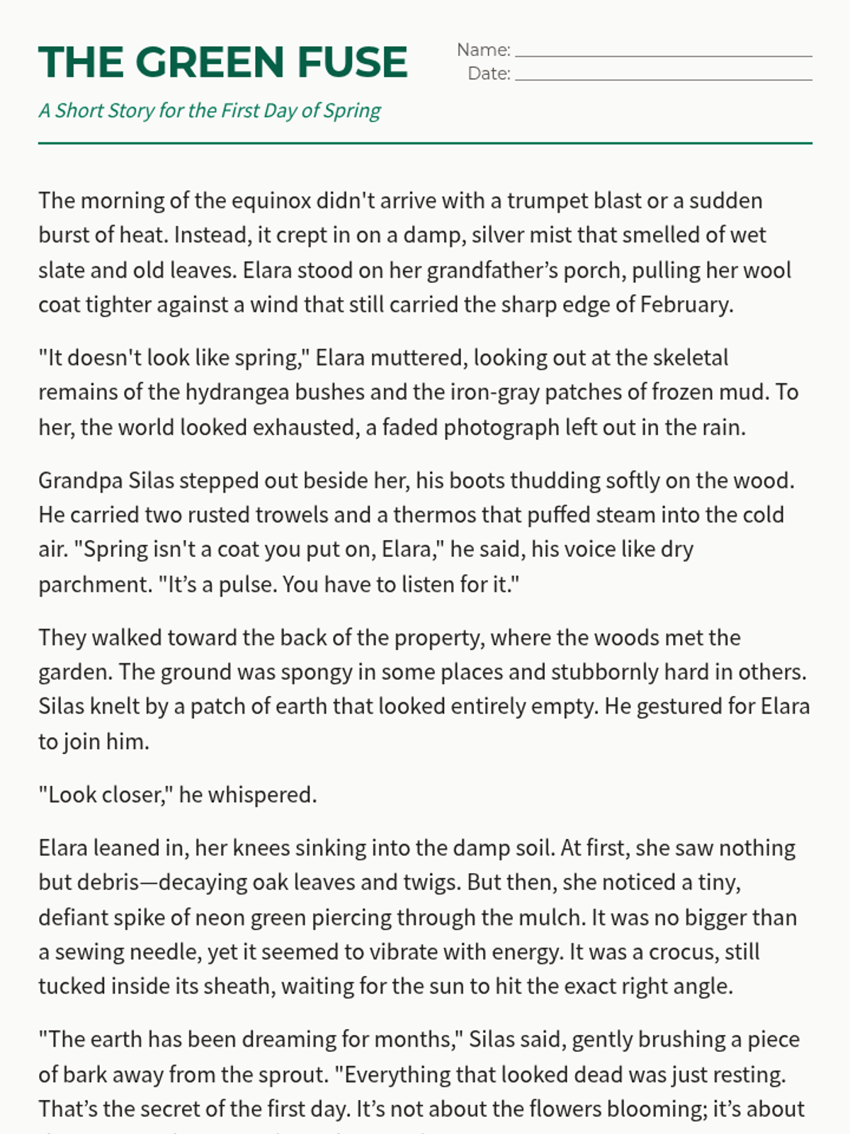 A reading comprehension lesson centered around a short story about the transition into spring, focusing on theme, inference, and descriptive language.