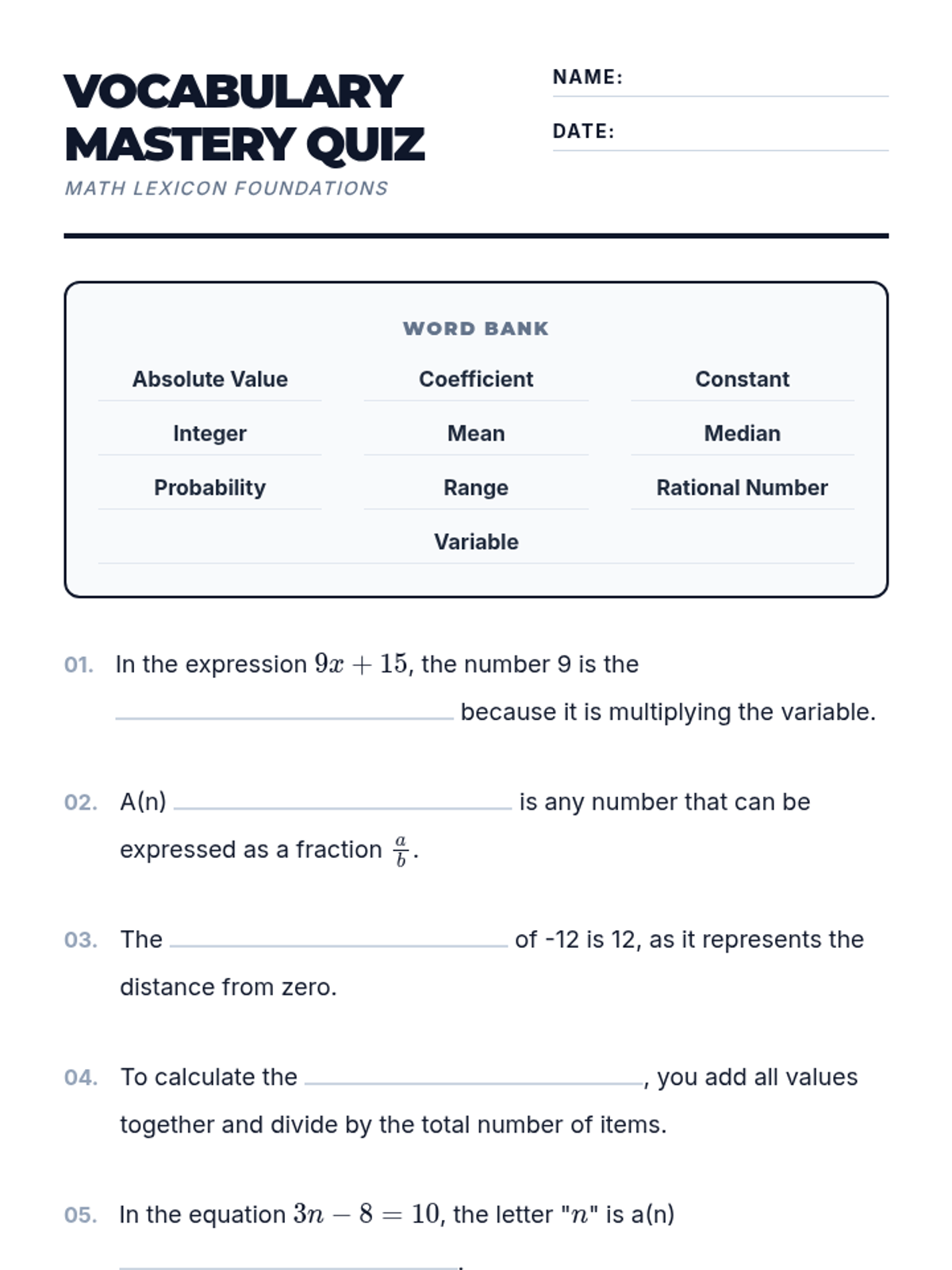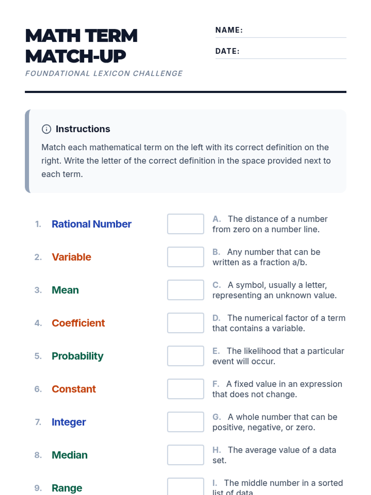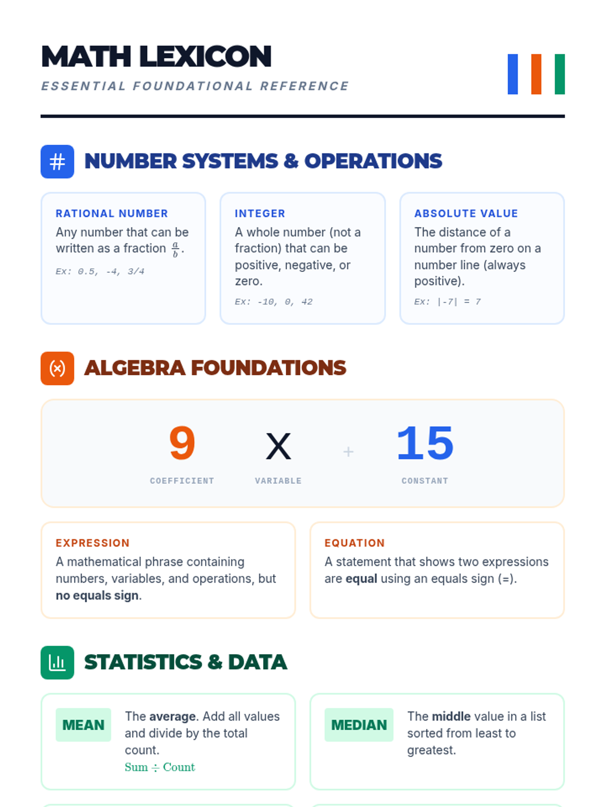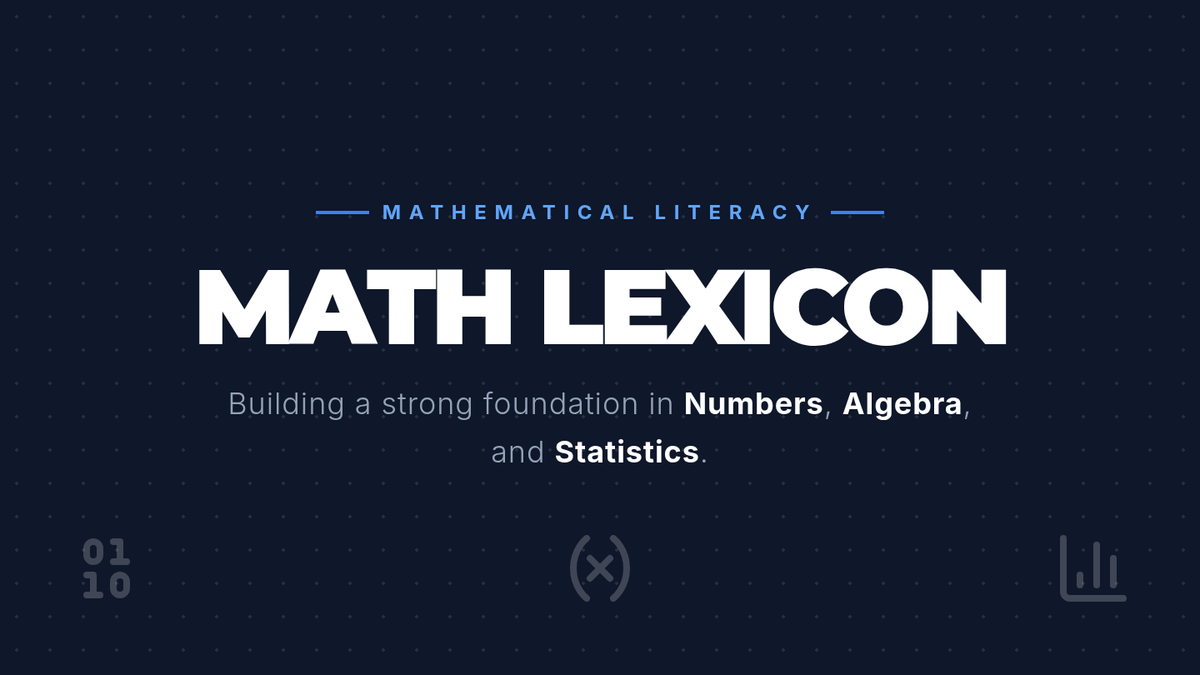 A foundational lesson introducing essential terminology for number systems, basic algebra, and statistics. Includes visual aids and interactive practice materials.