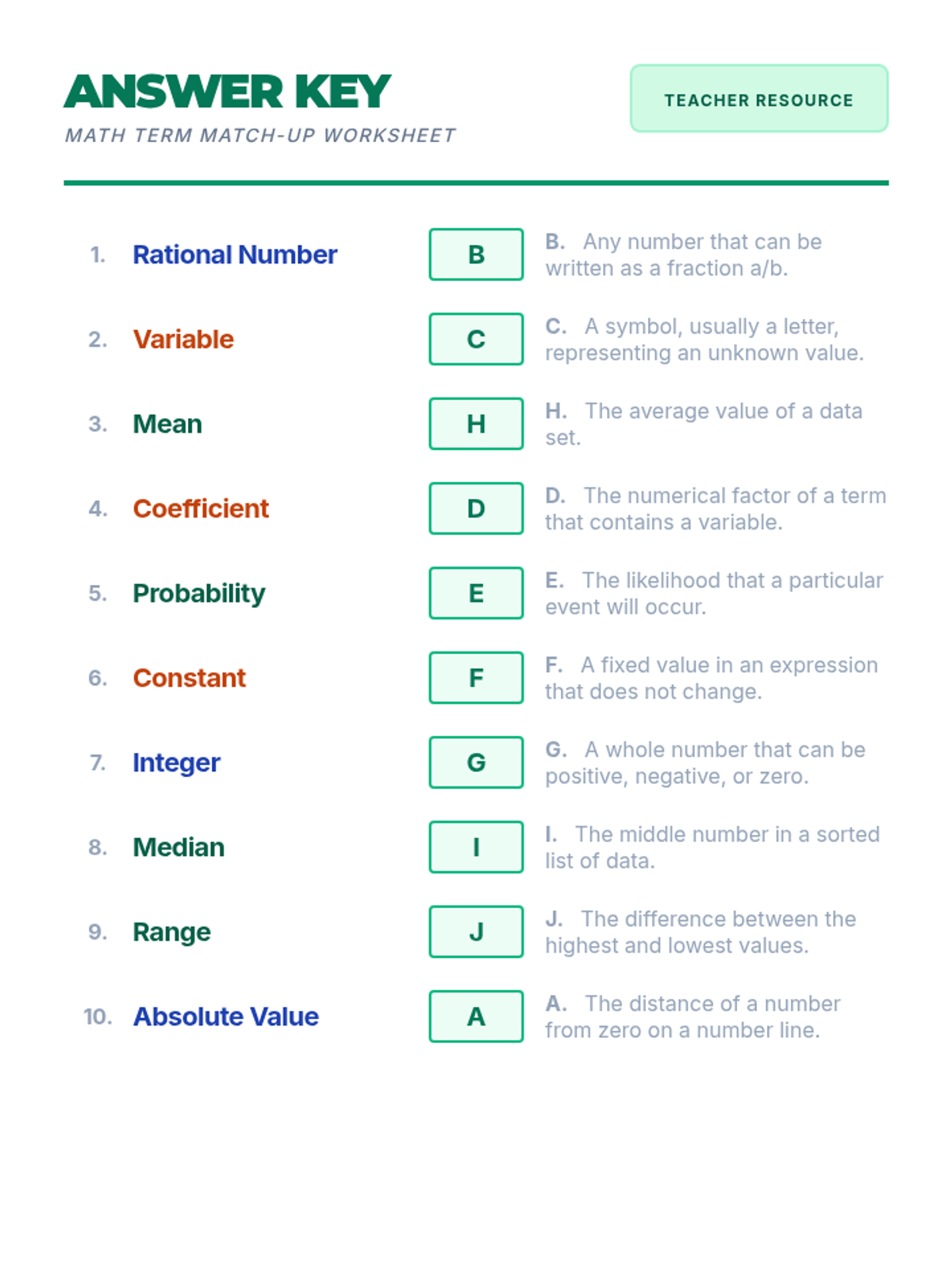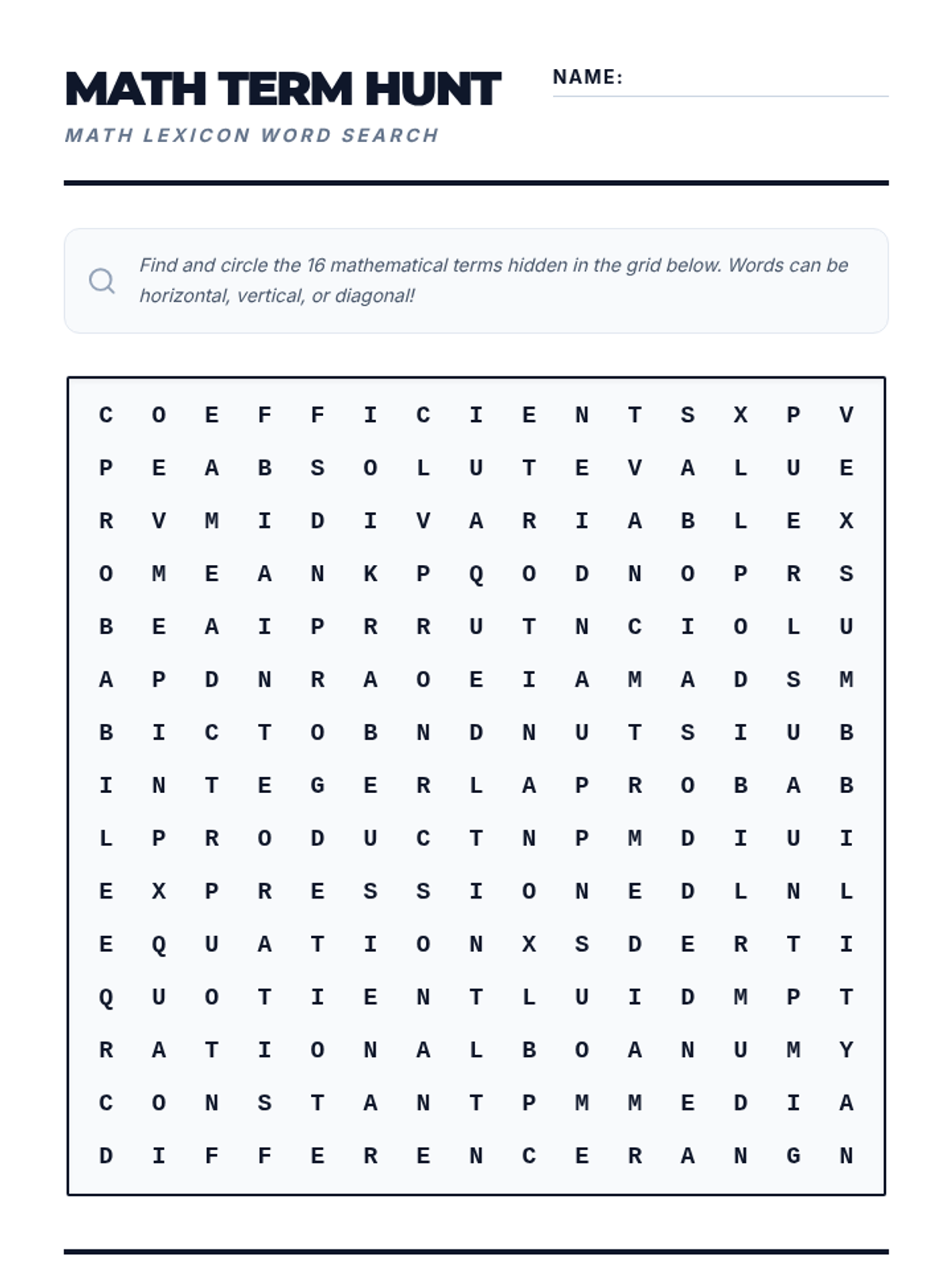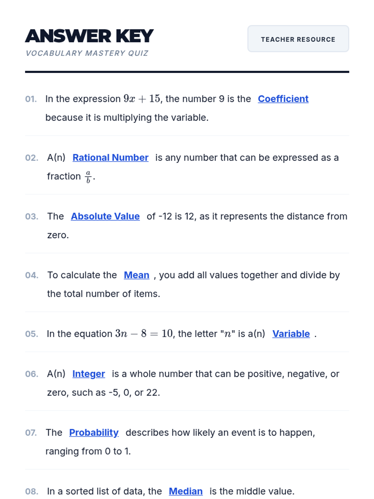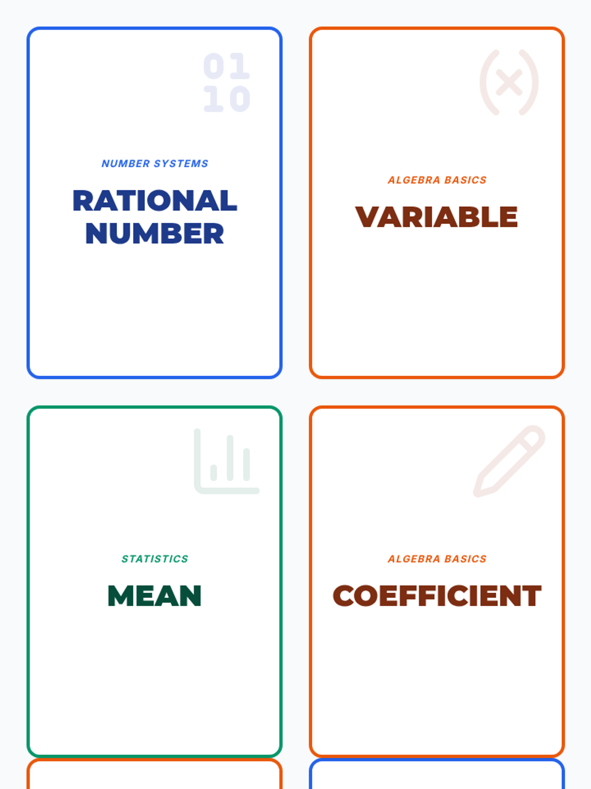A foundational lesson introducing essential terminology for number systems, basic algebra, and statistics. Includes visual aids and interactive practice materials.