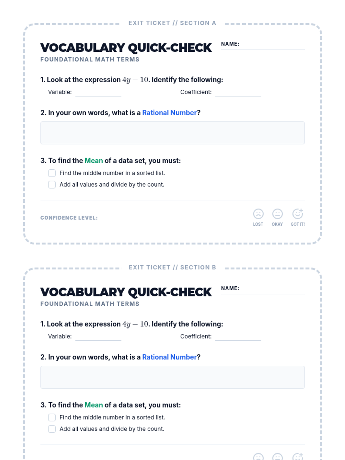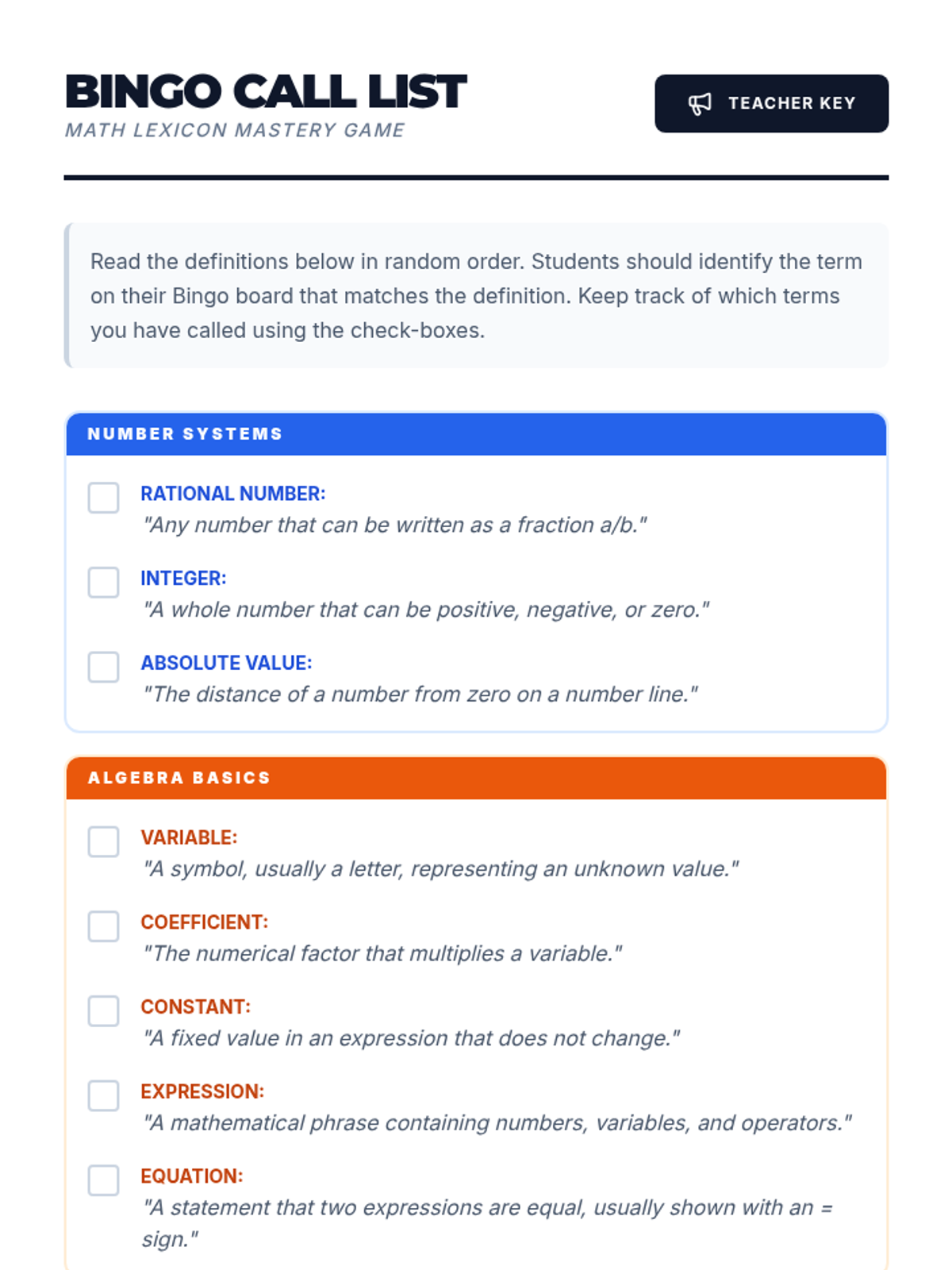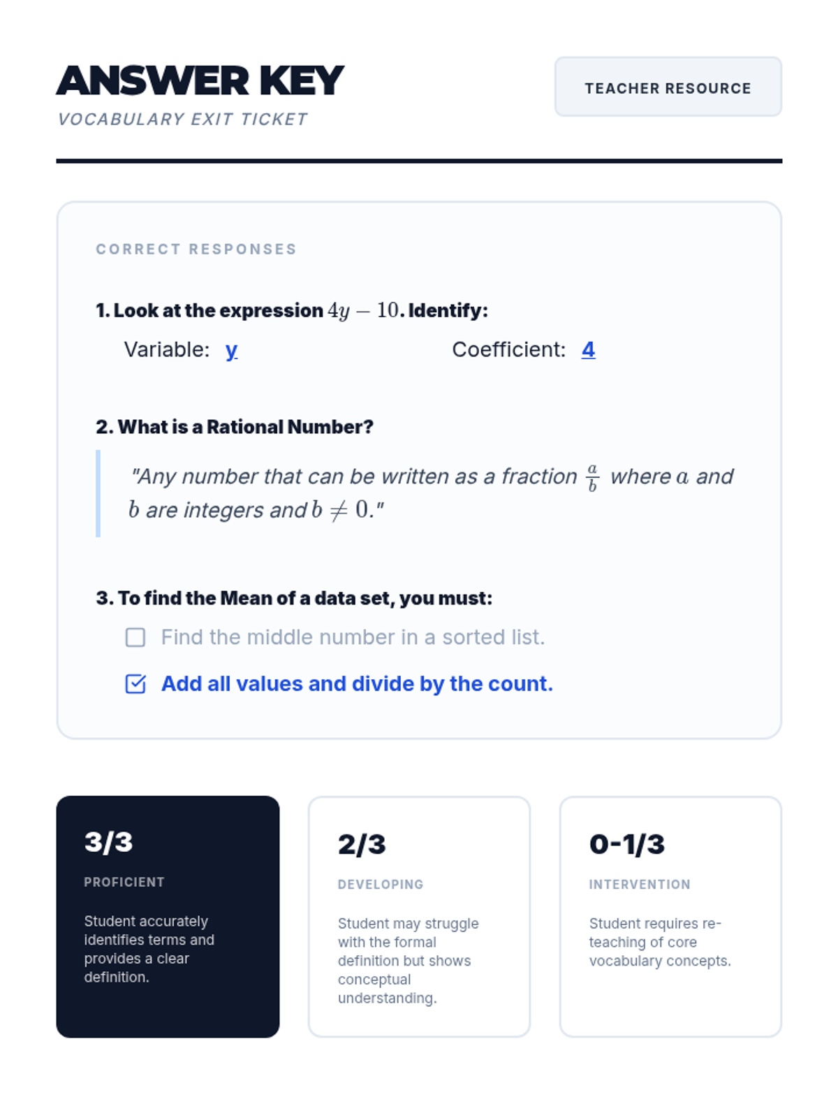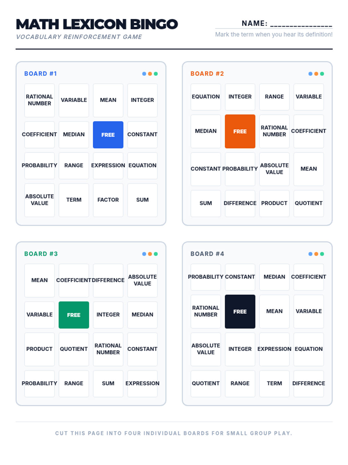 A foundational lesson introducing essential terminology for number systems, basic algebra, and statistics. Includes visual aids and interactive practice materials.